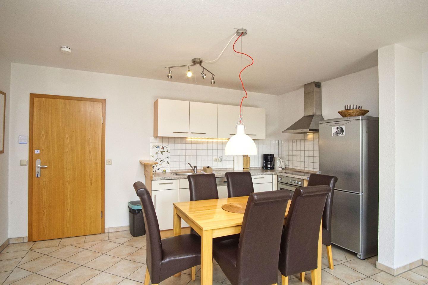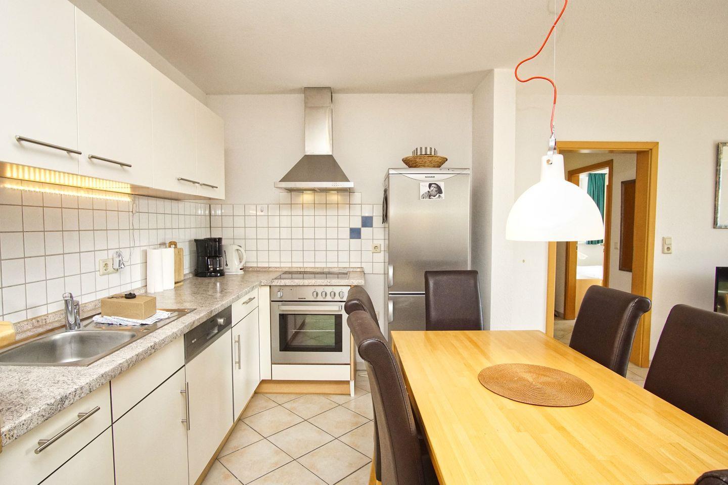 KÜCHE // offene Küche, 4-Platten-Herd, Spülmaschine, Kühlschrank mit Gefrierfach, Backofen, Mikrowelle, Toaster, Wasserkocher, Kaffeemaschine, reichlich Besteck, Geschirr und Küchenutensilien ++