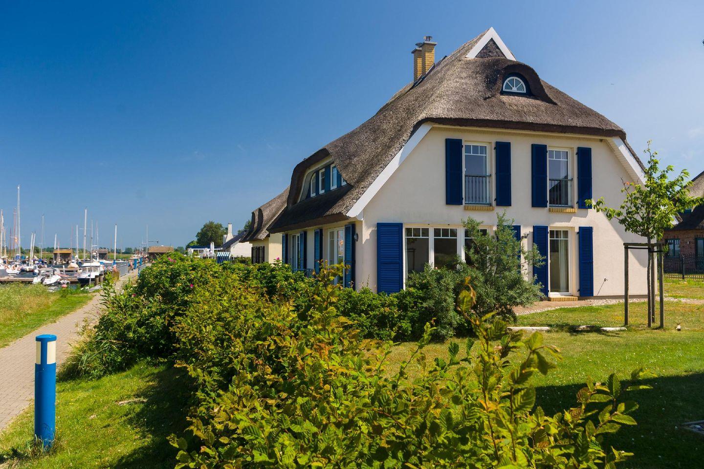 Ferienhaus Boddentraum Morgenrot: Reetdach, Terrasse, Garten und herrlicher Meerblick direkt am Seglerhafen in Gager.