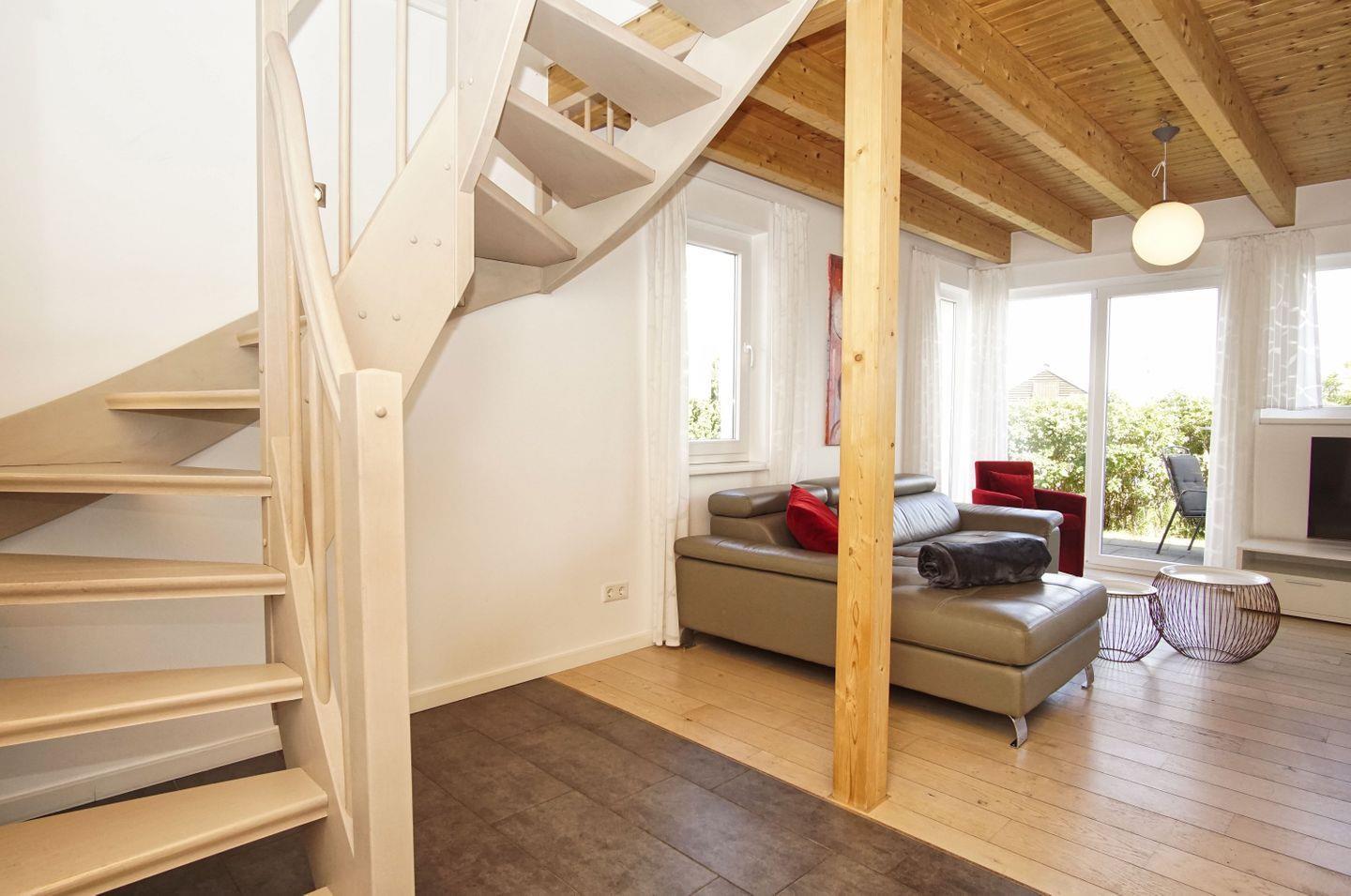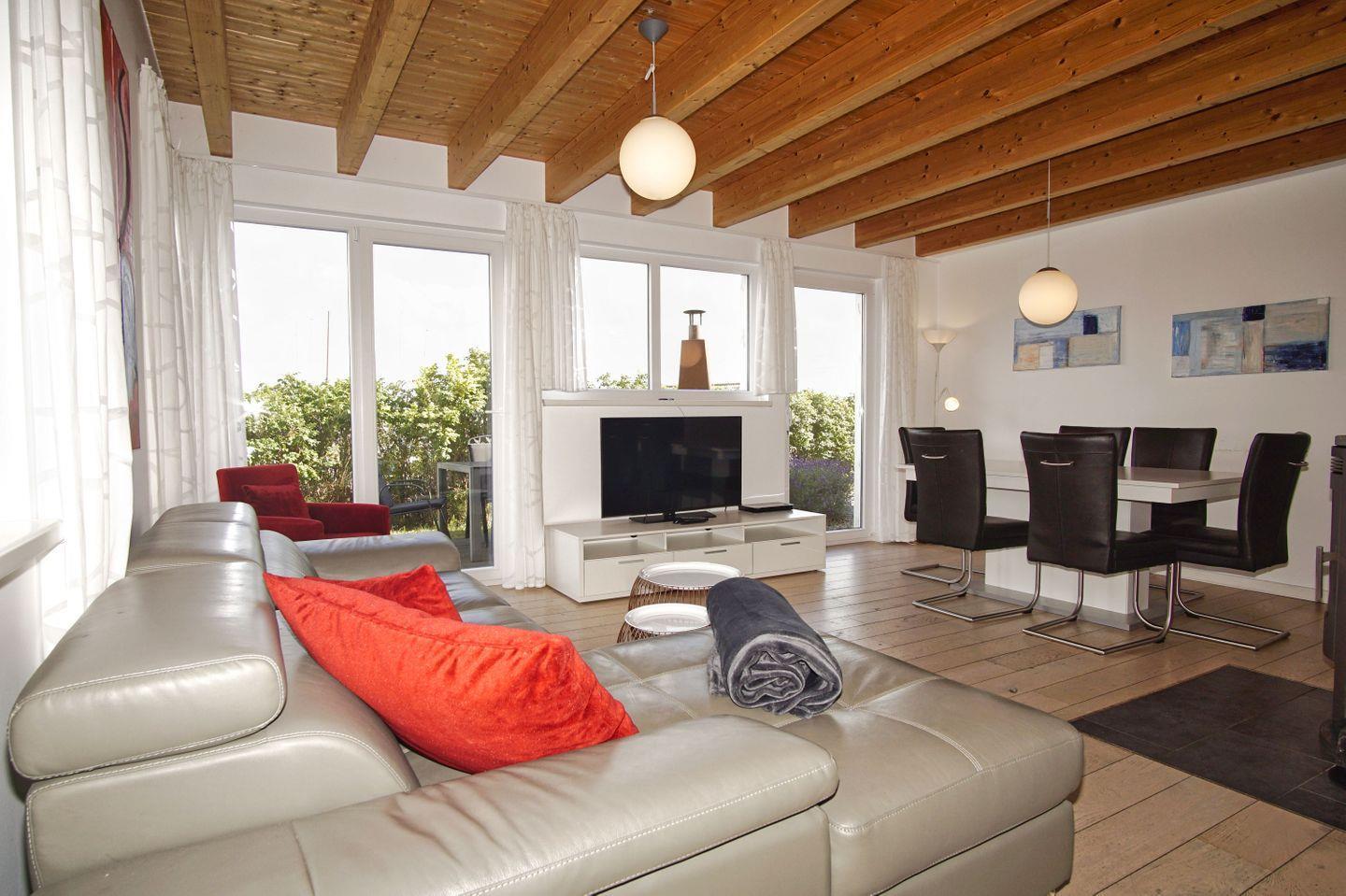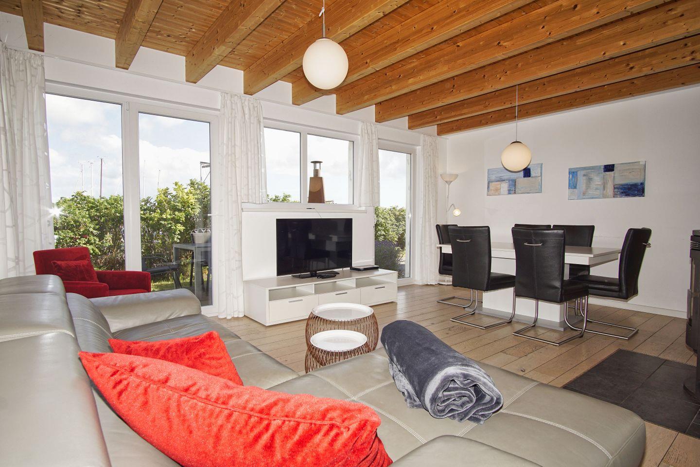 Die Haushälften sind topmodern eingerichtet und komfortabel ausgestattet. Flachbild-TV im Wohnzimmer und in jedem Schlafzimmer, voll ausgestattete Küche, 2 Badezimmer, hauseigene Sauna, Terrasse mit Blick auf den Hafen und die Ostsee und vieles mehr versprechen einen traumhaften Urlaub auf Rügen.