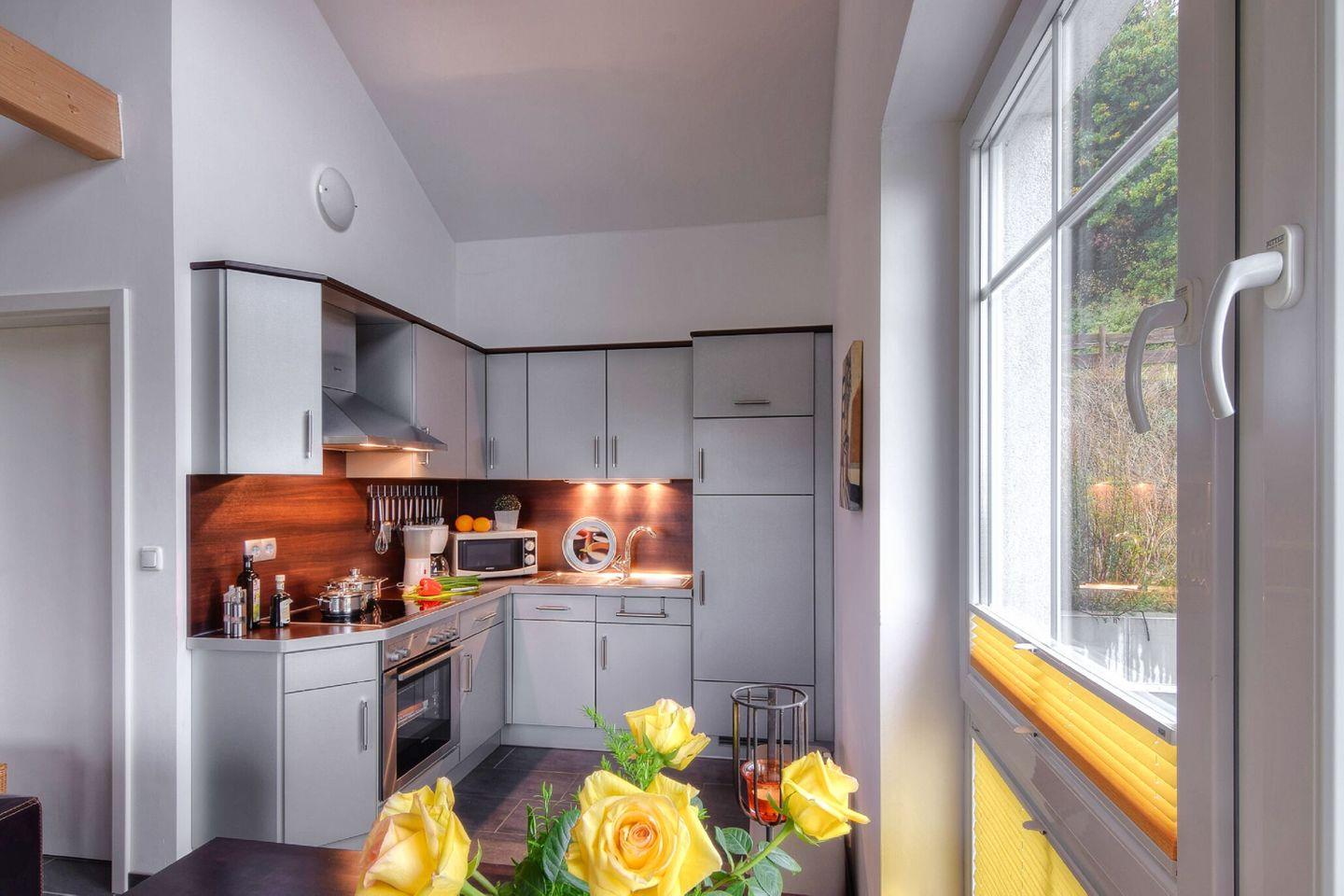 KÜCHE // offene Küche mit Essbereich, 4-Felder Ceranfeld mit Backofen, Kühlschrank mit Gefrierfach, Spülmaschine, Mikrowelle, Toaster, Wasserkocher, Kaffeemaschine, reichlich Besteck, Geschirr und Küchenutensilien ++