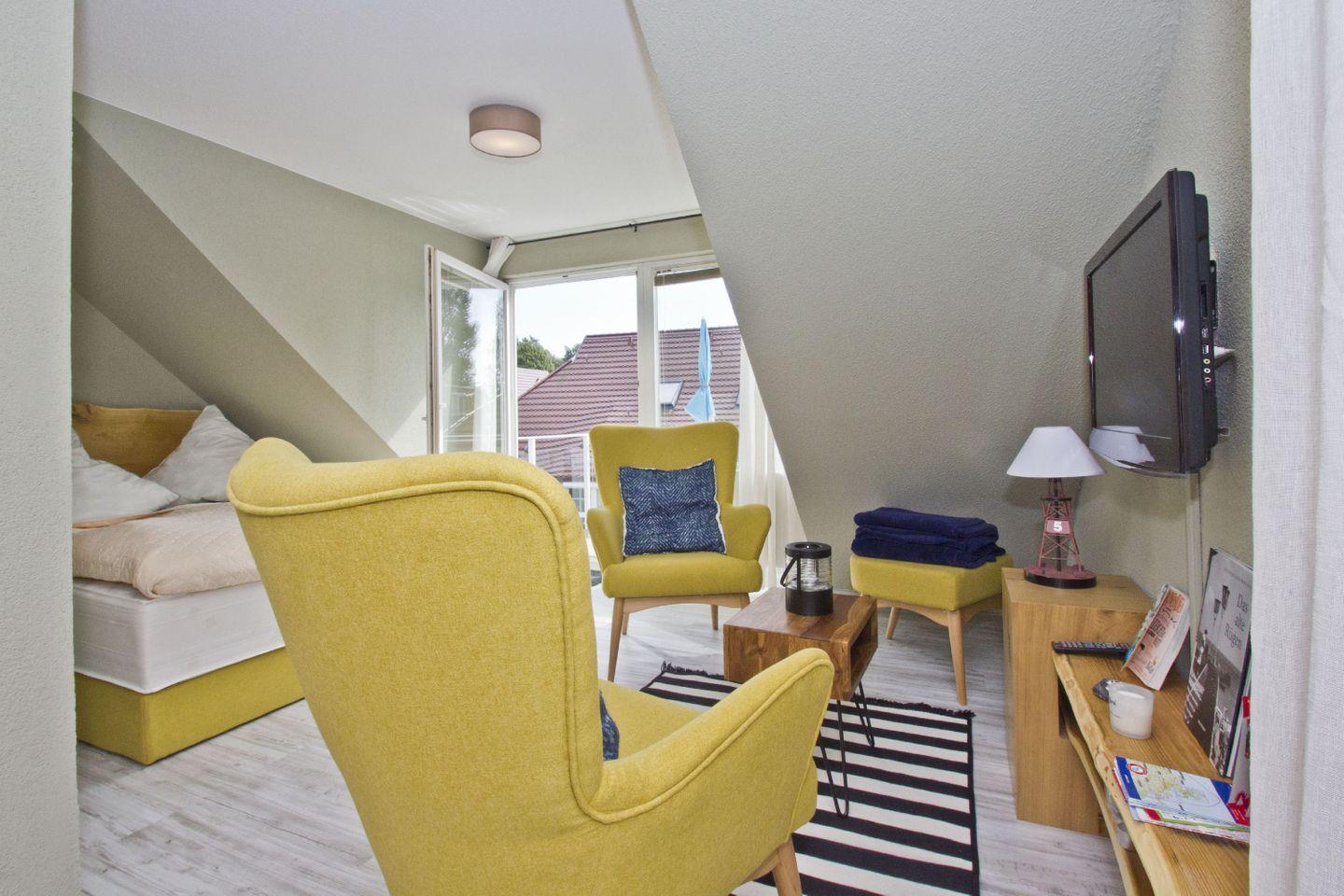 WOHNEN+SCHLAFEN // Wohnraum mit Couch, Kabel-TV, Radio, Zugang zum Balkon & mit bequemem Doppelbett, Kleiderschrank++
