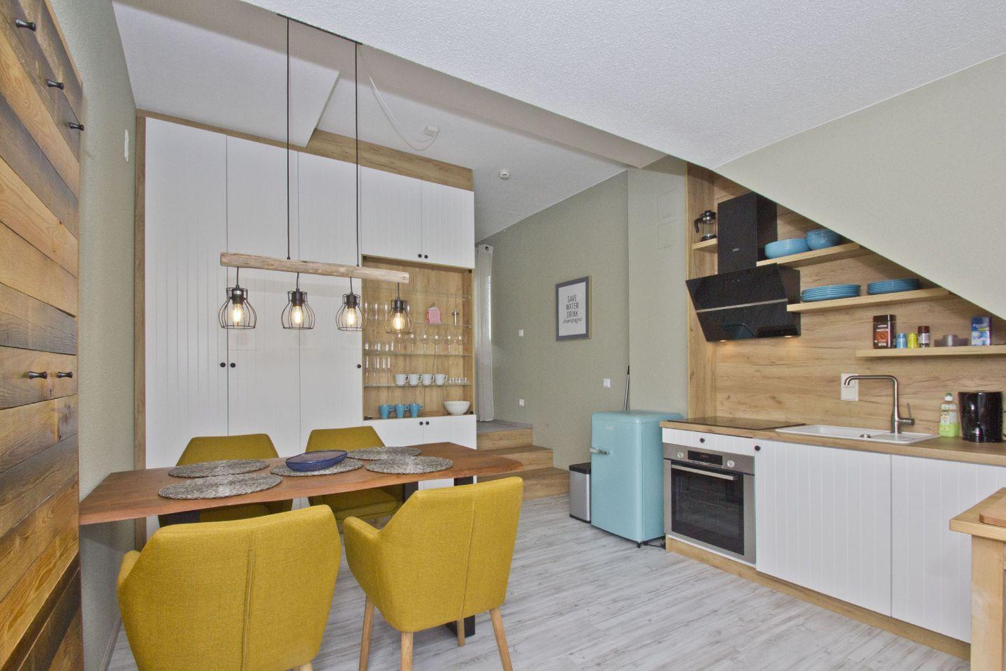 KÜCHE // offene Küche mit Essbereich, 4-Feld Ceranherd, Kühlschrank mit Gefrierfach, Spülmaschine, Toaster, Wasserkocher, Kaffeemaschine, reichlich Besteck, Backofen, Geschirr und Küchenutensilien, Zugang zum Balkon ++
