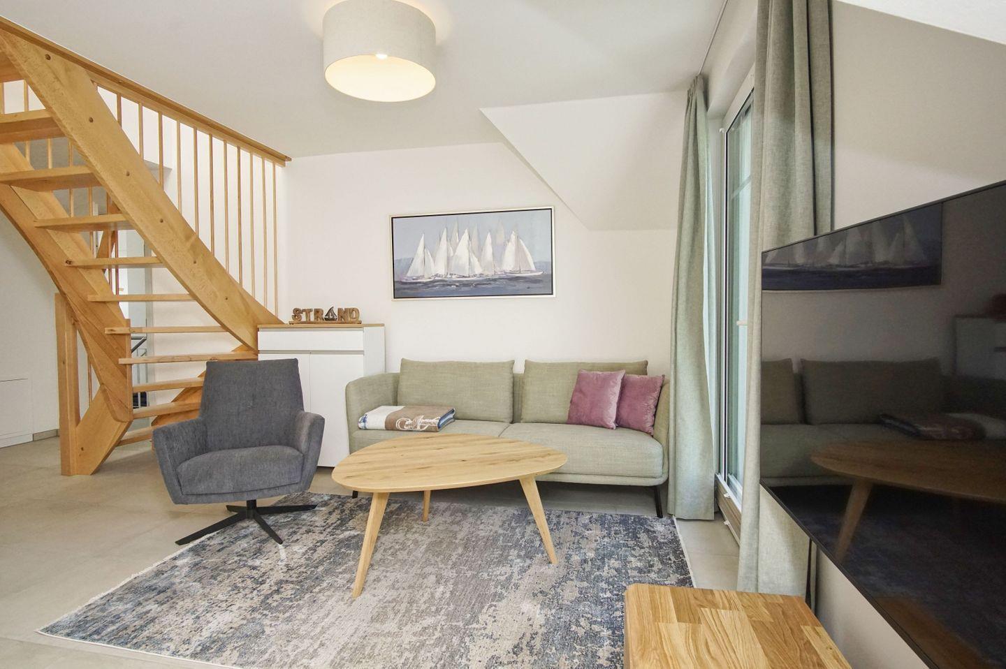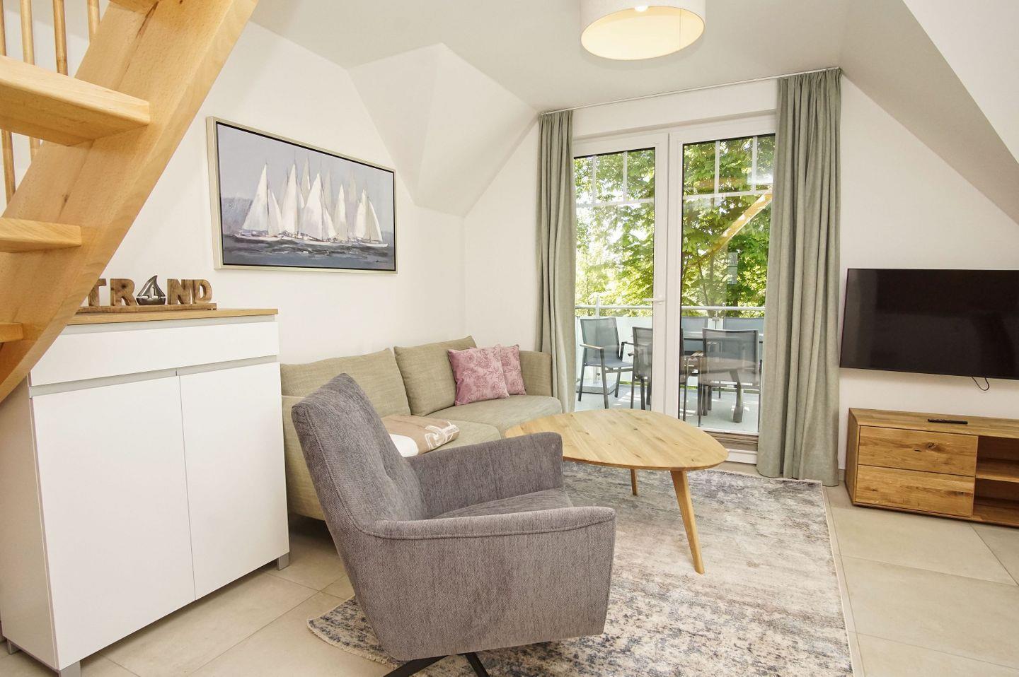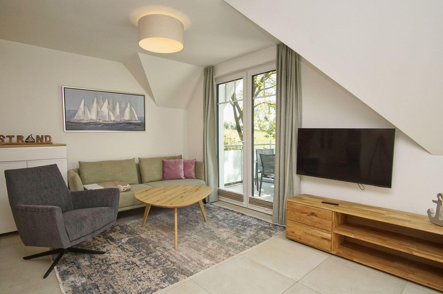 Moderne strandnahe Ferienwohnung mit Balkon und kostenfreiem Zugang zu Schwimmbad und Sauna.