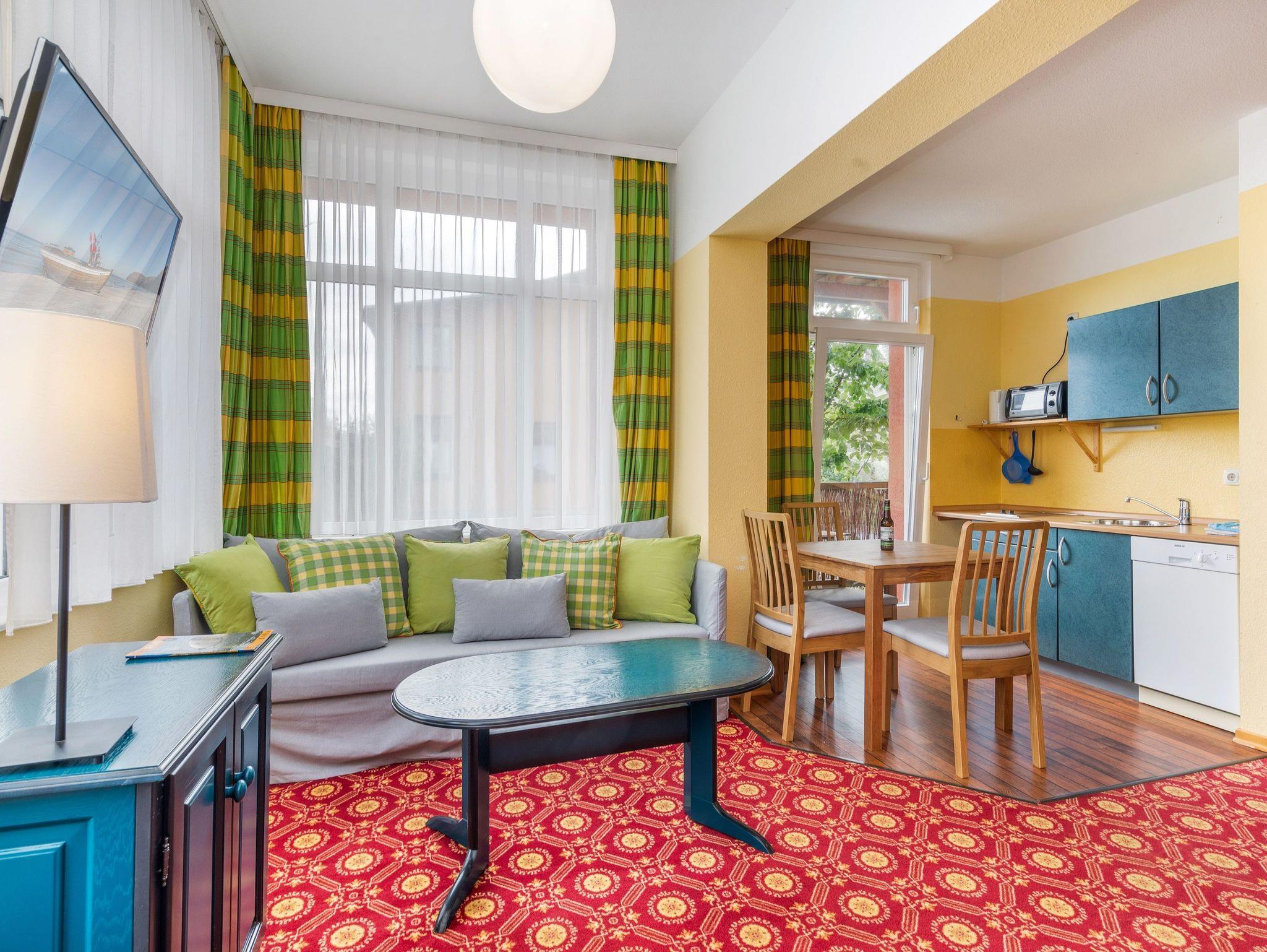 Im kombinierten Wohn-/Schlafraum befinden sich ein bequemes Doppelbett mit Nachttischen und Leselampen sowie ein Kleiderschrank, eine Schlafcouch mit Tisch und ein TV-Gerät. Hier steht auch ein Esstisch mit Stühlen.