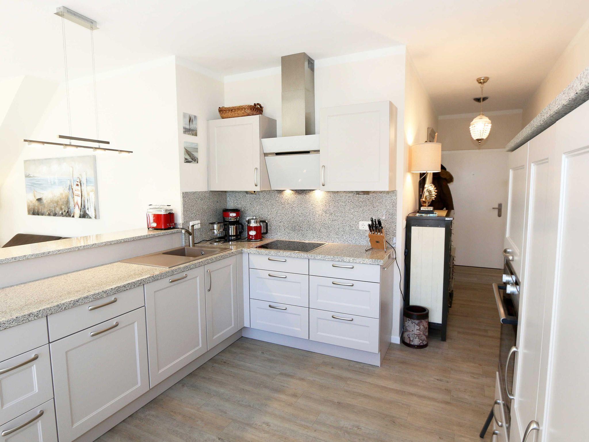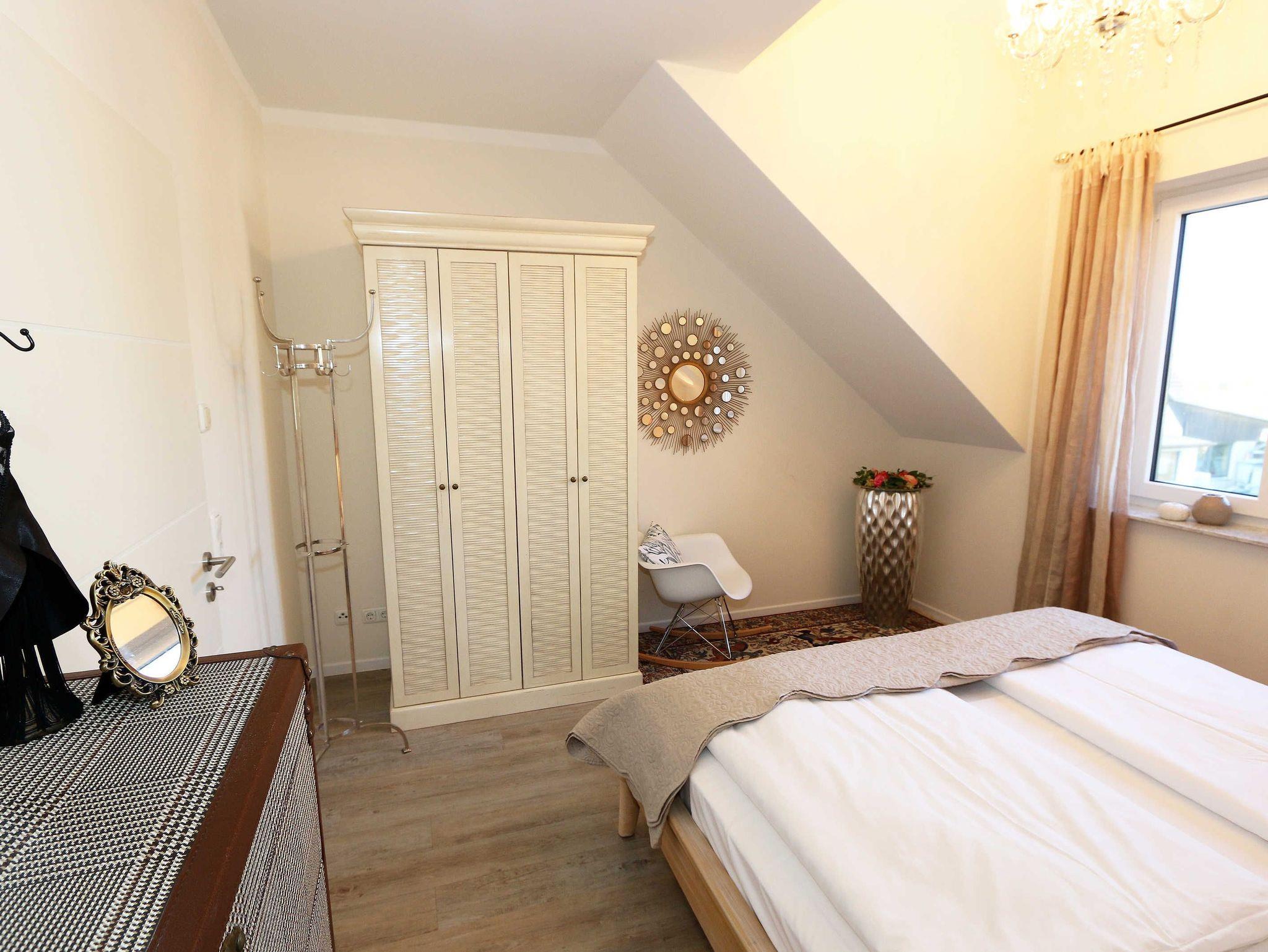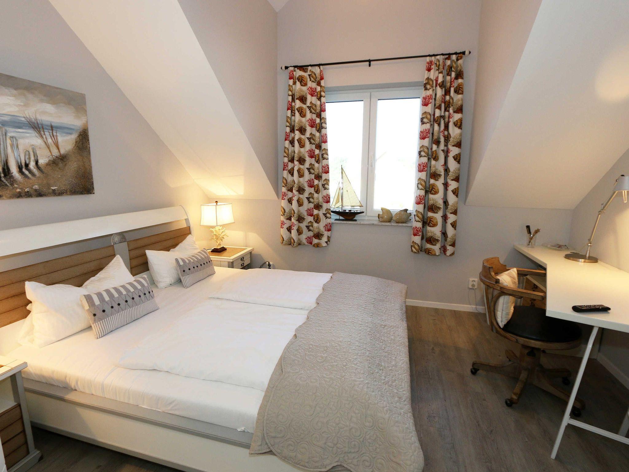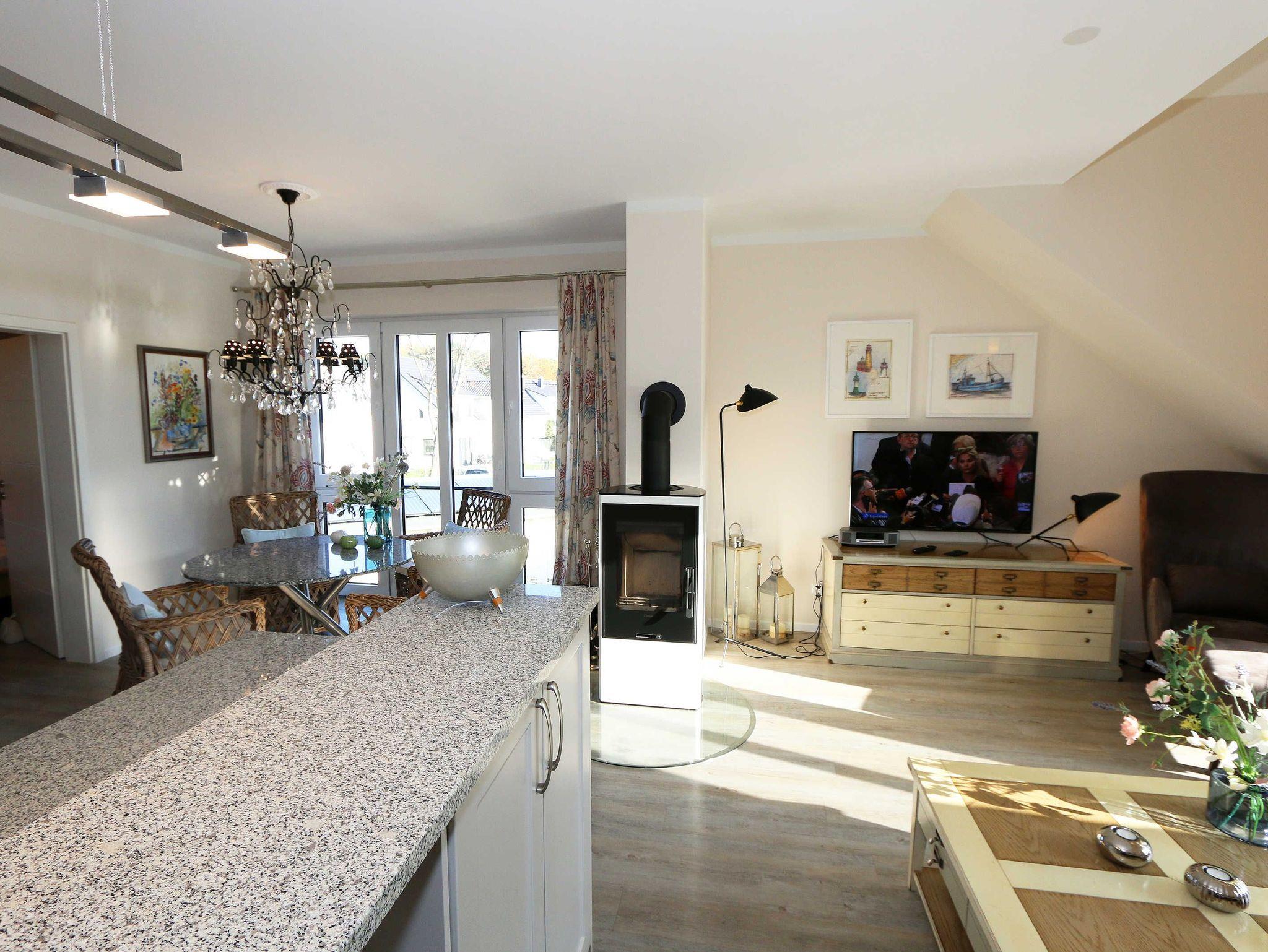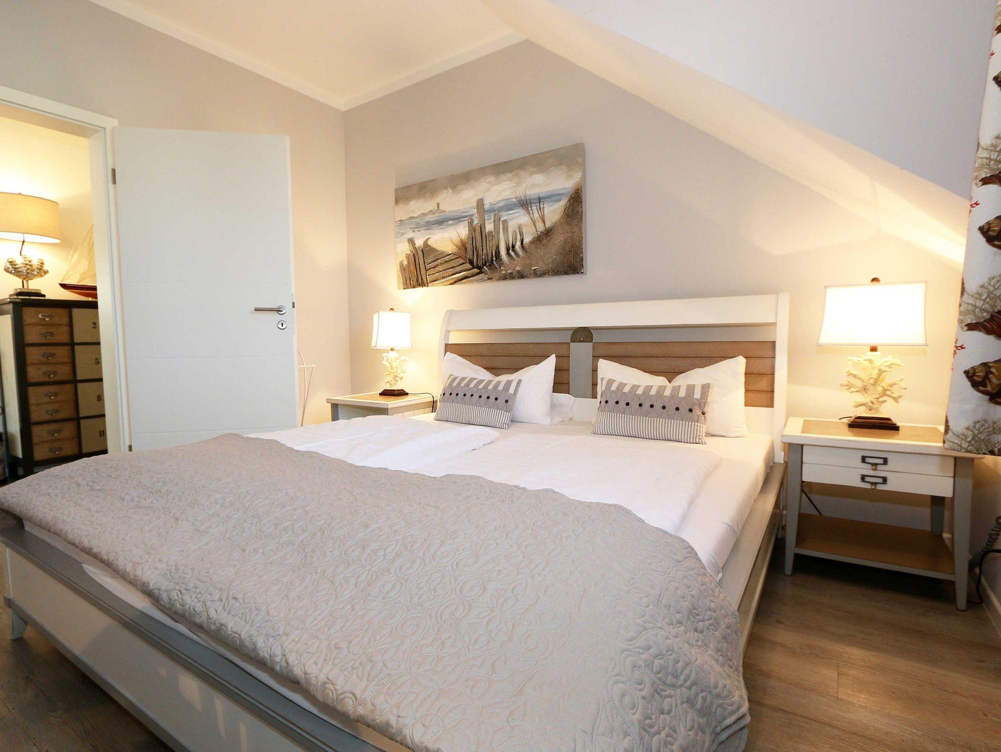 Die ca. 81m² große Ferienwohnung befindet sich im Dachgeschoss (1.OG) des Appartementhauses Sterntaucher. Die Nichtraucherwohnung wurde mit hochwertigen Massivholzmöbeln ausgestattet und bietet Ihnen ausreichend Platz für max. 2 bis 4 Erwachsene + 1 Kleinkind bis 3 Jahre im Kinderreisebett. Im Flur finden Sie eine maritime Garderobe mit einem Schuhschrank, einer Sitzbank, ein Highboard sowie einen Ganzkörperspiegel. Die gemütliche Sitzecke im Wohnbereich besteht aus einer bequemen Ledercouch, einem Ledersessel, einen Ohrensessel mit Hocker sowie einem Couchtisch. Ein Sideboard, ein Smart-TV mit Blu Ray-Player, ein Bose-Radio mit CD-Player, eine kleine CD-Auswahl, diverse Spiele, Bücher und Zeitschriften runden den Bereich ab. Auch auf einen Internetanschluss (WLAN) brauchen Sie im Urlaub nicht verzichten, dieser steht Ihnen inklusive zu Ihrer Verfügung. Eine angenehme und wohlige Wohnatmosphäre wird zusätzlich durch einen Kaminofen und verschiedene Lichtquellen geschaffen. Vom Wohnbereich gelangen Sie auf den überdachten und bestuhlten Süd-Balkon. Für die Gemütlichkeit sorgen ein zusätzlicher Strandkorb sowie ein Sonnenschirm. Innerhalb des offenen Wohn- und Essbereiches befindet sich die komfortable Einbau-Küche mit Granitarbeitsflächen, einem Induktionskochfeld mit Abzugshaube, einem Backofen, einer Mikrowelle, einem Geschirrspüler, einer Keramik-Spüle, einem Kühl- und Gefrierschrank, einem Toaster, einem Wasserkocher, einer Kaffeemaschine mit Thermoskanne, einer Lavazza - Espressomaschine sowie einem Milchaufschäumer, einem Mixer, einem Handrührgerät und weitere Küchenutensilien. Angrenzend befindet sich der Essplatz mit einem runden Granittisch und Korbstühlen. Das erste Schlafzimmer ist mit einem Doppelbett aus Korbgeflecht (1,80 m x 2,00 m), Nachttischablagen mit Tischleuchten, einem Kleiderschrank, einem Kleiderständer, einer Koffer-Kommode und einem kleinen Schaukelstuhl ausgestattet. Das zweite Schlafzimmer, welches im maritimen Stil ausgestattet ist, verfügt über ein Doppelbett (1,80 m x 2,00 m), Nachttischablagen mit Tischleuchten, einen Kleiderschrank und einen Schreibtisch. Abgerundet wird dieses Schlafzimmer mit einem zusätzlichen Flachbild-TV. Beide Schlafzimmer können mit Lammellenfensterläden verdunkelt werden. Im Tageslichtbad gibt es eine großzügige und ebenerdige Dusche mit Glastür, einen Waschtisch mit Einbau-Unterschrank, einen Spiegel, einen Fön, DAB-Radio, einen Vergrößerungsspiegel, einen Handtuchständer, ein WC, einen beheizbaren Handtuchtrockner sowie eine Waschmaschine und einen Trockner. Für unsere ganz kleinen Gäste dient eine Arbeitsplatte als Wickeltisch. Innerhalb des Bades befindet sich der Hauswirtschaftsraum. Hier finden Sie einen Wäscheständer, ein Bügeleisen mit Bügelbrett, einen Staubsauger, einen Hochstuhl, ein Kinderreisebett, Kinderbadewanne, Wickelunterlage, Kinder WC-Aufsatz sowie Reinigungsutensilien. Alle Böden, bis auf das Bad mit Fliesen, sind in der Wohnung mit Vinyldielen ausgestattet. Im Wohnbereich sowie in beiden Schlafzimmern befinden sich zusätzlich Insektenschutzgitter. Haustiere sind nicht erlaubt. Einen PKW-Stellplatz (Nr. 05) finden Sie direkt am Haus sowie einen Schuppen (Nr. 05), in dem Sie zwei Fahrräder unterstellen können. Zusätzlich können Sie hier auch Ihre E-Bikes aufladen. Die Erstausstattung eines Wäschepaketes (komplette Bettwäsche, 1 Duschhandtuch, 2 kleine Handtücher) können Sie bis 14 Tage vor Anreise gegen einen Aufpreis dazu buchen oder durch eigene ergänzen. Ab 2 gebuchten Paketen erhalten Sie einmalig 1 Geschirrhandtuch und 1 Duschvorleger hinzu.
