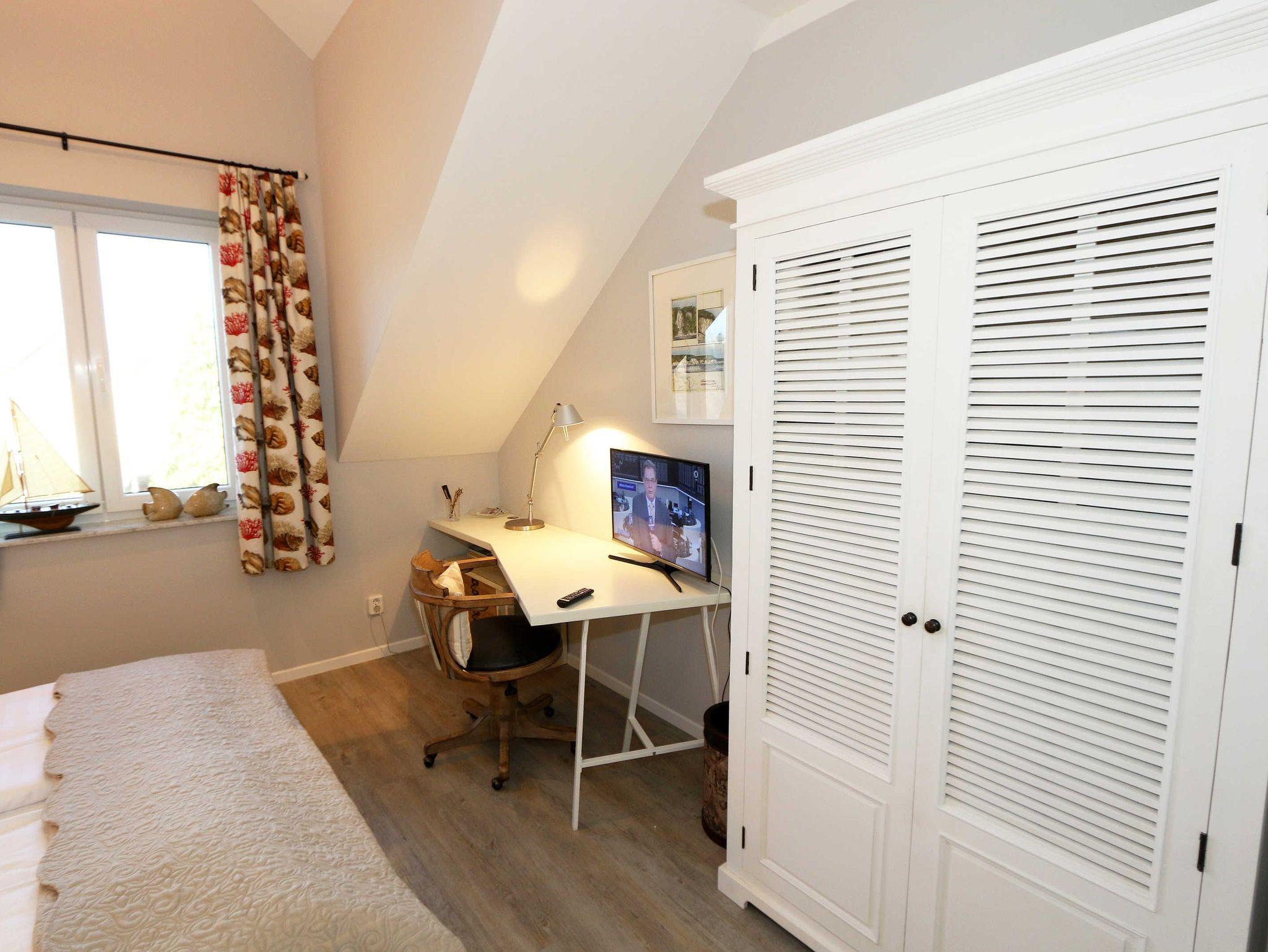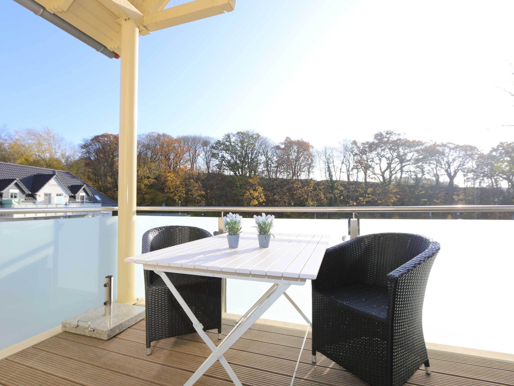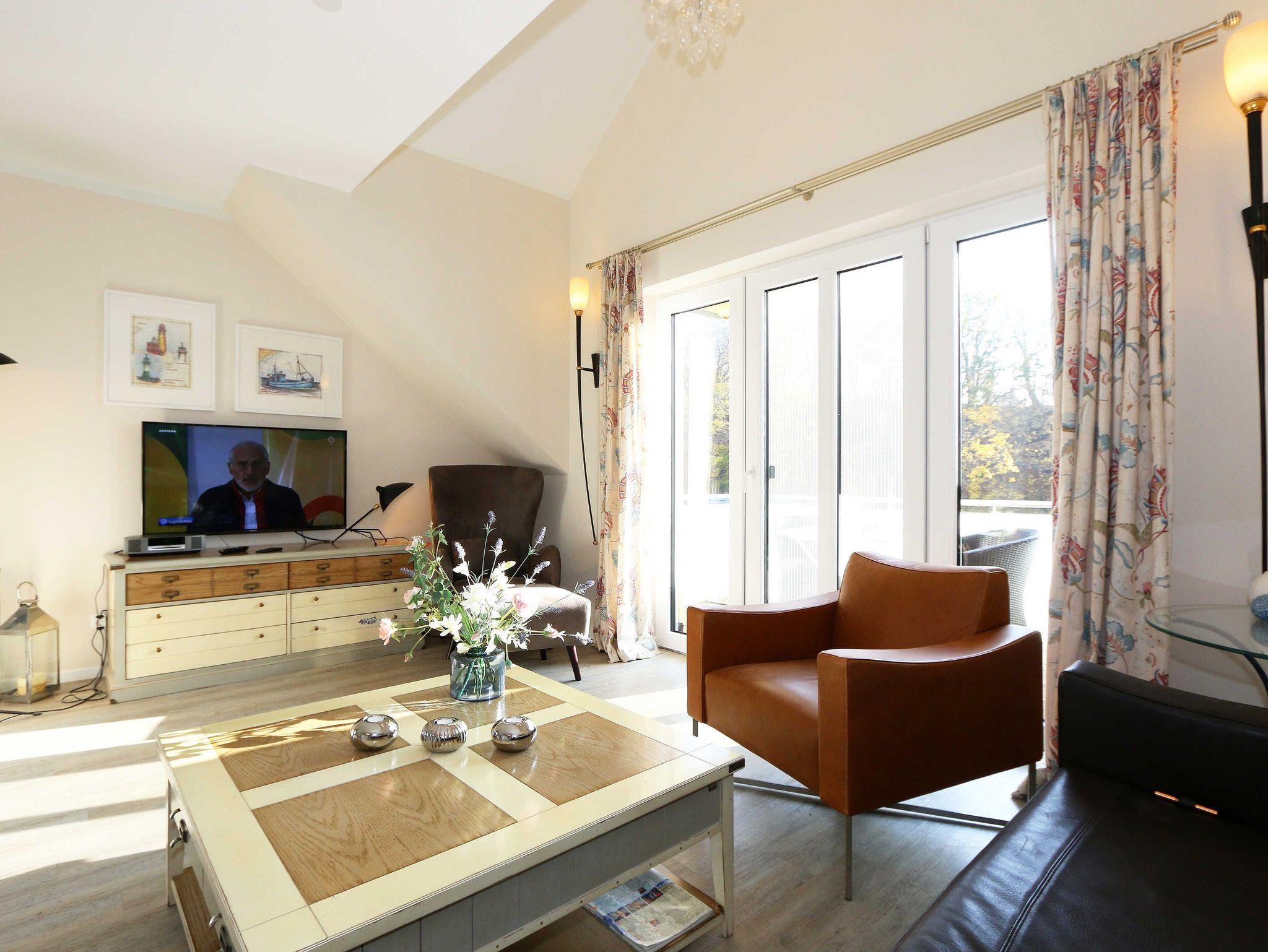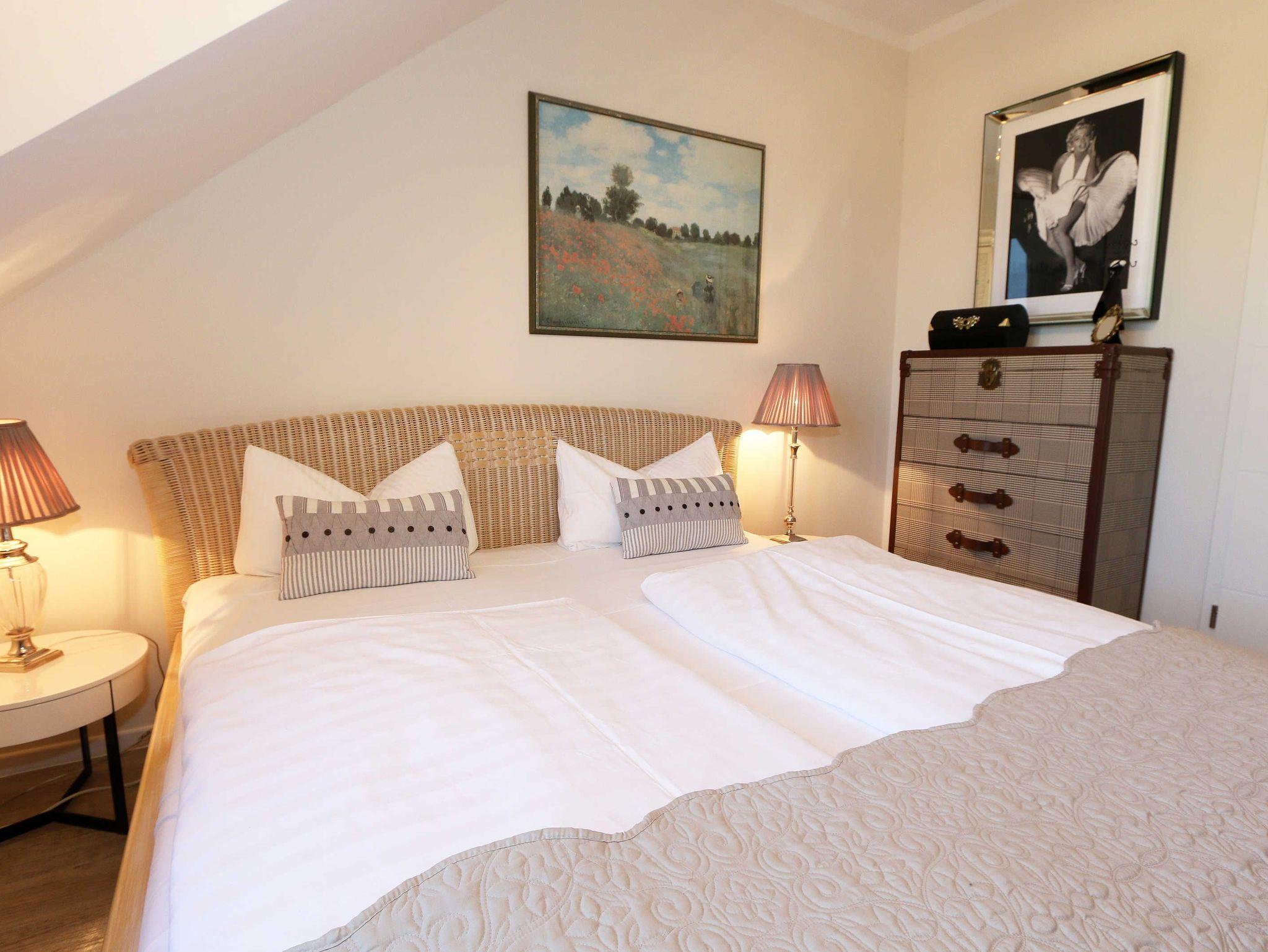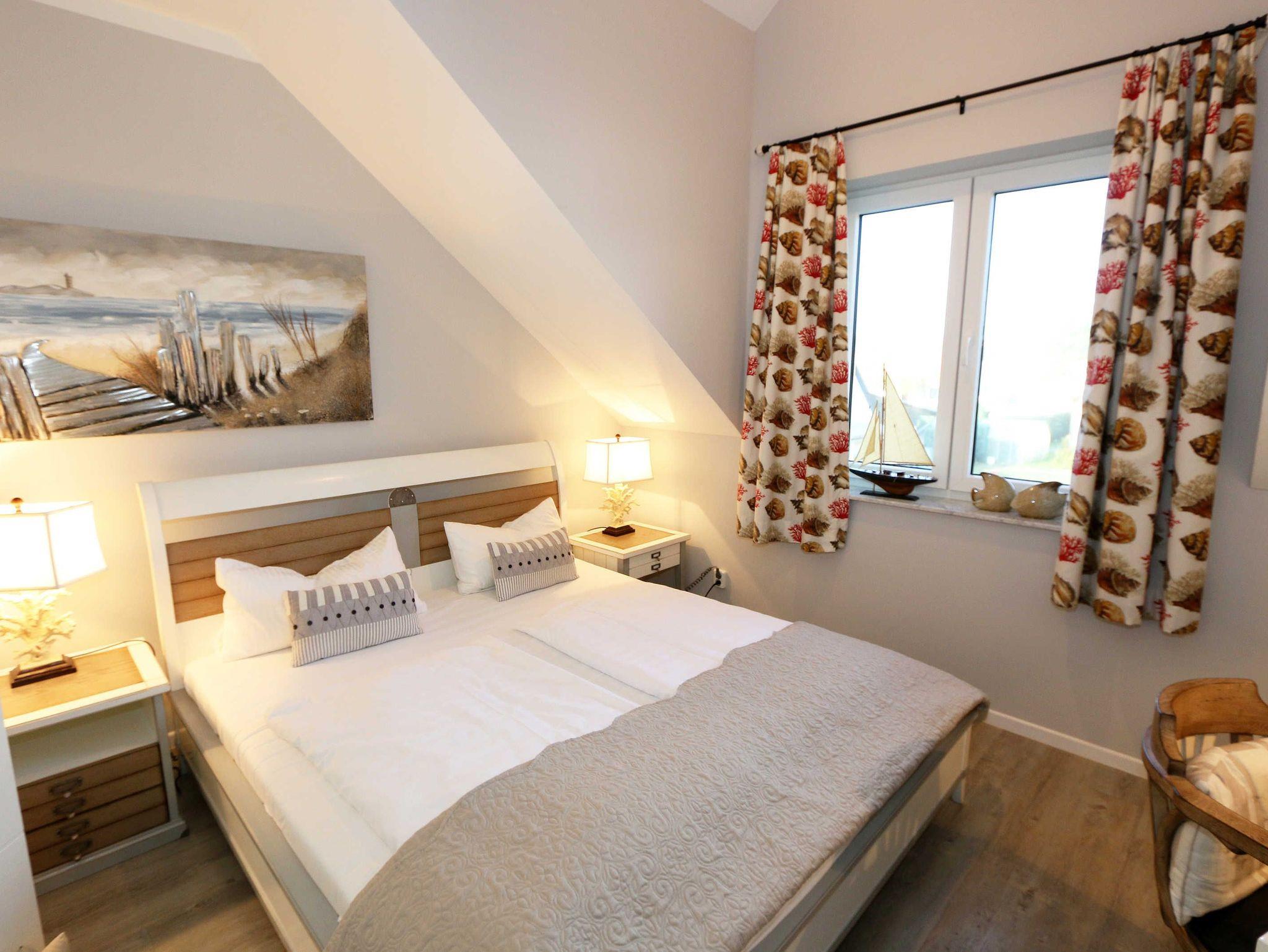 Die ca. 81m² große Ferienwohnung befindet sich im Dachgeschoss (1.OG) des Appartementhauses Sterntaucher. Die Nichtraucherwohnung wurde mit hochwertigen Massivholzmöbeln ausgestattet und bietet Ihnen ausreichend Platz für max. 2 bis 4 Erwachsene + 1 Kleinkind bis 3 Jahre im Kinderreisebett. Im Flur finden Sie eine maritime Garderobe mit einem Schuhschrank, einer Sitzbank, ein Highboard sowie einen Ganzkörperspiegel. Die gemütliche Sitzecke im Wohnbereich besteht aus einer bequemen Ledercouch, einem Ledersessel, einen Ohrensessel mit Hocker sowie einem Couchtisch. Ein Sideboard, ein Smart-TV mit Blu Ray-Player, ein Bose-Radio mit CD-Player, eine kleine CD-Auswahl, diverse Spiele, Bücher und Zeitschriften runden den Bereich ab. Auch auf einen Internetanschluss (WLAN) brauchen Sie im Urlaub nicht verzichten, dieser steht Ihnen inklusive zu Ihrer Verfügung. Eine angenehme und wohlige Wohnatmosphäre wird zusätzlich durch einen Kaminofen und verschiedene Lichtquellen geschaffen. Vom Wohnbereich gelangen Sie auf den überdachten und bestuhlten Süd-Balkon. Für die Gemütlichkeit sorgen ein zusätzlicher Strandkorb sowie ein Sonnenschirm. Innerhalb des offenen Wohn- und Essbereiches befindet sich die komfortable Einbau-Küche mit Granitarbeitsflächen, einem Induktionskochfeld mit Abzugshaube, einem Backofen, einer Mikrowelle, einem Geschirrspüler, einer Keramik-Spüle, einem Kühl- und Gefrierschrank, einem Toaster, einem Wasserkocher, einer Kaffeemaschine mit Thermoskanne, einer Lavazza - Espressomaschine sowie einem Milchaufschäumer, einem Mixer, einem Handrührgerät und weitere Küchenutensilien. Angrenzend befindet sich der Essplatz mit einem runden Granittisch und Korbstühlen. Das erste Schlafzimmer ist mit einem Doppelbett aus Korbgeflecht (1,80 m x 2,00 m), Nachttischablagen mit Tischleuchten, einem Kleiderschrank, einem Kleiderständer, einer Koffer-Kommode und einem kleinen Schaukelstuhl ausgestattet. Das zweite Schlafzimmer, welches im maritimen Stil ausgestattet ist, verfügt über ein Doppelbett (1,80 m x 2,00 m), Nachttischablagen mit Tischleuchten, einen Kleiderschrank und einen Schreibtisch. Abgerundet wird dieses Schlafzimmer mit einem zusätzlichen Flachbild-TV. Beide Schlafzimmer können mit Lammellenfensterläden verdunkelt werden. Im Tageslichtbad gibt es eine großzügige und ebenerdige Dusche mit Glastür, einen Waschtisch mit Einbau-Unterschrank, einen Spiegel, einen Fön, DAB-Radio, einen Vergrößerungsspiegel, einen Handtuchständer, ein WC, einen beheizbaren Handtuchtrockner sowie eine Waschmaschine und einen Trockner. Für unsere ganz kleinen Gäste dient eine Arbeitsplatte als Wickeltisch. Innerhalb des Bades befindet sich der Hauswirtschaftsraum. Hier finden Sie einen Wäscheständer, ein Bügeleisen mit Bügelbrett, einen Staubsauger, einen Hochstuhl, ein Kinderreisebett, Kinderbadewanne, Wickelunterlage, Kinder WC-Aufsatz sowie Reinigungsutensilien. Alle Böden, bis auf das Bad mit Fliesen, sind in der Wohnung mit Vinyldielen ausgestattet. Im Wohnbereich sowie in beiden Schlafzimmern befinden sich zusätzlich Insektenschutzgitter. Haustiere sind nicht erlaubt. Einen PKW-Stellplatz (Nr. 05) finden Sie direkt am Haus sowie einen Schuppen (Nr. 05), in dem Sie zwei Fahrräder unterstellen können. Zusätzlich können Sie hier auch Ihre E-Bikes aufladen. Die Erstausstattung eines Wäschepaketes (komplette Bettwäsche, 1 Duschhandtuch, 2 kleine Handtücher) können Sie bis 14 Tage vor Anreise gegen einen Aufpreis dazu buchen oder durch eigene ergänzen. Ab 2 gebuchten Paketen erhalten Sie einmalig 1 Geschirrhandtuch und 1 Duschvorleger hinzu.