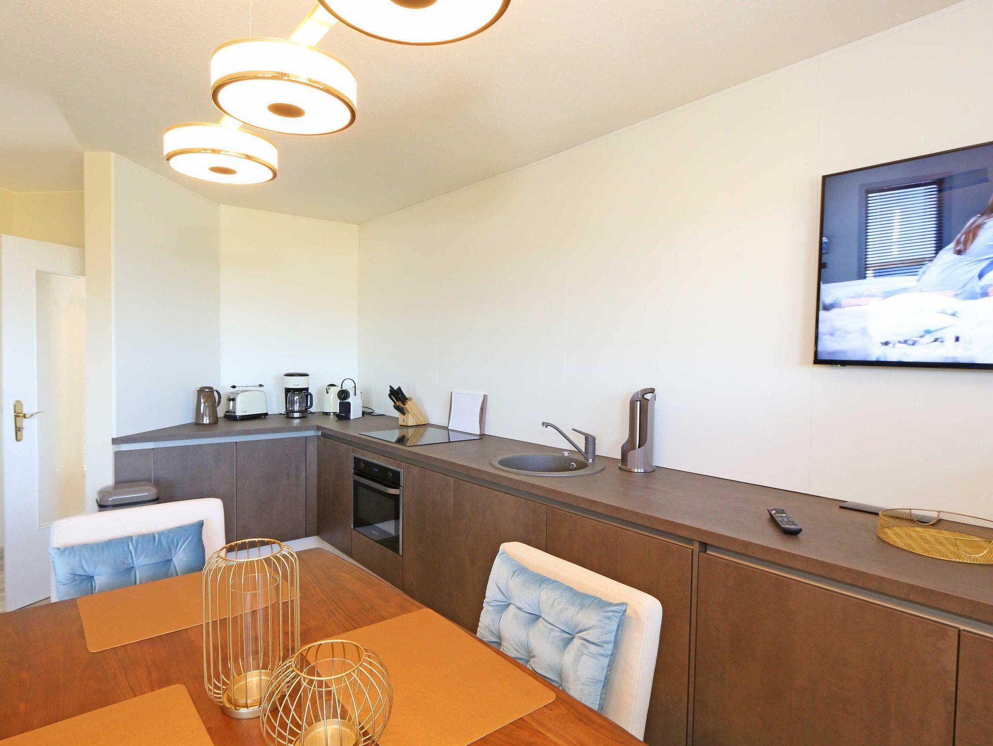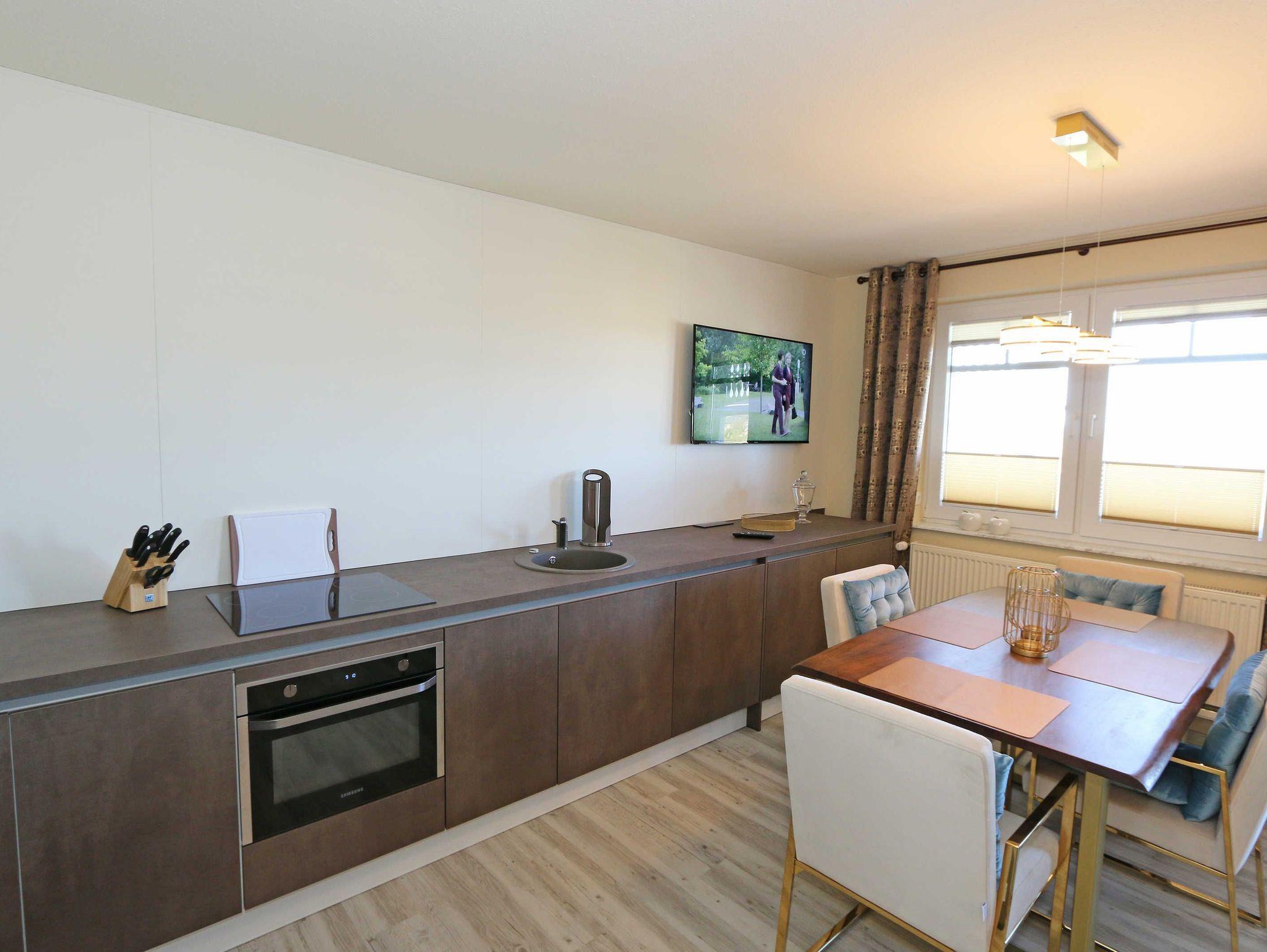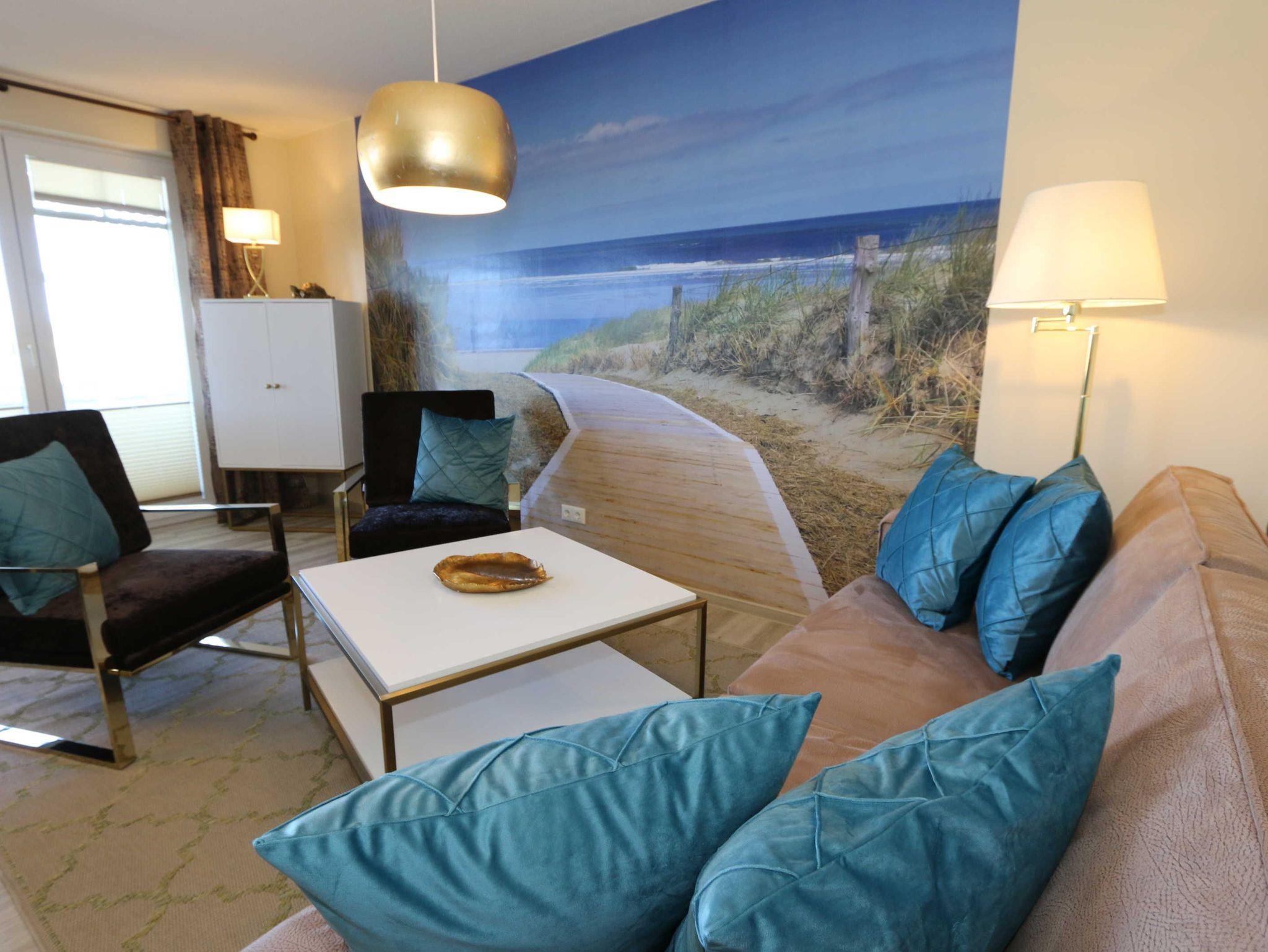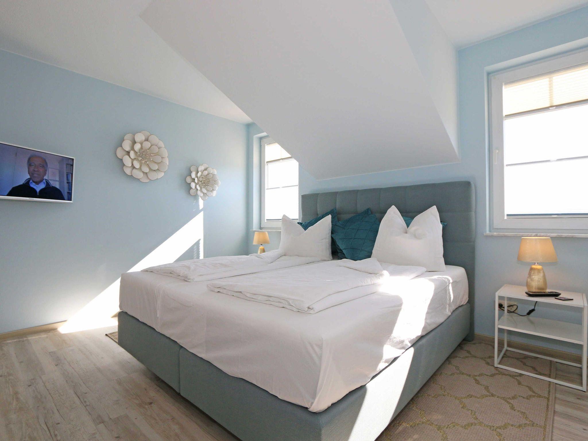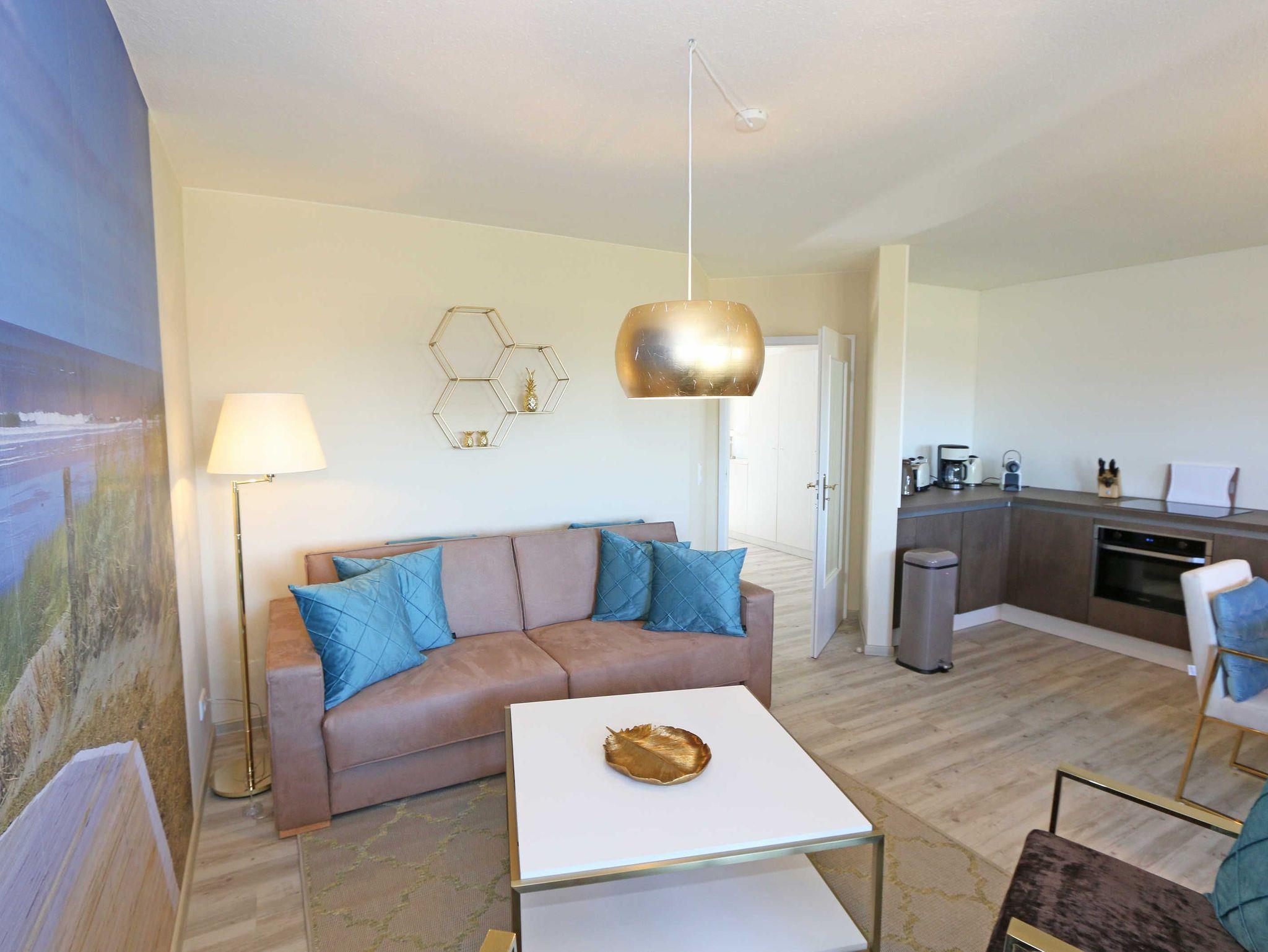 Das Nichtraucherappartement in der 2. Etage bietet mit seinen ca. 60 m² ausreichend Platz für max. 2 bis 4 Personen. Über einen Vorflur gelangen Sie in den großzügigen Hauptflur der Wohnung mit einer großen Garderobe. Auch alle weiteren Räumlichkeiten erreichen Sie von hier. Der gemütliche Wohnbereich beeindruckt Sie mit seiner großen Fensterfront welche Ihnen gleichzeitig den Zugang zu Ihrem bestuhlten Balkon (West/Nordwest) bietet wo Sie Ihren Morgen oder auch Ihren Abend mit einer herrlichen weiten Sicht nach Klein Zicker beginnen sowie enden lassen können. Eine elegante Couch verwandelt sich in eine gemütliche Schlafgelegenheit mit Kaltschaummatratze für 2 Personen (1,60m x 2,00m). Zwei Sessel ein großer Couchtisch, eine Leselampe, ein Highboard, ein DAB-Radio, ein Smart-TV, der keine Multimedia Wünsche offen lässt sowie ein inklusiver WLAN Zugang vervollständigen den Wohnbereich. Angrenzend wurde hinter grifflosen Fronten die moderne Küchenzeile integriert, welche mit einer Keramikspüle, einem Kühlschrank mit Gefrierschrank, einem Geschirrspüler, einem Backofen mit integrierter Mikrowelle, einem Cerankochfeld, einem Toaster, einem Wasserkocher, Nespresso Maschine und einer Kaffeemaschine keine Wünsche offen lässt. Der Esstisch stellt durch seine Treibholzoptik eine regionale Verbindung her und rundet mit seinen gemütlichen Stühlen das Bild ab. Im Schlafzimmer befinden sich ein hochwertiges Boxspringbett (1,80 m x 2,00 m), Nachttischablagen mit Leselampen, einem modernen Schwebetürenschrank sowie ein Smart-TV und ein Insektenschutzgitter. Das geräumige Bad ist mit einer Dusche, WC, Kosmetikspiegel, Fön, Waschplatz und diverser Schränke und Ablagemöglichkeiten ausgestattet. Das gesamte Appartement kann mit Plissees verdunkelt werden. Gerne können Sie die im Keller des Gebäudes vorhandene Waschmaschine und Trockner gegen eine Gebühr nutzen. Ein Wäscheständen sowie diverse Reinigungsutensilien befinden sich in Ihrem Appartement. Haustiere sind nicht erlaubt. Auf der Rückseite des Hauses befindet sich Ihr eigener PKW-Parkplatz Nr. 13. Ihre mitgebrachten Fahrräder können Sie im Keller des Objektes abstellen. Hier befindet sich auch eine Steckdose. Auf dem Grundstück befindet sich zudem ein gemeinschaftlicher Grillplatz. Die Erstausstattung eines Wäschepaketes (komplette Bettwäsche, 1 Duschhandtuch, 2 kleine Handtücher) können Sie bis 14 Tage vor Anreise gegen einen Aufpreis dazu buchen oder durch eigene ergänzen. Ab 2 gebuchten Paketen erhalten Sie einmalig 1 Geschirrhandtuch und 1 Duschvorleger hinzu.