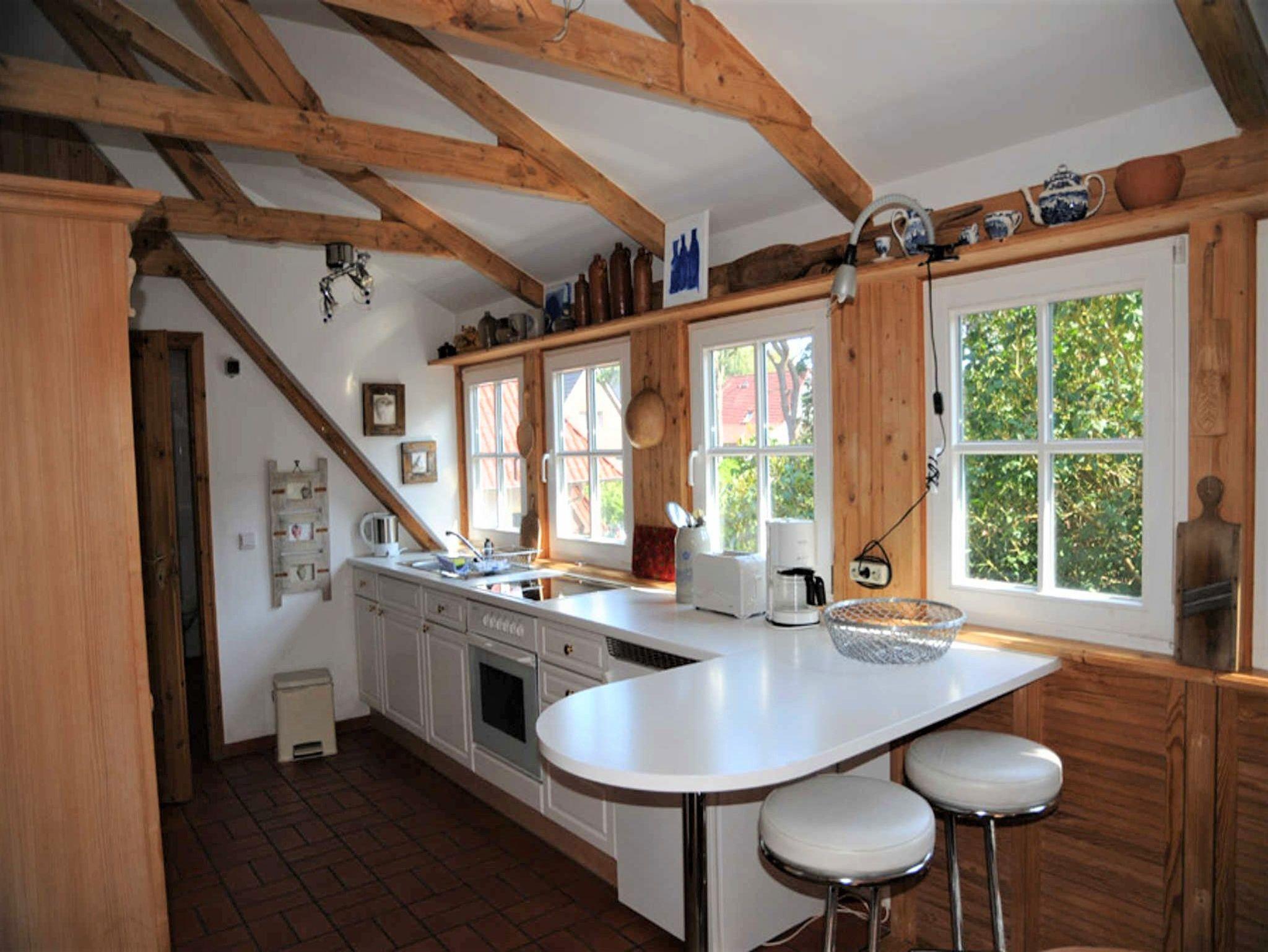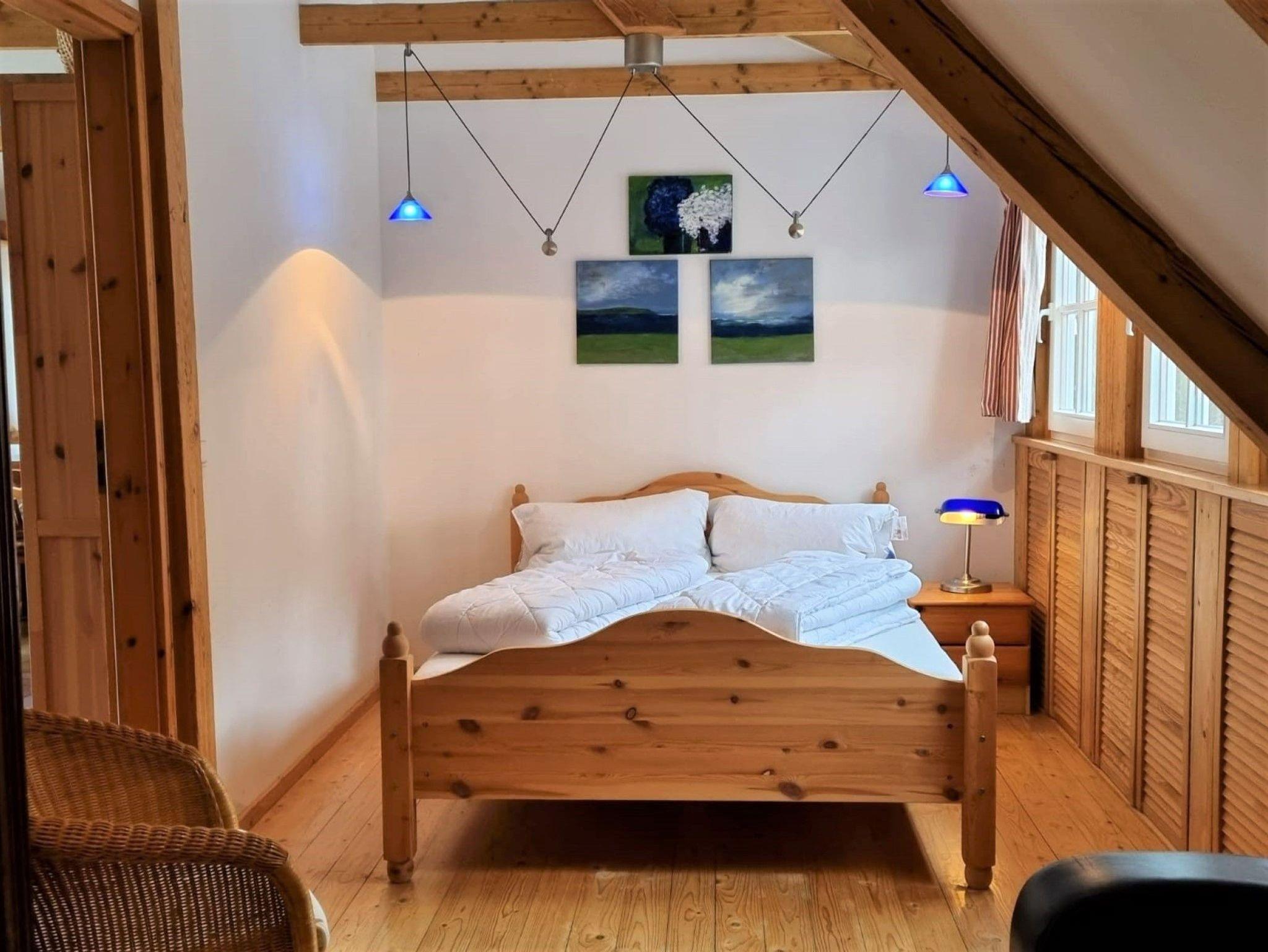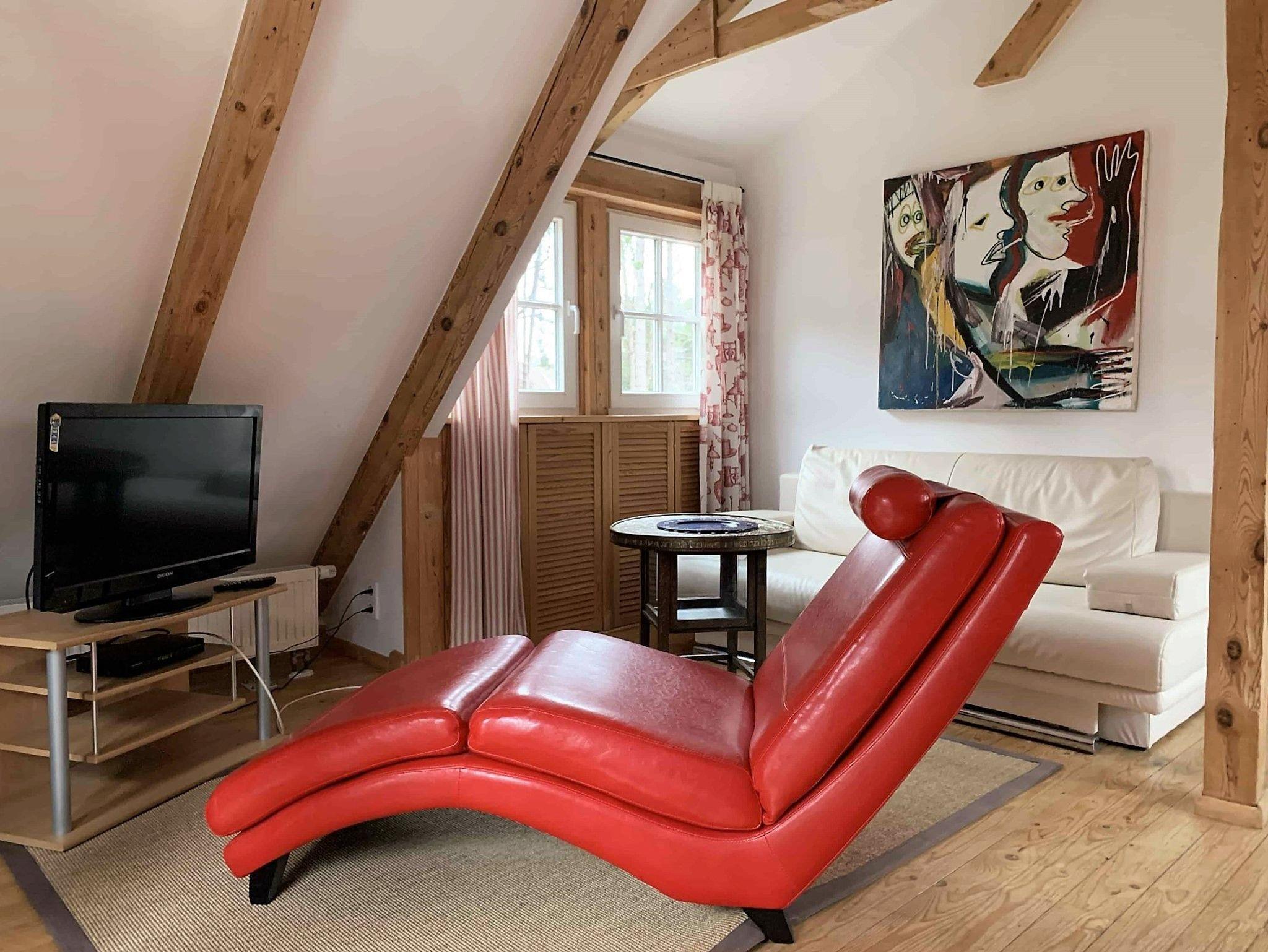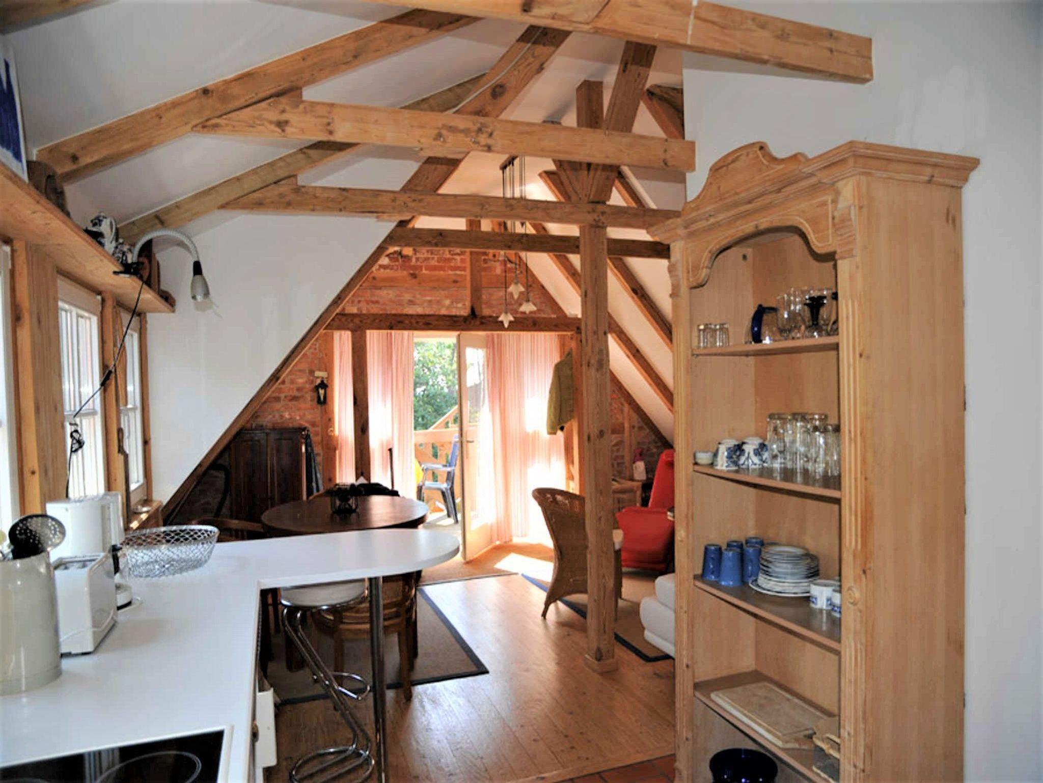 Große, stilvoll eingerichtete Ferienwohnung im Dachgeschoss. Die Wohnung verfügt über Sitzecke mit TV, Schlafcouch (Aufbettungsmöglichkeit für 2 Personen). Küchenzeile mit Ceran-Kochfeld und Backofen, großen Esstisch. Ein Schlafzimmer mit zwei Einzelbetten (können zusammengeschoben werden) und antiker Kommode. Aufbettung für Kleinkind bis 3 Jahre kostenfrei möglich. WLAN.