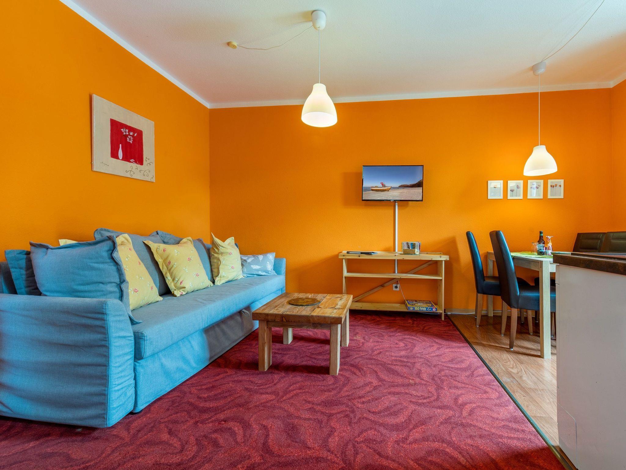 2-4 Pers.: 2-Zimmer-Wohnung mit 37 qm Wohnfläche, 1. Etage. Wohn-/Essraum mit Couchgarnitur (Ausziehcouch 2 Pers.), Esstisch, Küchenzeile (2 P. E-Herd, Spülmaschine, Minibackofen, Kaffeemaschine, Wasserkocher, 8-Set-Ess-Geschirr und Besteck, kleine Auswahl an Gläsern, kleine Topfsammlung, ein paar kleine Küchenhelfer --- Grundausstattung!!!)). Doppelbett, Couchgarnitur (Ausziehcouch 2 Personen), Bad/WC. Balkon mit Sitzmöbeln.