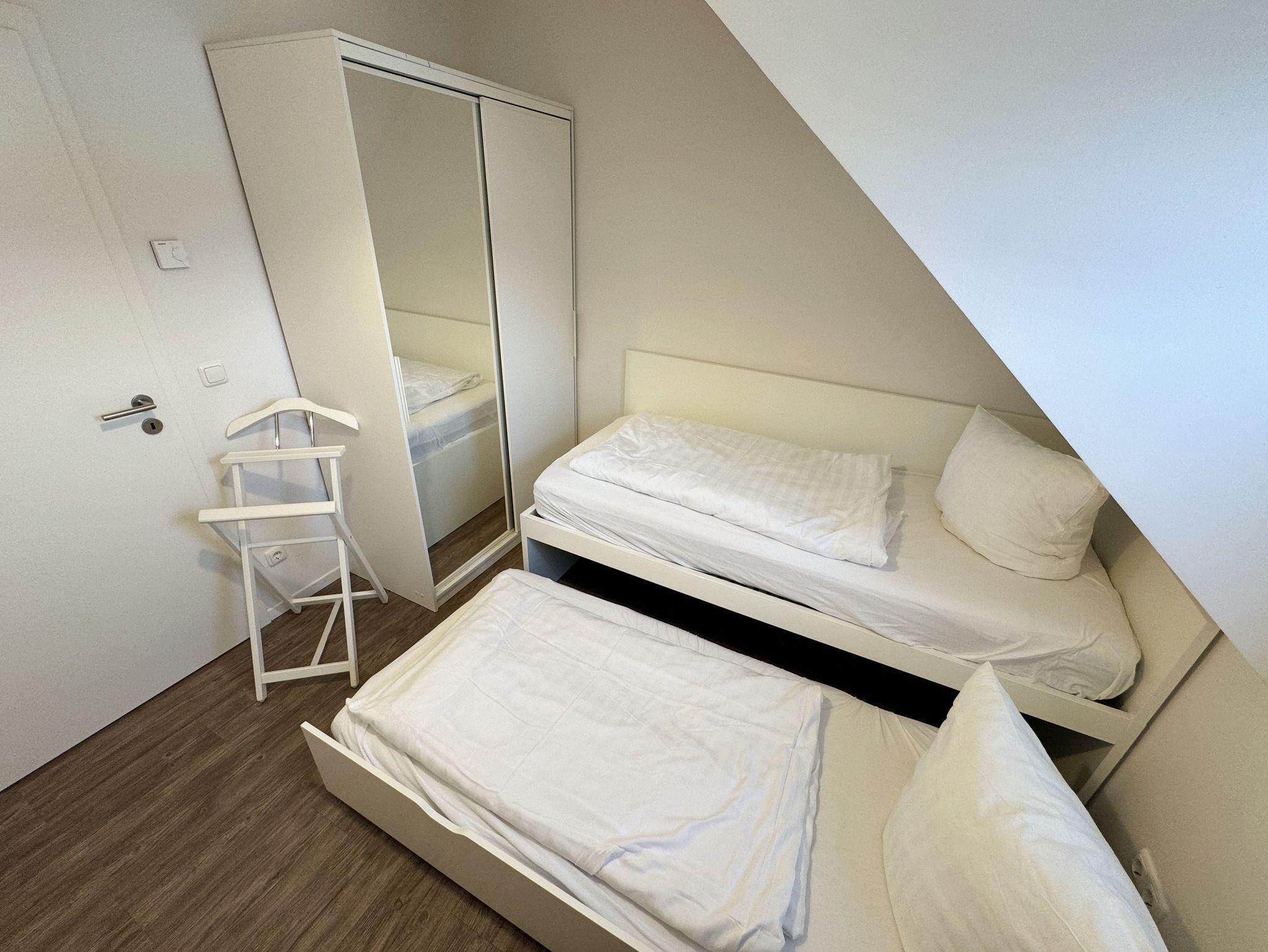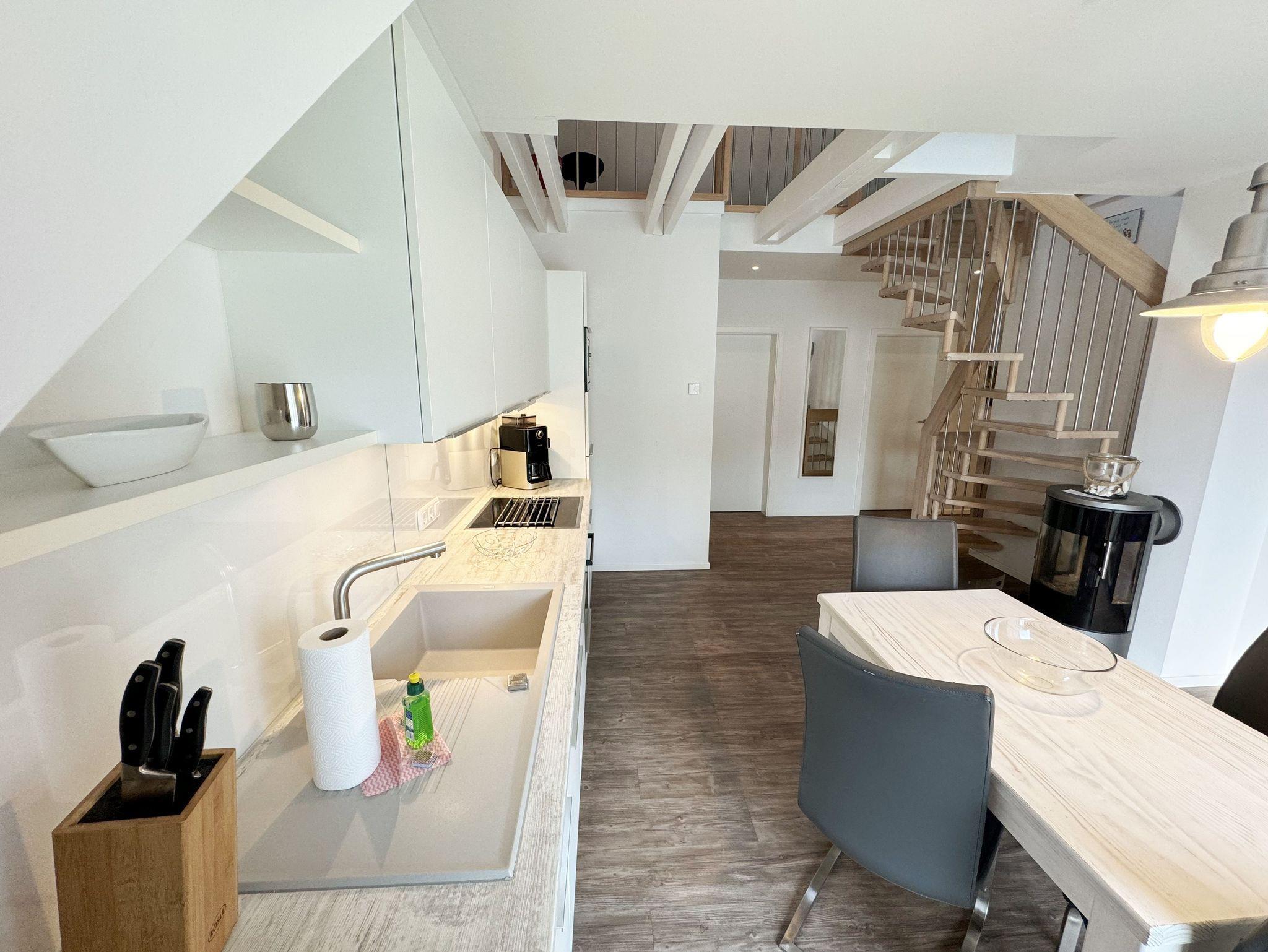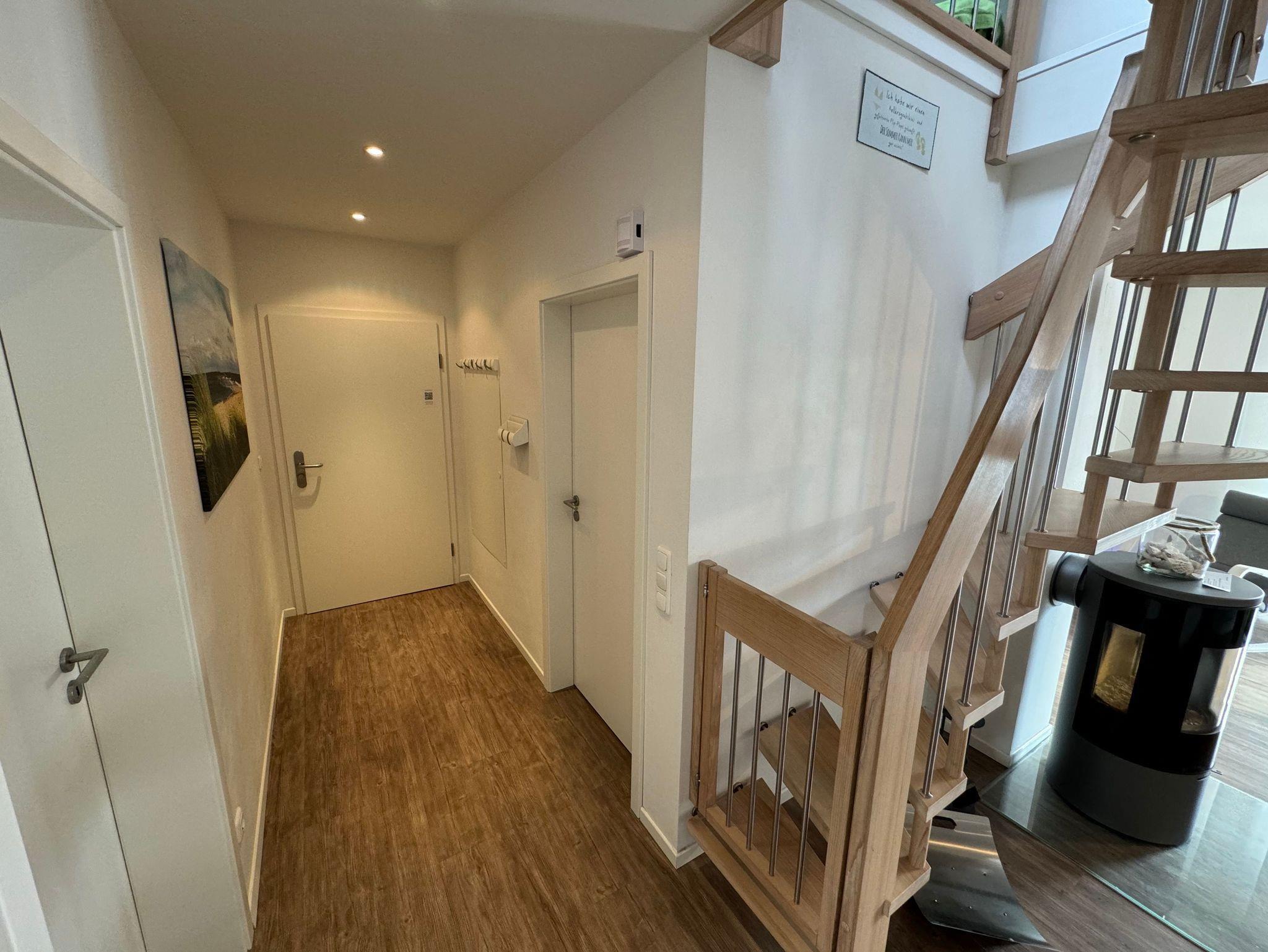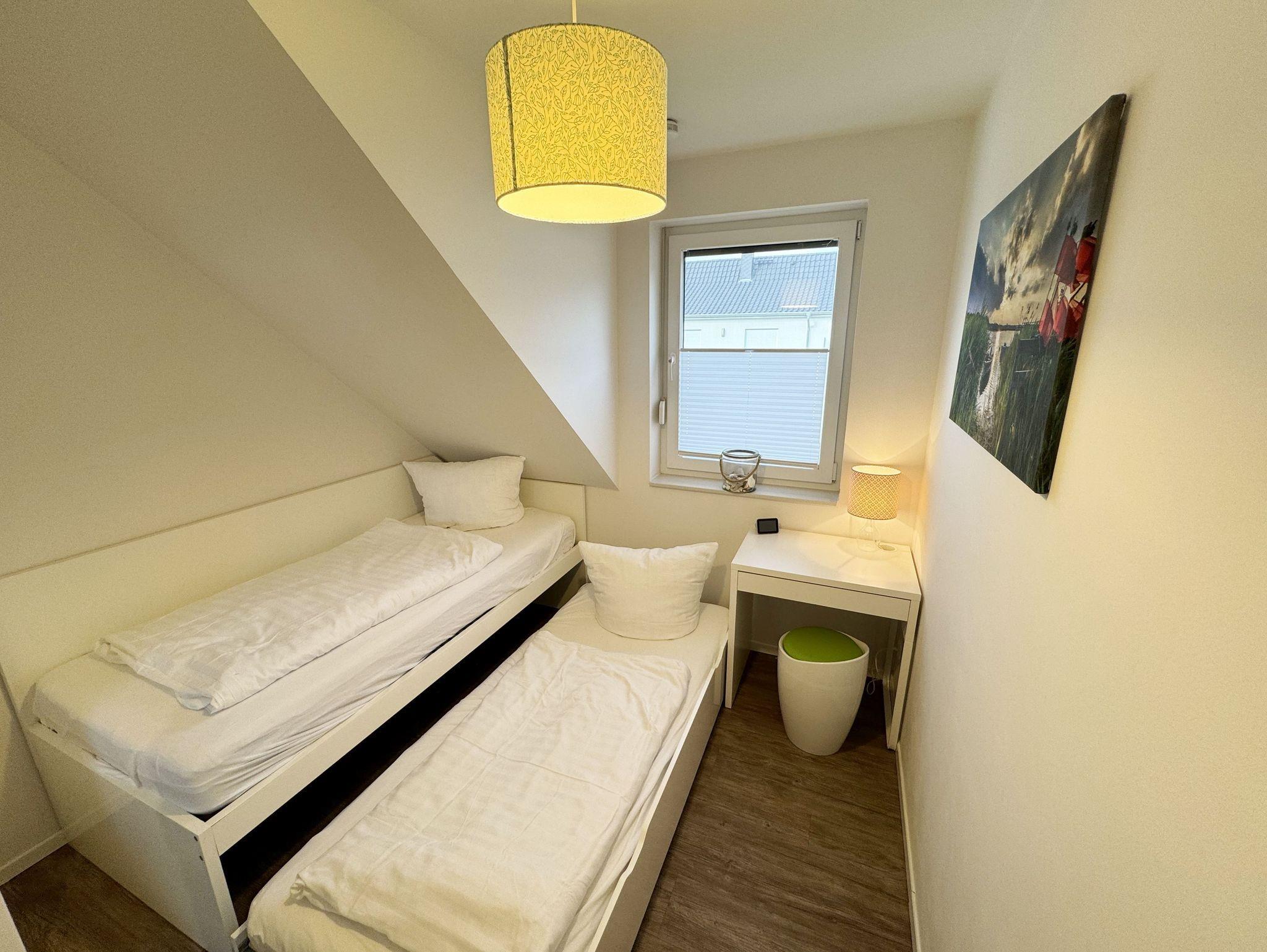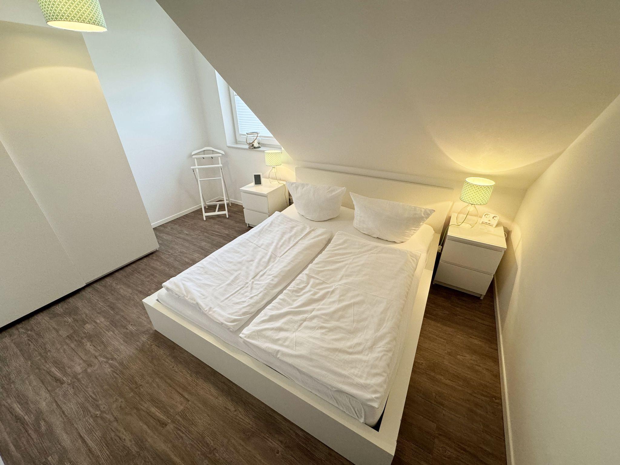 Zwei zum Garten gelegene Schlafzimmer, ein heller Wohnbereich mit Balkon in südwestlicher Ausrichtung und eine über eine Treppe erreichbare Galerie (max. Deckenhöhe ca. 1,85m) verteilen sich auf einer großzügigen Grundfläche von über 75 m² (die Wohnfläche beträgt nach anteiligem Abzug des Balkons, der Galerie und der Dachschrägen ca. 62 m²). 2-4 Personen finden hier komfortable Betten (ein Doppelbett mit einer durchgehenden Matratze von 2,00m x1,60m und ein Kojenbett mit 2 separaten Liegeflächen von jeweils 2,00m x 0,90m) sowie geräumige Kleiderschränke. Das kleinere Schlafzimmer verfügt über einen Safe im Kleiderschrank. Der Wohnbereich wird durch eine Couch, einen Kaminofen, einen Smart-TV, Blu-ray-Player u.a. mit CD- und Radiofunktion und Gesellschaftsspiele abgerundet. Ein Internetanschluss W-Lan sowie die Nutzung vom Festnetztelefon (inländische Gespräche) stehen Ihnen kostenfrei zur Verfügung. Eine umfangreiche ausgestattete und hochwertige Einbauküche mit Markengeräten wie ein Geschirrspüler, Induktionsfeld mit Backofen, Kühlschrank mit Gefrierfach und Mikrowelle lassen keine Wünsche offen. Kleine Küchenhelfer wie Kaffeemaschine, Toaster, Wasserkocher etc. sind ebenfalls vorhanden. Wenn die Galerie nicht schon von Ihren Kindern als Spielreich in Beschlag genommen ist, können Sie sich hier nach einem erlebnisreichen Tag zum entspannten Lesen zurückziehen. Auch ein Klappschreibtisch zum Schreiben für die Urlaubspost an die Daheimgebliebenen befindet sich auf der Galerie. Für unsere kleinen Gäste haben wir die Treppe kindersicher gestaltet und bieten 1x Hochstuhl sowie 1x Reisebett (ohne Matratze und Bett Inlett) inklusive zur Nutzung an. Das moderne Bad mit Lüftung wurde mit einer bodengleicher Regendusche, WC, Handtuchtrocknerheizung, Waschmaschine, Fön und Waschtisch versehen. Alle Räumlichkeiten werden durch eine Fußbodenheizung erwärmt. Zur Wohnung gehört ein PKW -Stellplatz Nr. 07 und ein abschließbarer Schuppen zur sicheren Unterbringung Ihrer Fahrräder und Surfbretter. Wir bitten um Verständnis dafür, dass das Rauchen und der Aufenthalt von Haustieren in dieser Ferienwohnung mit Rücksicht auf die Belange anderer Gäste nicht gestattet sind. Die Erstausstattung von Bettwäsche ist pro Person inklusive. Handtücher (1 Duschhandtuch, 2 kleine Händehandtücher sowie einmalig 1 Duschvorleger und 1 Geschirrhandtuch) sind entweder selbst mitzubringen oder Sie buchen Sie bis 14 Tage vor Ihrer Anreise gegen einen Aufpreis dazu.