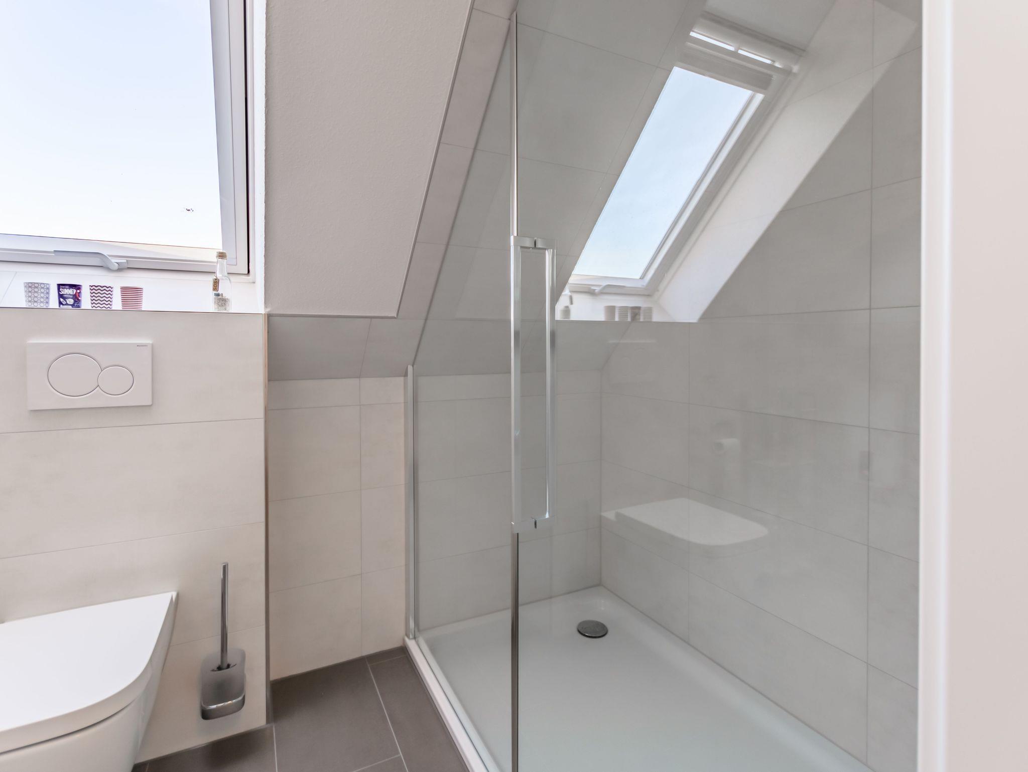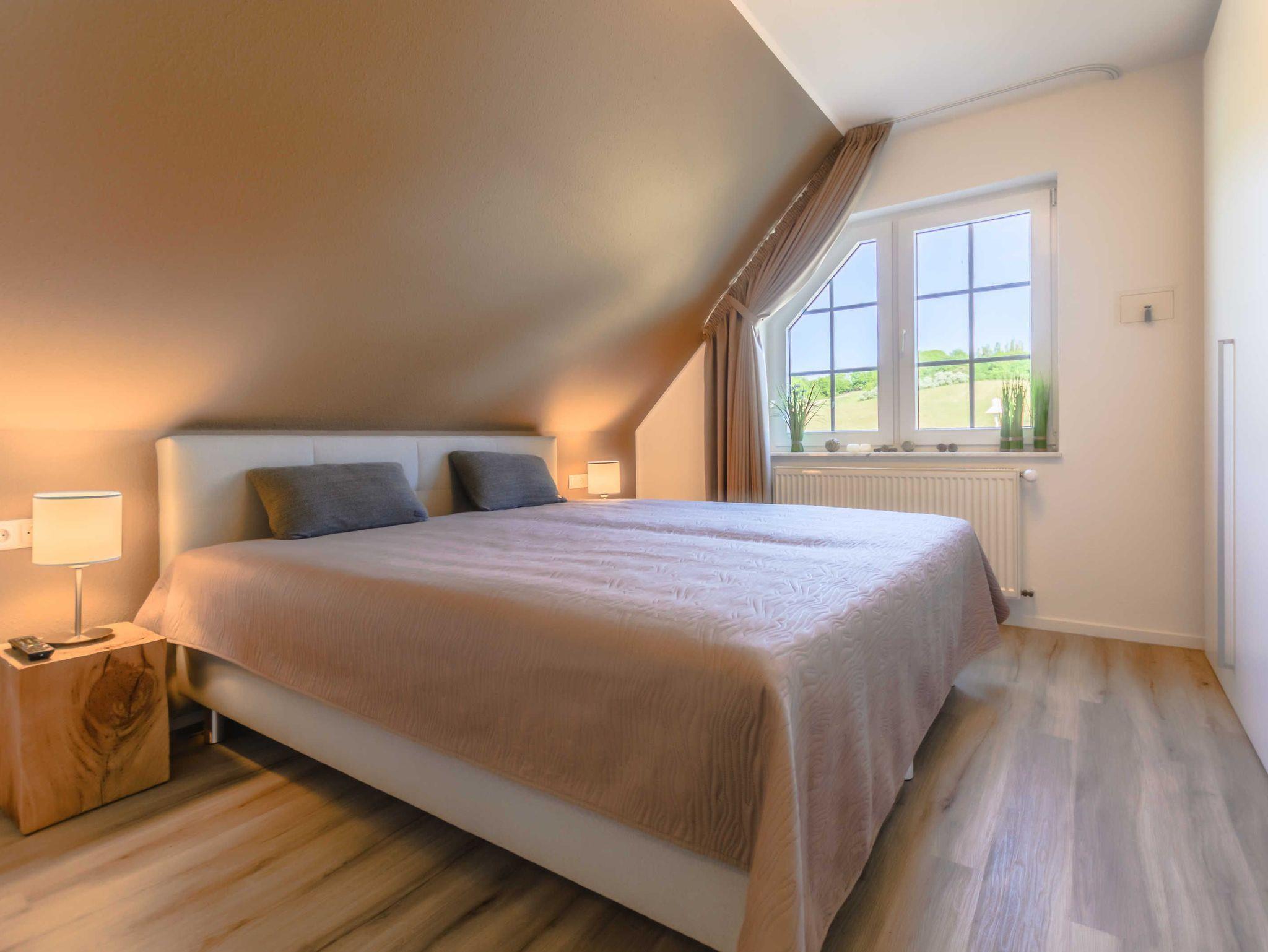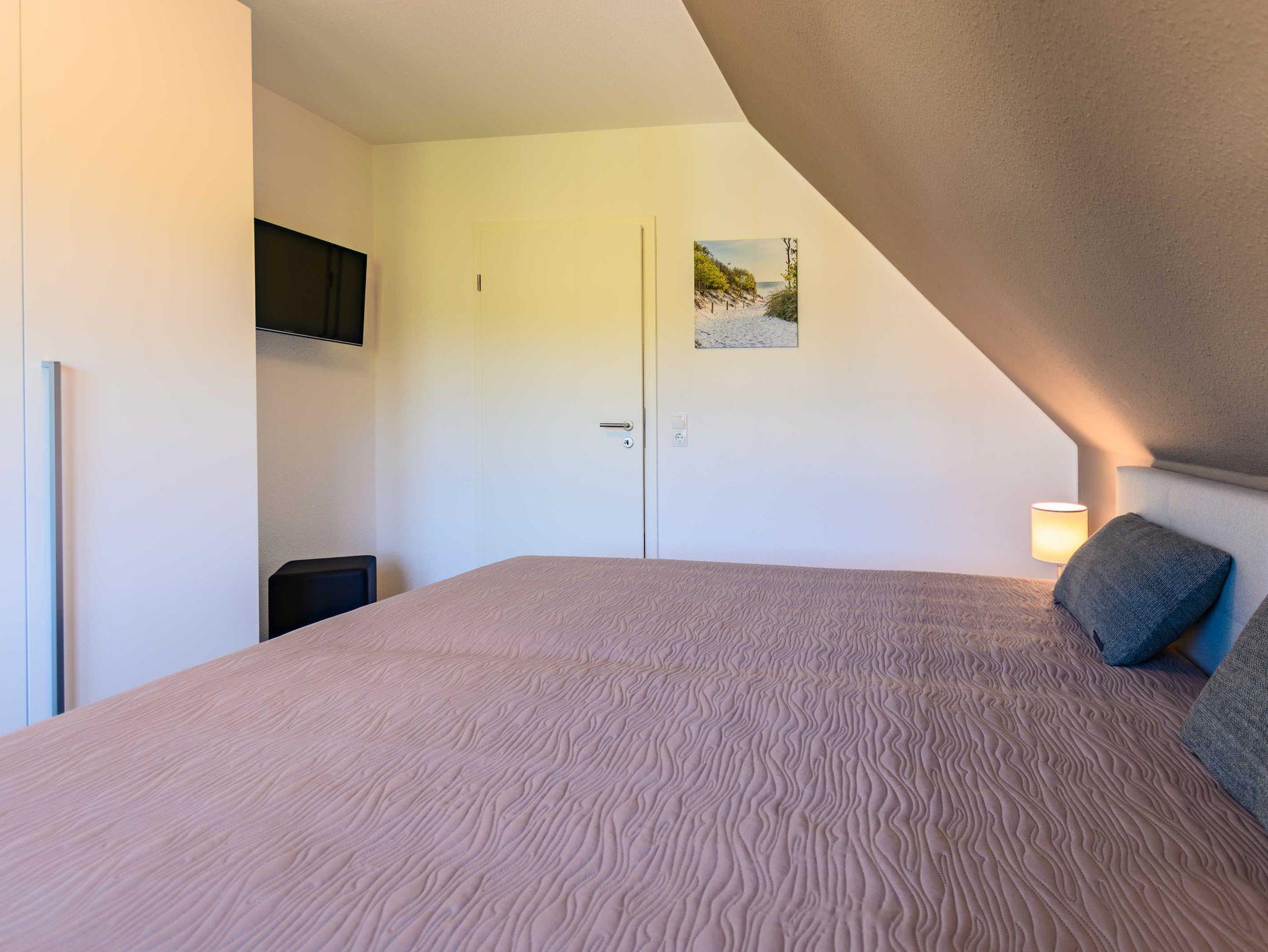 Die Nichtraucherferienwohnung befindet sich in der 1. Etage und erstreckt sich über 2 Etagen. Mit Ihren ca. 75 qm können sich max. 6 Erwachsene wohlfühlen. Der großzügige und helle Wohn- Essbereich ist mit einer modernen Küchenzeile ausgestattet. Mit einem Kühlschrank mit Eisfach, Geschirrspüler, Cerankochfeld, Backofen, Mikrowelle, Wasserkocher, Kaffeemaschine, Toaster, Mixer, Waffeleisen können Sie Ihre gemütlichen Kochabende ganz individuell gestalten. Ein passender Essbereich rundet die Gemütlichkeit ab. Im angrenzenden Wohnbereich trägt eine bequeme Couch (Aufbettungsmöglichkeit für 5./6.Person, 1,50m x 1,95m) mit Couchtisch, ein Lesesessel mit Hocker sowie ein TV-Board zu Ihrer Entspannung bei. Die technische Ausstattung umfasst einen Smart-TV, ein DAB-Bluetooth-Radio sowie einen WLAN-Anschluss. Vom Wohnbereich gelangen Sie auf Ihren bestuhlten Balkon (Süd) mit Sonnenschirm, von wo Sie aus Ihren Tag entspannt bei einem Glas Wein ausklingen lassen können. Hell und freundlich eingerichtet erwartet Sie ein gemütliches Schlafzimmer auf gleicher Ebene, mit einem komfortablen Boxspring-Bett (1,80m x 2,00m) mit 5 Zonen Tonnen-Taschenfederkern-Matratzen, Nachttischablagen, einen großzügigen Kleiderschrank sowie ein Smart-TV. Das 2. Schlafzimmer erreichen Sie durch eine Treppe, welche vom Wohnbereich aus startet. Hier befindet sich ebenfalls ein bequemes Boxspringbett (1,80m x 2,00m) mit Nachttischablagen sowie einer kleinen Leseecke oder Relax-Ecke. Beide Schlafbereiche verfügen zudem über Vorhänge/Rollos, die nahezu lichtundurchlässig sind und einen guten Sicht- und Sonnenschutz bieten. Für einen angenehmen Schlaf sorgen zusätzlich Insektenschutzgitter im Wohn- & Schlafbereich. Das Tageslicht-Badezimmer ist mit einer ebenerdigen Dusche, einem WC, einen Handtuchtrockner, einem Fön sowie einem Waschtisch ausgestattet. In der Wohnung finden Sie zusätzlich ein Staubsauger, ein Besen mit Kehrset, ein Wäscheständer sowie ein Wäschekorb. Im Nachbarhaus C können Sie eine Waschmaschine sowie einen Trockner gegen Gebühr nutzen. Hier stehen auch ein Bügelbrett und ein Bügeleisen zur Verfügung. Haustiere sind nicht erlaubt. Das Grillen auf dem ausgewiesenen Gemeinschaftsplatz lädt zu gemütlichen Abenden ein. Zur Entspannung lädt eine münzbetriebene Sauna mit kleinem Ruheraum im Untergeschoss von Haus B ein. Ihre Fahrräder können Sie begrenzt im Gemeinschaftskeller oder auf dem Grundstück abstellen. Die Erstausstattung eines Wäschepaketes (komplette Bettwäsche, 1 Duschhandtuch, 2 kleine Handtücher) können Sie bis 14 Tage vor Anreise gegen einen Aufpreis dazu buchen oder durch eigene ergänzen. Ab 2 gebuchten Paketen erhalten Sie einmalig 1 Geschirrhandtuch und 1 Duschvorleger hinzu.