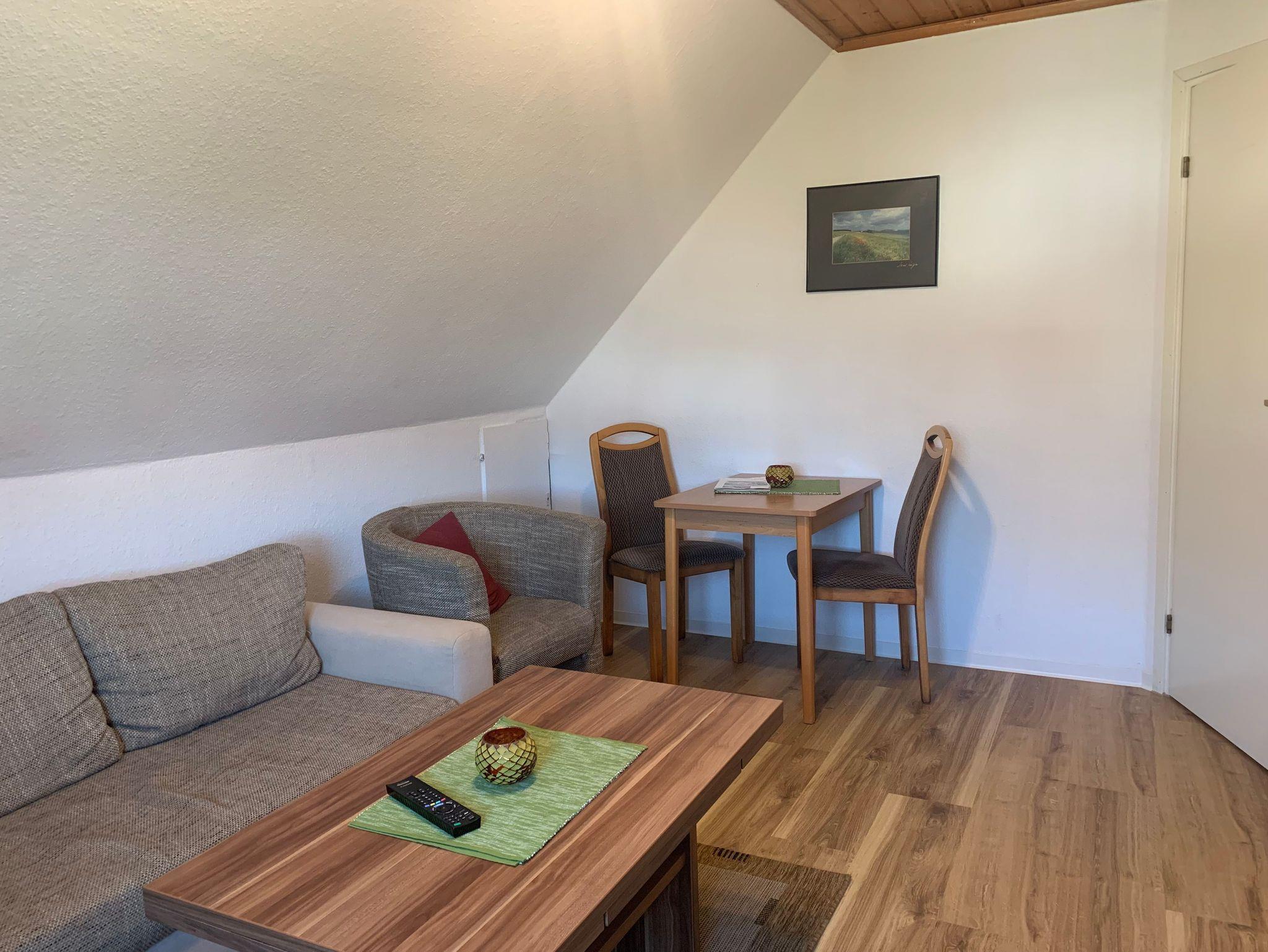 Die Feriemwohnungen befinden sich im Obergeschoß im Haus des Vermieters und sind über eine Innentreppe zu erreichen. Die abgeschlossenen Wohnungen verfügen je über einen Wohnraum mit der Aufbettungsmöglichkeit auf der Schlafcouch, einem Schlafraum mit Doppelbetten, der Küche und dem Duschbad.