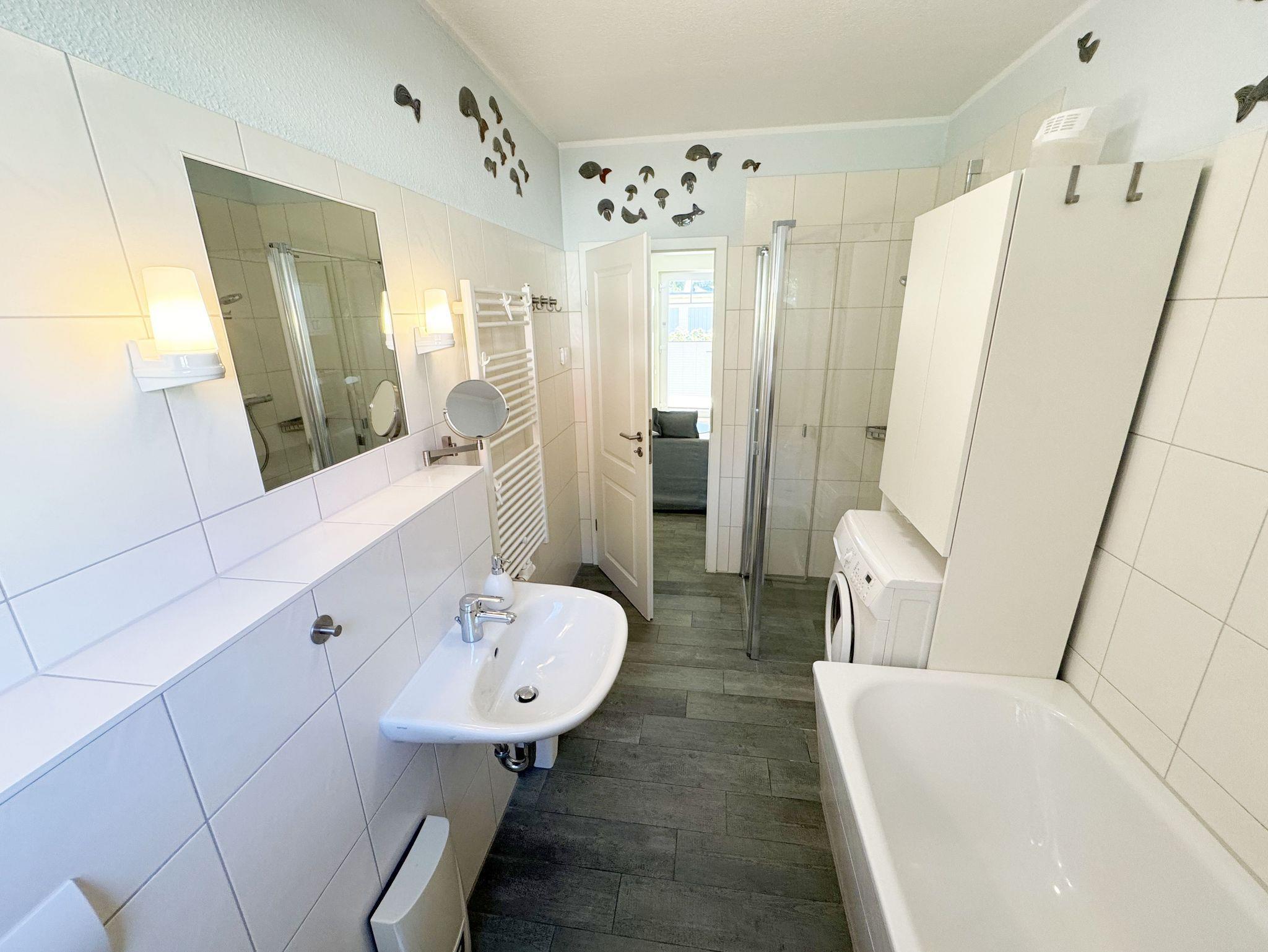 Die Nichtraucherferienwohnung Ostseerausch (Nr.01) umfasst ca. 50 qm und bietet Ihnen für max. 4 Erwachsene ausreichend Platz. Da sich die Wohnung im Erdgeschoss befindet und über einen separaten Eingang über die Terrasse verfügt, eignet Sie sich gut für Familien mit Kindern oder auch ältere Gäste. Der komfortable Wohnbereich wurde mit einer gemütlichen Eckcouch, (Aufbettungsmöglichkeit für 3./4. Person, 1,40m x 2,00m), einem Couchtisch, einer Leselampe und einen TV-Board mit einem Smart-TV ausgestattet. Ein Account von Netflix steht Ihnen zusätzlich zur Verfügung. Ein Bücherregal mit einer kleiner Buchauswahl, einer kleinen Auswahl an Gesellschaftsspielen, Bose connect Lautsprecher und ein WLAN-Anschluss sorgen für Ihre Unterhaltungsmöglichkeiten. Angrenzend befindet sich die komplett ausgestattet Küchenzeile mit einem Induktionsherd, einem Backofen, einem Geschirrspüler, einem Kühlschrank mit Gefrierfach, einer Kaffeemaschine, einer Nespresso Maschine, einem Wasserkocher, einen Mixer, einen Toaster sowie diverse Küchenutensilien. Ein runder Essplatz rundet den Bereich ab. Vom Wohn-/Essbereich gelangen Sie auf Ihre überdachte und bestuhlte Terrasse mit Sonnenschirm mit Blick auf den Küstenwald. Ein Stand-Elektrogrill sowie 2 Sonnenliegen stehen Ihnen zusätzlich zur Verfügung. Das Schlafzimmer ist mit einem Doppelbett in Komforthöhe (1,60m x 2,00m), Nachtischablagen mit Beleuchtung, einem geräumigen Kleiderschrank sowie Kleiderablagen ausgestattet. Für einen ruhigen und angenehmen Schlaf sorgen zusätzlich Insektenschutzgitter und Außenjalousien, welche Sie auch in den anderen Räumlichkeiten vorfinden. Im Tageslicht-Bad befindet sich eine ebenerdige Regen-Dusche, eine Badewanne, ein Waschplatz, ein WC mit Komfort-Sitz, ein beheizter Handtuchhalter, eine Waschmaschine (Nutzung inklusive), ein Kosmetikspiegel sowie ein Fön. Für eine angenehme Wärme sorgt in allen Räumlichkeiten eine Fußbodenheizung. Reinigungsutensilien, ein Bügelbrett, ein Bügeleisen sowie ein Wäscheständer komplettieren die Ausstattung der Wohnung. Zwei Haustiere sind gegen eine Gebühr gern gesehene Gäste. Mitgebrachte oder geliehene Fahrräder können im dazugehörigen Schuppen (Nr.01) untergestellt werden. Ihr PKW-Stellplatz (Nr.01) befindet sich direkt auf dem Grundstück. Die Erstausstattung eines Wäschepaketes (komplette Bettwäsche, 1 Duschhandtuch, 2 kleine Handtücher) können Sie bis 14 Tage vor Anreise gegen einen Aufpreis dazu buchen oder durch eigenes Ergänzen. Ab 2 gebuchten Paketen erhalten Sie einmalig 1 Geschirrhandtuch und 1 Duschvorleger dazu.