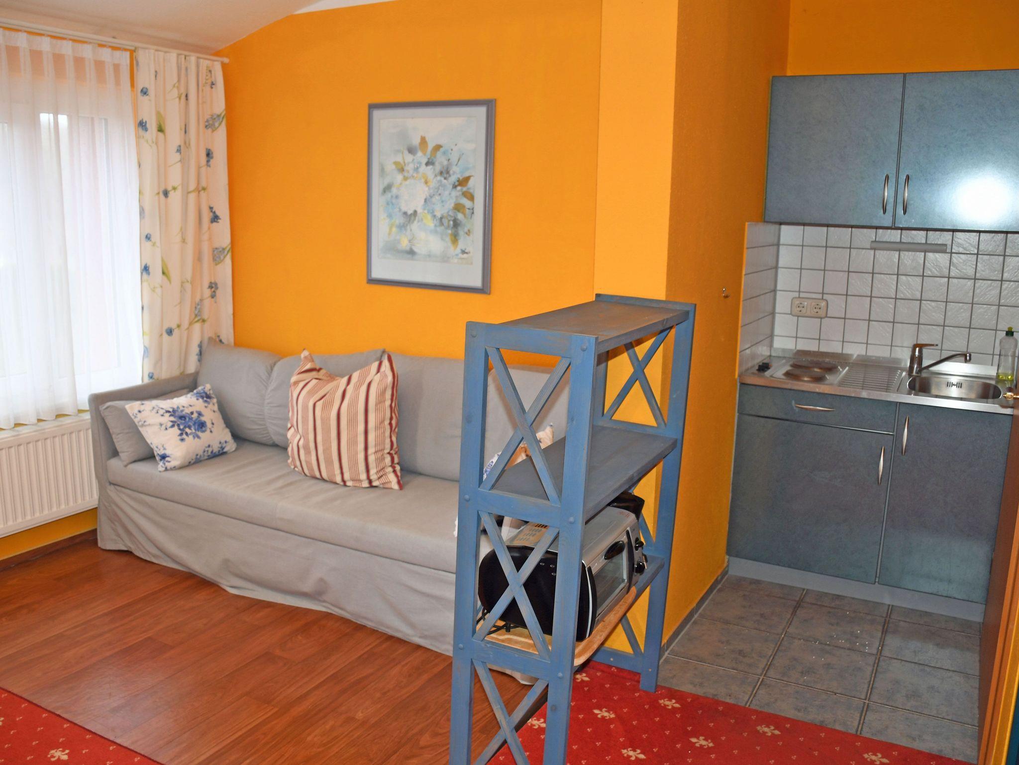 Dieses Ferienappartement erreichen Sie über den Hintereingang und liegt im Obergeschoss. Sie ist ca. 30 qm groß, bietet Platz für maximal 3 Erwachsene und wurde modern eingerichtet. Das 1-Raum-Appartement ist unterteilt in Schlaf,- Wohn- und Küchenbereich.