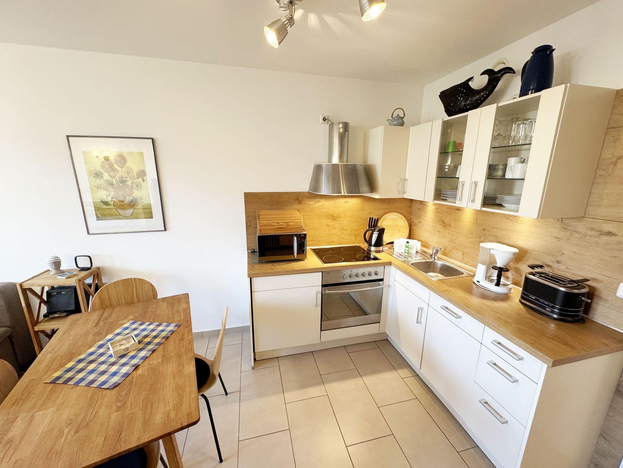 Im Haus „Möwe“ befindet sich die helle und gemütliche Zweizimmerwohnung (Nichtraucher) im Erdgeschoss und ist vom Privatparkplatz bequem zu erreichen. Die Maisonette Wohnung Nr. 02 verfügt auf 56 qm über allen Komfort, den man von zuhause gewöhnt ist und ist für 2 bis 4 Personen ausgerichtet. Von einem kleinen Flur mit Garderobe gelangt man in den hellen unteren Bereich der Wohnung. Sogleich fällt der Blick auf die geräumige Terrasse (westliche Ausrichtung), die mit einer Sitzgruppe + Sonnenliege für vier Personen und einem Sonnenschirm zum ruhigen Verweilen einlädt. Die gesamte untere Etage ist gefliest und mit einer Fußbodenheizung ausgestattet. Der untere Wohnbereich verfügt über eine bequeme Couch (1,50m x 2,00m), die auch als zusätzliche Schlafgelegenheit genutzt werden kann. Ein bequemer Sessel mit Leselampe vervollständigt das Ensemble. Kleine Beistelltische bieten immer eine Ablage, sodass man bei einem Kaffee oder einem Glas Wein eine entspannte Unterhaltung führen kann. Für die kälteren Tage ist ein Kaminofen vorhanden, der durch ein Sichtfeld das Kaminfeuer betrachten lässt. Je nach Bedarf kann man eine Stereoanlage nutzen, die neben Radio und CD-Laufwerk auch die Möglichkeit bietet, die eigene Musik vom iPod oder einem USB-Stick abzuspielen. Mit dem TV-Flat Screen mit DVD-Player kann man ruhig mal einen kleinen Filmabend gestalten. Um die Sache abzurunden, befindet sich in der Holzkommode eine reichhaltige DVD-Sammlung mit bekannten Filmen, die für Jung und Alt sicherlich etwas zu bieten hat. Auch im Urlaub brauchen Sie auf einen Internetanschluss (WLAN) nicht verzichten. Dieser ist für Sie inklusive. Die Küchenzeile lässt keine Wünsche offen. Neben einem Kühlschrank mit Gefrierfach und einem Kochherd mit Ceranfeld und Backofen sind alle Dinge vorhanden (Kaffeemaschine, Wasserkocher, Toaster, Mikrowelle) die man zur Zubereitung eines leckeren Mahls nach dem Strandaufenthalt benötigt. Damit man sich nicht dem Leid des Abwaschens im Urlaub hingeben muss, kann man den eingebauten Geschirrspüler nutzen, der für einen die Arbeit leise und unaufdringlich erledigt. Der Essbereich ist mit einem Tisch ausgestattet, an dem bis zu vier Personen Platz finden. Über eine Holztreppe gelangt man in die erste Etage. Dort befindet sich das innenliegende Bad mit Dusche und WC, Spiegelschrank und Fön. Um auf den Balkon zu kommen, durchschreitet man das Schlafzimmer. Der Raum ist wie das gesamte Stockwerk mit einem hellen Holzfußboden ausgelegt und eine Fußbodenheizung sorgt zu jeder Jahreszeit für ein angenehmes Klima. Für die persönlichen Sachen steht ein Kleiderschrank zur Verfügung. Jeweils an den Seiten des großen Doppelbettes (einzelne Matratzen á 0,90 m) für zwei Personen befinden sich Nachttischkonsolen mit Nachttischlampen. Sollten Sie ihre Urlaubslektüre vergessen haben, sind einige Angebote in der Wohnung zu finden. Durch die elektrischen Rollos, die sich im unteren und im oberen Stockwerk befinden, genügt ein Knopfdruck, um eine ungestörte Nacht zu verbringen, bzw. am Morgen die Sonne ins Zimmer zu lassen. Fahrräder kann man in einem abschließbaren Schuppen Nr.02, der sich in unmittelbarer Nähe des Hauses befindet, unterstellen. Ein PKW-Stellplatz Nr. 02 befindet sich direkt am Haus. Gegen eine Gebühr haben wir keine Probleme mit 1 Haustier, wenn dies gut erzogen ist! Die Erstausstattung eines Wäschepaketes (komplette Bettwäsche, 1 Duschhandtuch, 2 kleine Handtücher) können Sie bis 14 Tage vor Anreise gegen einen Aufpreis dazu buchen oder durch eigene ergänzen. Ab 2 gebuchten Paketen erhalten Sie einmalig 1 Geschirrhandtuch und 1 Duschvorleger hinzu.