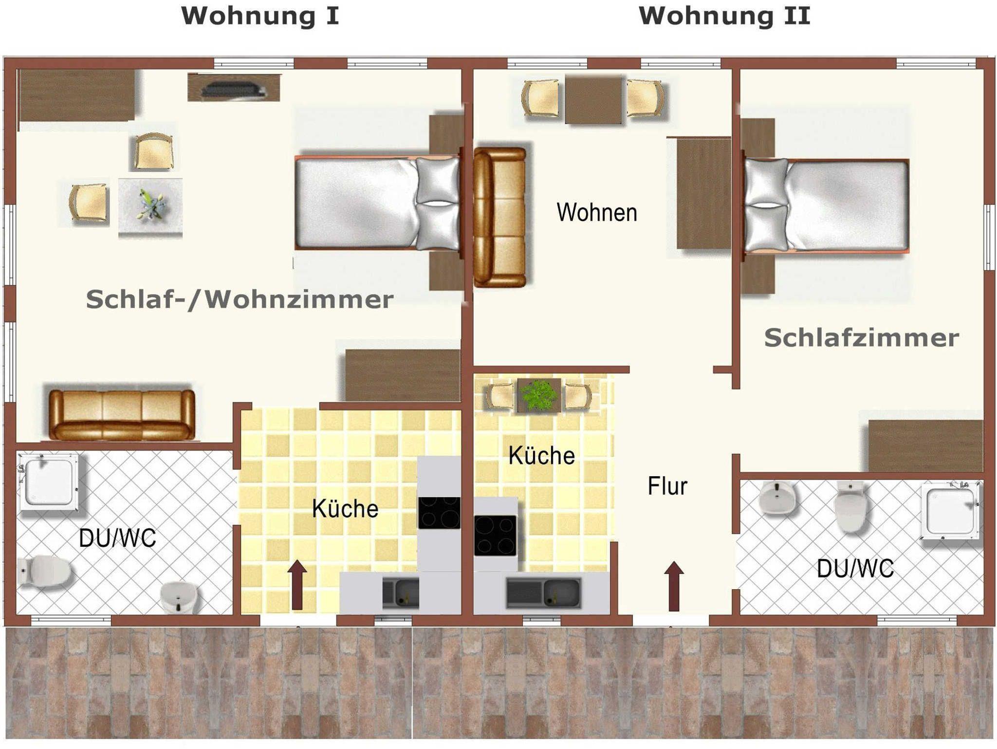 Kleine, gemütliche eingerichtete Ferienwohnung mit einem Schlafzimmer. Aufbettung im Wohnzimmer auf der Schlafcouch möglich. Separate kleine Küche mit Essecke, 2-Platten-E-Herd und üblicher Ausstattung. Terrasse. WLAN