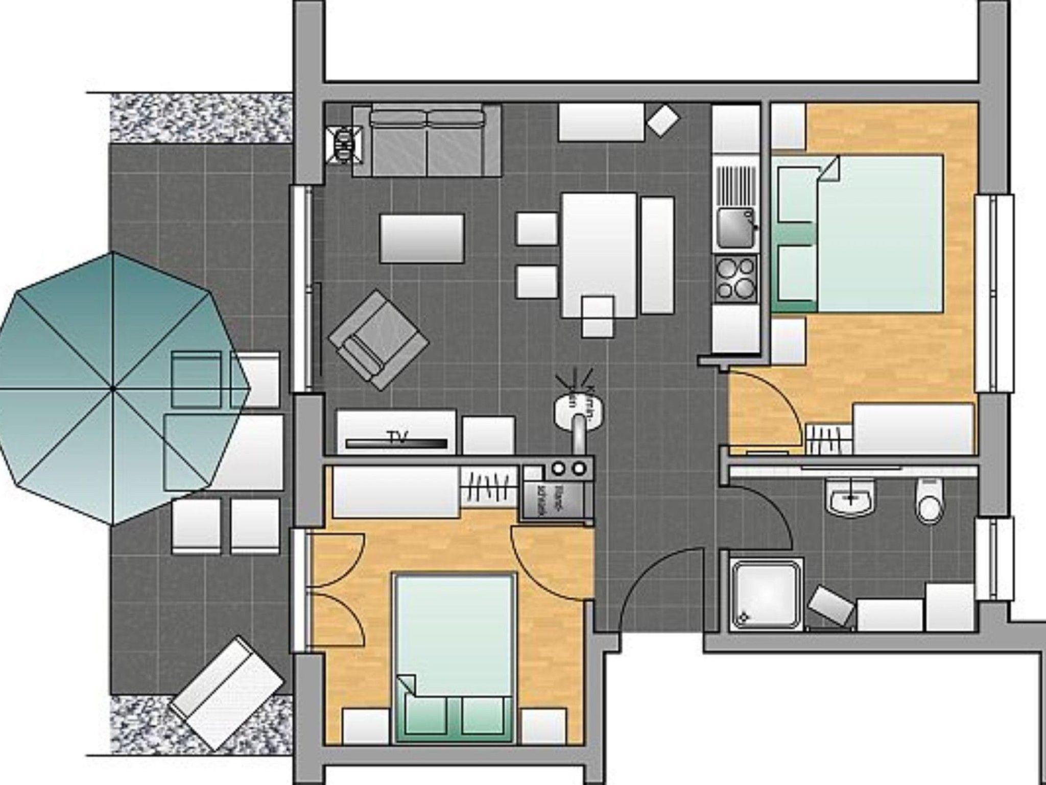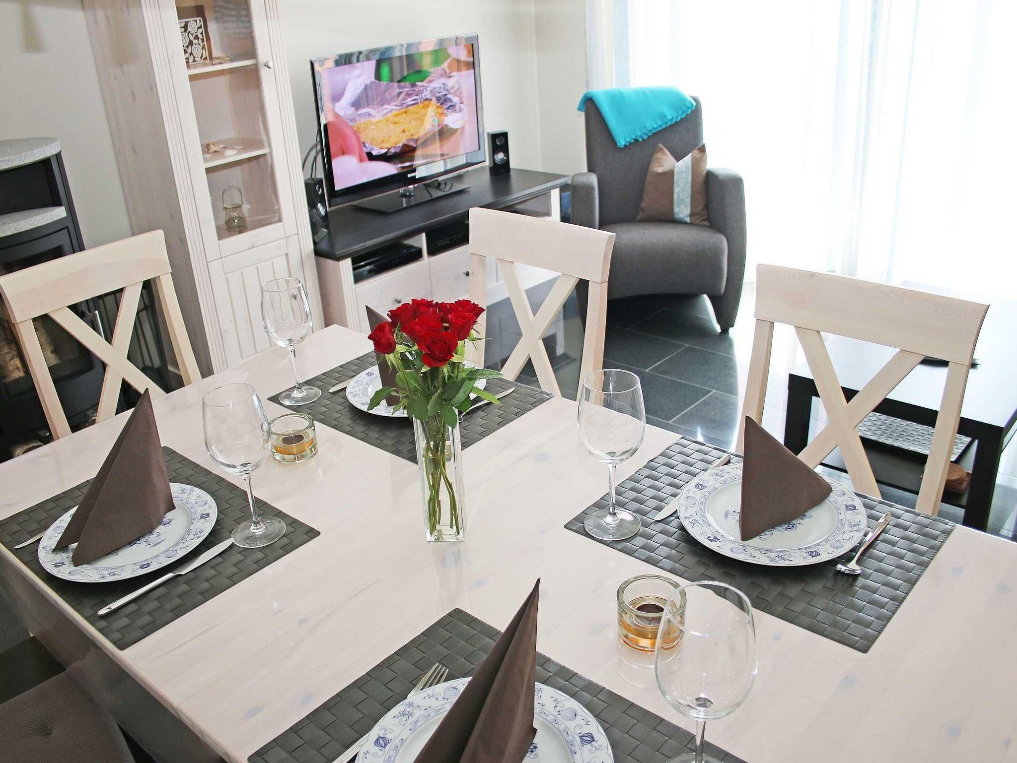 Das 3-Raumappartement (Nichtraucher) befindet sich in Parterre und bietet mit ca. 61 qm ausreichend Platz für bis zu 4 Personen. Die Wohnung ist im gehobenen Standard eingerichtet. An kälteren Abenden sorgt ein Kaminofen für eine wohlige Wärme und gemütliche Atmosphäre. Das Brennholz (solange der Vorrat reicht) steht Ihnen inklusive zur Verfügung. In der Ferienwohnung wurde ein hochwertiger Granitfußboden verarbeitet sowie in den beiden Schlafzimmern ein hochwertiger Parkettboden verlegt. An jedem Fenster wurde Insektenschutz angebracht sowie elektrische Rollläden. Der Wohnraum ist mit einer gemütlichen Couch, Leselampe, Smart-TV, Blu-Ray-Player, WLAN (inklusive) und einer Stereoanlage mit DAB-Radio ausgestattet. Von dem Wohnzimmer sowie vom 2. Schlafzimmer aus gelangen Sie auf die bestuhlte Terrasse mit Sonnenschirm, Strandkorb, Sonnenliege sowie Grill. Von hier aus Blicken Sie in Richtung Süden. Die offene und exklusive Küche ist im Wohnbereich integriert und komplett ausgestattet. Küchengeräte wie Ceranfeld, Backofen, Geschirrspüler, Kühlschrank mit Gefriermöglichkeit, Mikrowelle sowie Kaffeemaschine, Wasserkocher, Toaster und eine gemütliche Essecke wie auch weitere diverse Küchenutensilien runden den Koch- und Küchenbereich ab. In den Schlafzimmern befinden sich je ein Doppelbett (Bettenmaße: Schlafzimmer 1 - 1,80 m x 2,00 m / Schlafzimmer 2 - 1,40 m x 2,00 m), Nachttischkonsolen und ein Kleiderschrank. Das Tageslichtbad rundet mit einer Dusche, Waschtisch, Kosmetikspiegel, Fön und einem WC den Sanitärbereich ab. Für unsere kleinen Gäste steht 1x Kinderreisebett (ohne Matratze und Bett-Inlett) inklusive zur Verfügung. Zusätzlich steht Ihnen eine Waschmaschine zur Verfügung, die zur Nutzung inklusive ist. Ihre mitgebrachten bzw. gemieteten Fahrräder können Sie in einem für die Wohnung vorgesehen Abstellraum verwahren. Ein für Sie reservierter PKW-Stellplatz Nr. 03 ist ebenso vorhanden. Haustiere sind nicht erlaubt. Die Erstausstattung eines Wäschepaketes (komplette Bettwäsche, 1 Duschhandtuch, 2 kleine Handtücher, 2 Geschirrhandtücher) können Sie bis 14 Tage vor Anreise gegen einen Aufpreis dazu buchen oder durch eigene ergänzen.