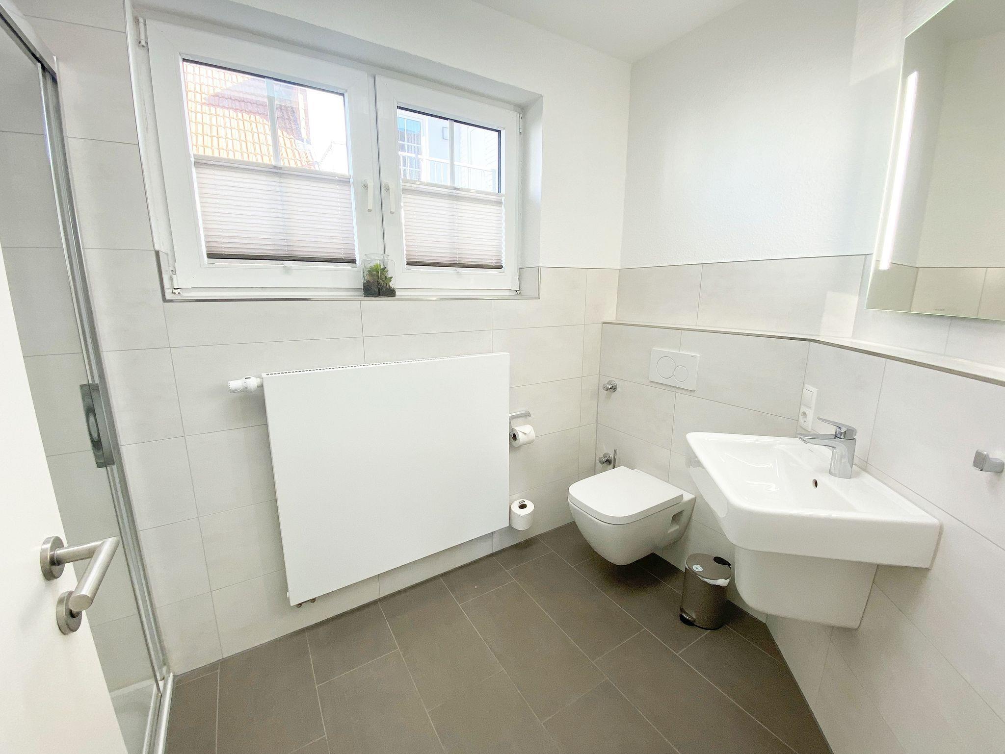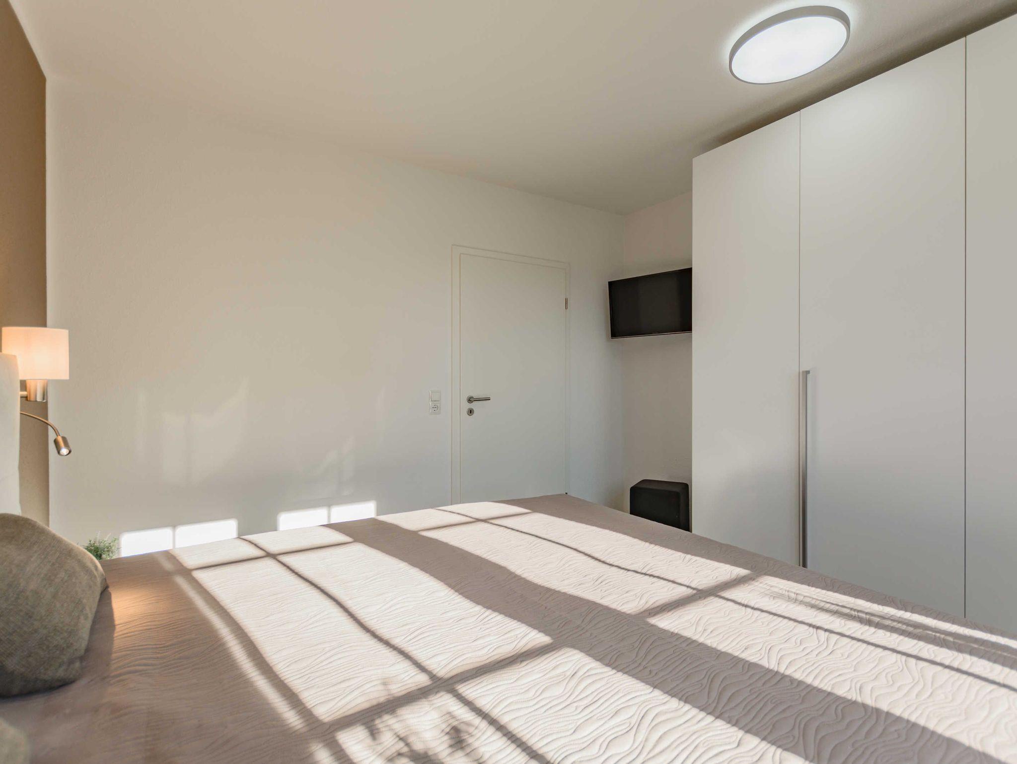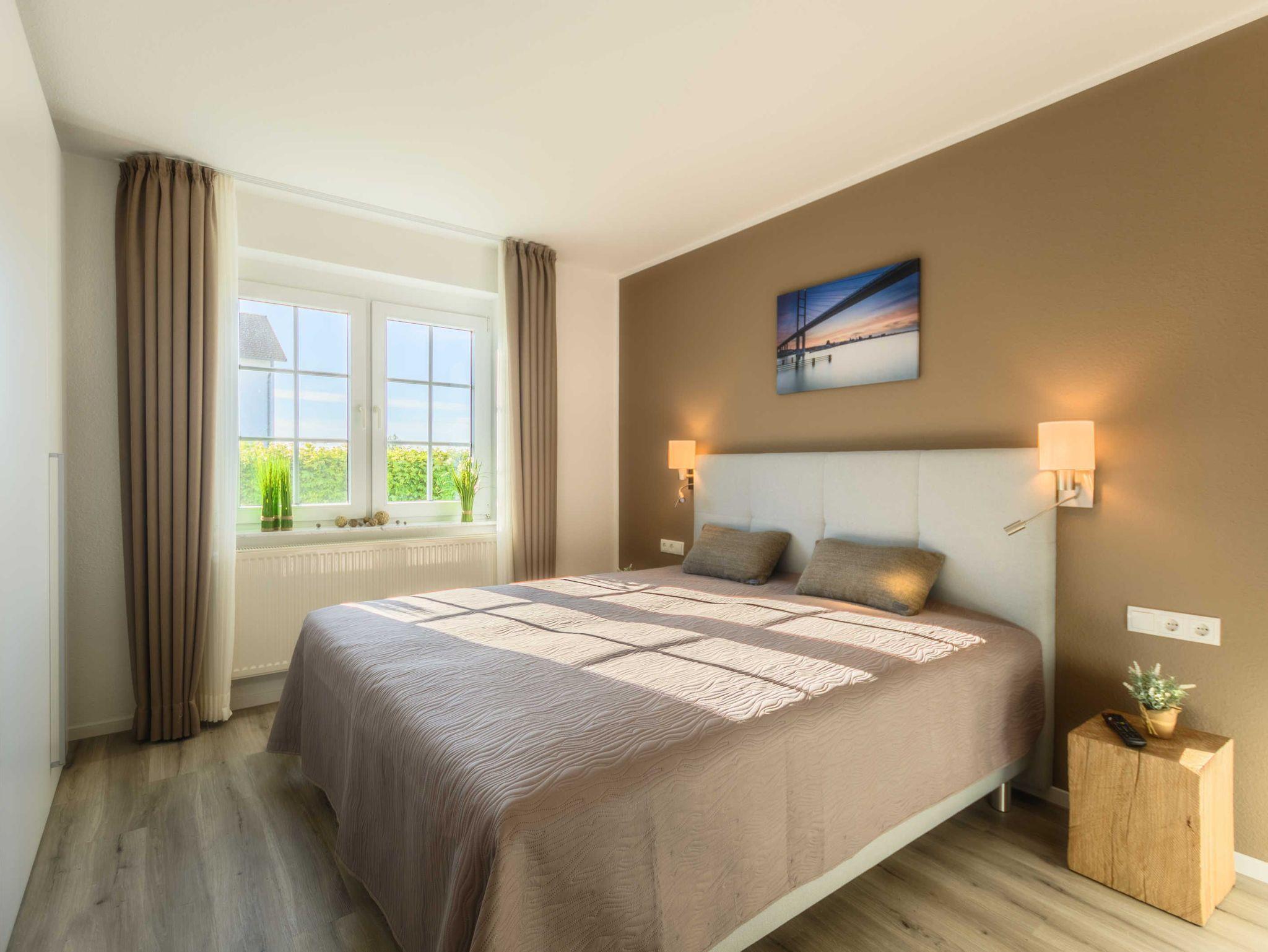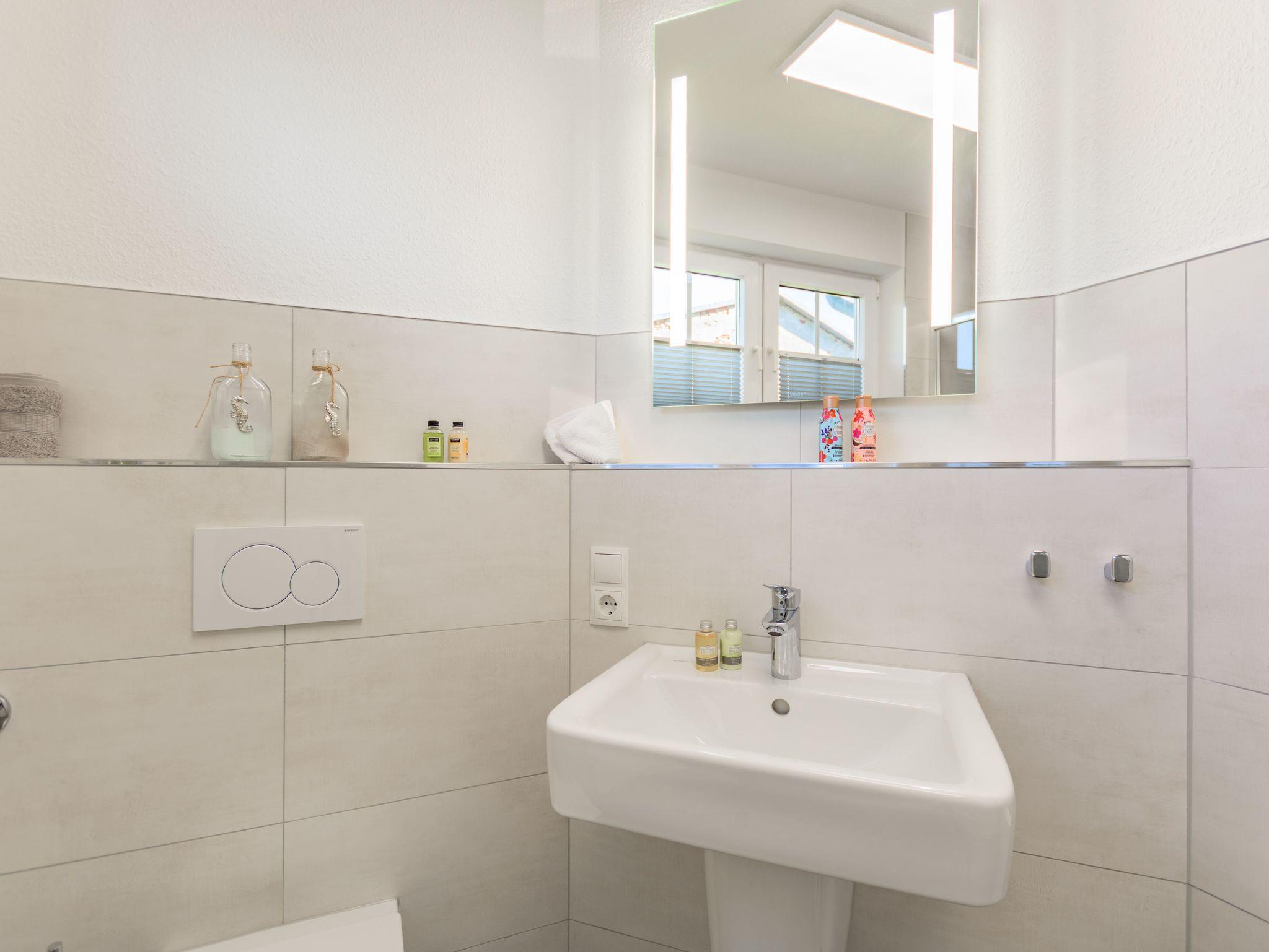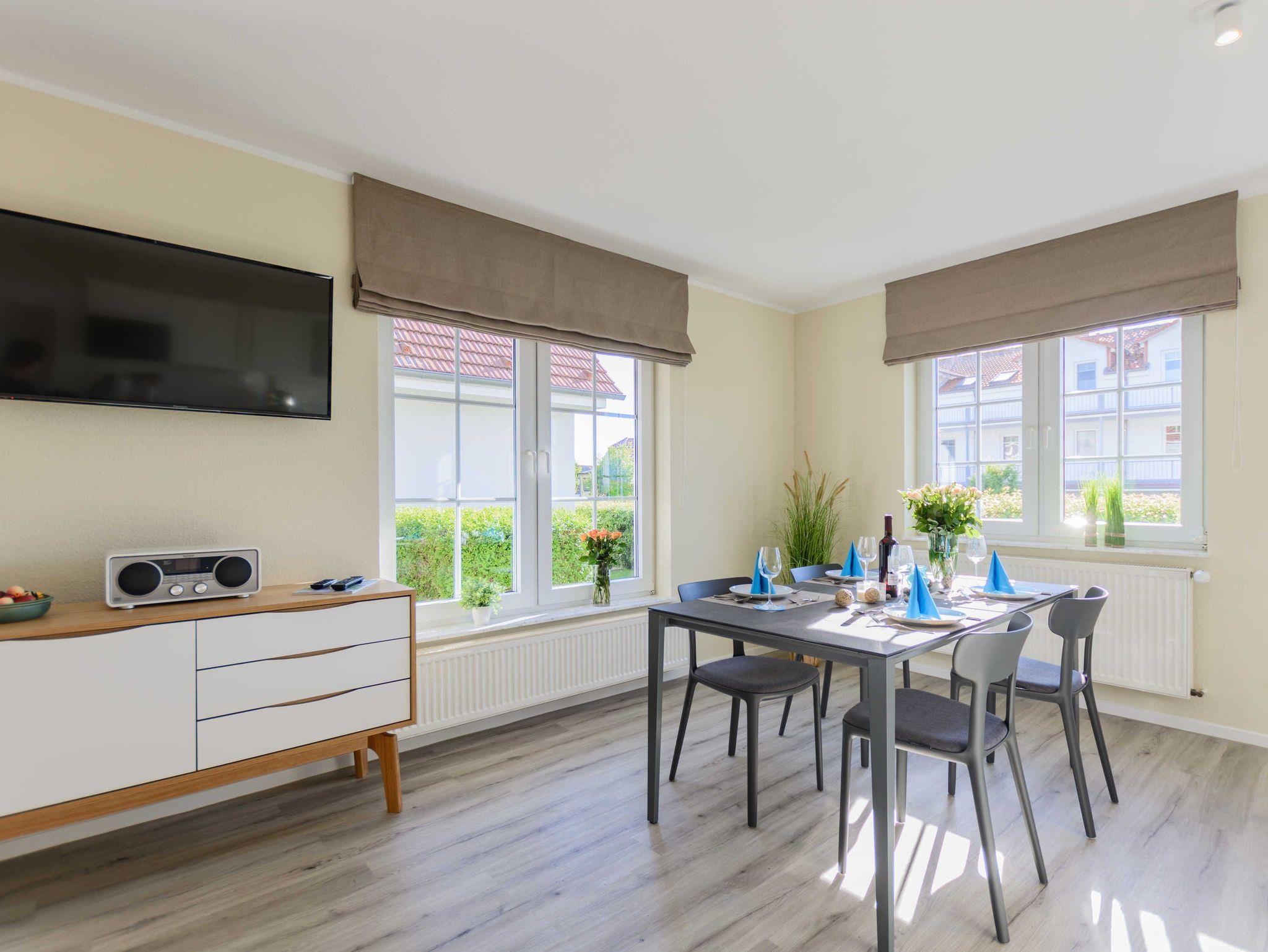 Die Nichtraucherferienwohnung befindet sich im Erdgeschoss und erstreckt sich über ca. 60 qm, wo sich max. 4 Erwachsene wohlfühlen können. Der großzügige und helle Wohn- Essbereich ist mit einer modernen Küchenzeile ausgestattet. Mit einem Kühlschrank mit Eisfach, Geschirrspüler, Cerankochfeld, Backofen, Mikrowelle, Wasserkocher, Kaffeemaschine, Toaster, Mixer, Waffeleisen können Sie Ihre gemütlichen Kochabende ganz individuell gestalten. Ein passender Essbereich rundet die Gemütlichkeit ab. Im angrenzenden Wohnbereich trägt eine bequeme Couch (Aufbettungsmöglichkeit für 3./4.Person, 1,50m x 1,95m) mit Couchtisch, ein Lesesessel mit Hocker sowie ein TV-Board zu Ihrer Entspannung bei. Die technische Ausstattung umfasst einen Smart-TV, ein DAB-Bluetooth-Radio sowie einen WLAN-Anschluss. Vom Wohnbereich gelangen Sie auf Ihre bestuhlte Terrasse (Süd) mit Sonnenschirm, von wo Sie aus Ihren Tag entspannt bei einem Glas Wein ausklingen lassen können. Hell und freundlich eingerichtet erwartet Sie ein gemütliches Schlafzimmer, mit einem komfortablen Boxspring-Bett (1,80m x 2,00m) mit 5 Zonen Tonnen-Taschenfederkern-Matratzen, Nachttischablagen, einen großzügigen Kleiderschrank sowie ein Smart-TV. Der Schlafbereich verfügt zudem über Vorhänge, die nahezu lichtundurchlässig sind und einen guten Sicht- und Sonnenschutz bieten. Für einen angenehmen Schlaf sorgen zusätzlich Insektenschutzgitter im Wohn- & Schlafbereich. Das Tageslicht-Badezimmer ist mit einer ebenerdigen Dusche, einem WC, einem Fön sowie einem Waschtisch ausgestattet. In der Wohnung finden Sie zusätzlich ein Staubsauger, ein Besen mit Kehrset, ein Wäscheständer sowie ein Wäschekorb. Im Nachbarhaus C können Sie eine Waschmaschine sowie einen Trockner gegen Gebühr nutzen. Hier stehen auch ein Bügelbrett und ein Bügeleisen zur Verfügung. Haustiere sind nicht erlaubt. Das Grillen auf dem ausgewiesenen Gemeinschaftsplatz lädt zu gemütlichen Abenden ein. Zur Entspannung lädt eine münzbetriebene Sauna mit kleinem Ruheraum im Untergeschoss von Haus B ein. Ihre Fahrräder können Sie begrenzt im Gemeinschaftskeller oder auf dem Grundstück abstellen. Ein PKW-Stellplatz steht Ihnen inklusive zur Verfügung. Die Erstausstattung eines Wäschepaketes (komplette Bettwäsche, 1 Duschhandtuch, 2 kleine Handtücher) können Sie bis 14 Tage vor Anreise gegen einen Aufpreis dazu buchen oder durch eigene ergänzen. Ab 2 gebuchten Paketen erhalten Sie einmalig 1 Geschirrhandtuch und 1 Duschvorleger hinzu.
