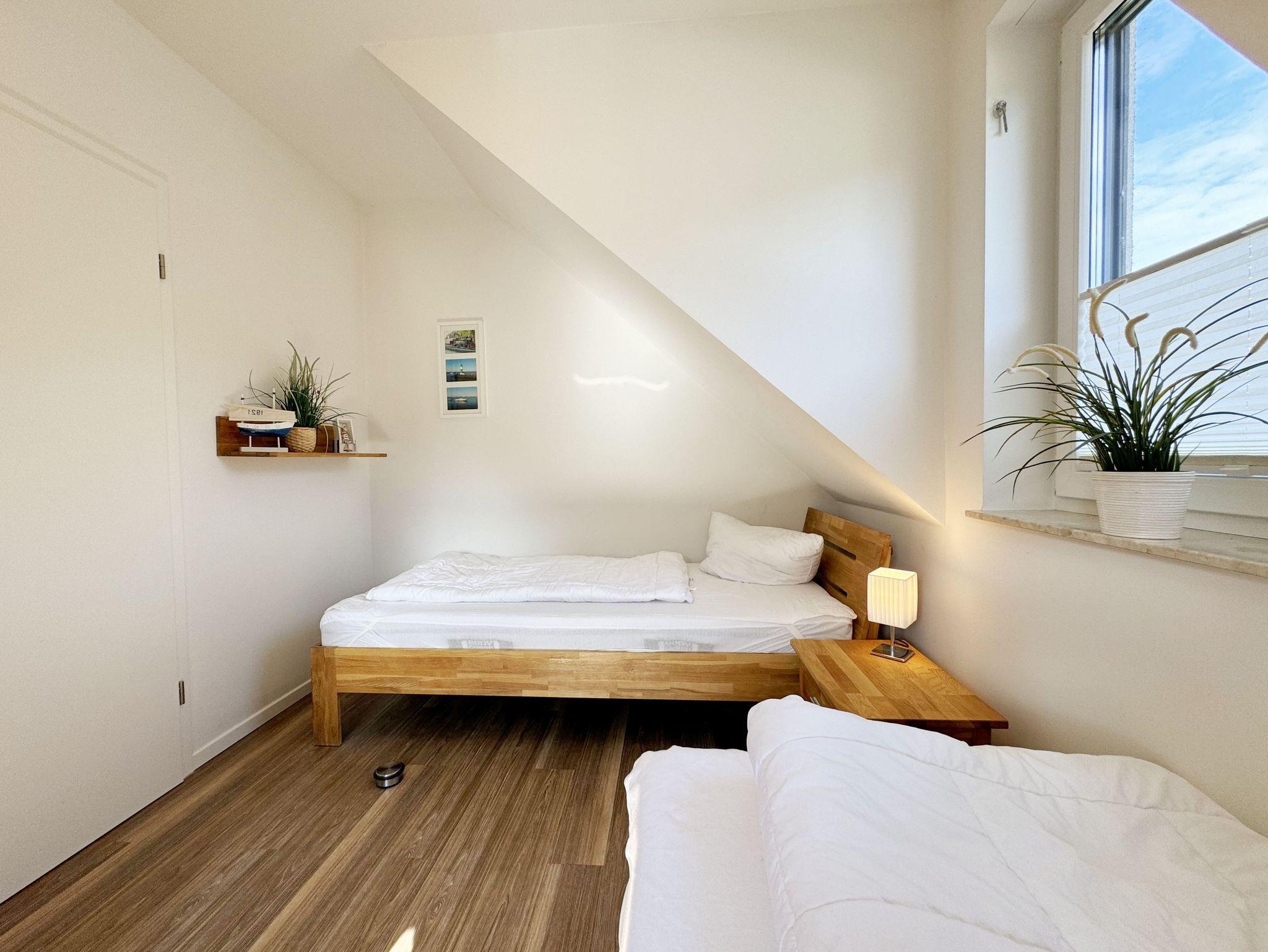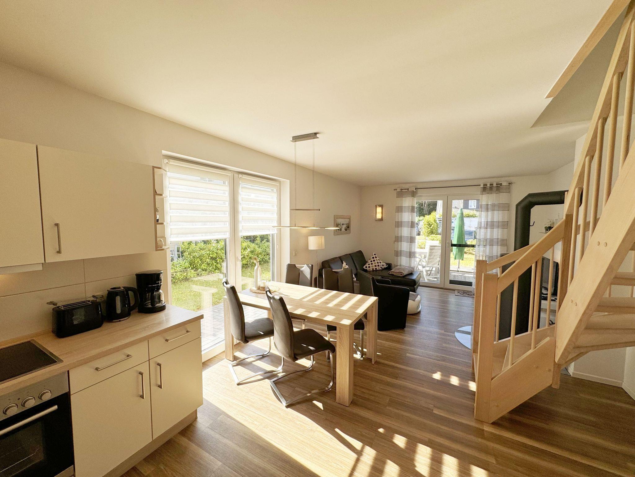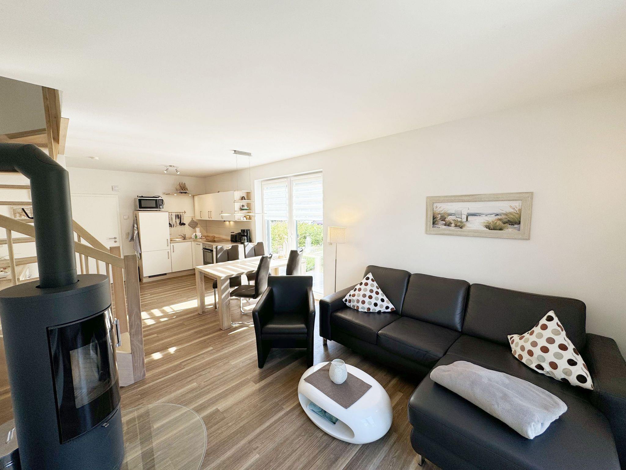 Die modern und liebevoll eingerichtete, helle Nichtraucher-Ferienwohnung im Stil einer Maisonettwohnung mit separatem Eingang für max. 4 Erwachsene und 1 Kleinkind im Kinderreisebett bis 3 Jahre, besitzt eine Grundfläche von ca. 62 m², aufgeteilt in einen Wohn-/Essbereich im Erdgeschoss und 2 Schlafzimmern im Dachgeschoss. Im Wohn- und Essbereich laden ein großer Esstisch mit 5 Stühlen und ein Leder-Ecksofa und eine Leselampe zum Verweilen ein. Genießen Sie an kühleren Tagen die wohlige Wärme des Kaminofens. Zur technischen Ausstattung gehört ein 42-Zoll Flachbildfernseher, Blu-Ray-/DVD-Player und eine Musikanlage mit DAB-Radio. Ein WLAN-Zugang zur kostenlosen Nutzung ist selbstverständlich vorhanden. In der komplett ausgestatteten Küche finden Sie ein Cerankochfeld, Backofen, Mikrowelle mit Grillfunktion, einen Geschirrspüler, Kühlschrank mit Eisfach, Toaster, Kaffeemaschine, Mixer, Wasserkocher, Waffeleisen und weitere praktische Helfer. Staubsauger, Waschmaschine, Bügeleisen, Bügelbrett und ein Wäscheständer machen die Ausstattung komplett. Im Obergeschoss finden Sie zwei Schlafzimmer, davon eines mit Doppelbett (2 x 0,90 m x 2,00 m) und eines mit zwei Einzelbetten (jeweils 0,90 m x 2,00 m). Das Schlafzimmer mit Doppelbett ist zusätzlich mit einem 32 Zoll Flachbildfernseher ausgestattet. Nachtischablagen, Kleiderschränke und Verdunklungsplissees runden die Ausstattung der Schlafzimmer ab. Im Dachgeschoss befindet sich ferner ein Tageslichtbad mit ebenerdiger Dusche, Kosmetikspiegel, Waschbecken, WC, Fön und beheizbarem Handtuchhalter. Ein weiteres Gäste-WC befindet sich im Erdgeschoss. Sämtliche Fenster im Erdgeschoss sind mit Rollläden ausgestattet, im Wohn-/Essbereich elektrisch. Die Fenster der Schlafräume verfügen über je ein Fenster mit Plissee und Rollladen und je ein kleines Fenster mit Plissee. Alle Räume sind mit einer Fußbodenheizung versehen und zum Teil auch mit Insektenschutzgitter. Eine Abstellmöglichkeit für mitgebrachte Surfbretter und Fahrräder im abschließbaren Schuppen ist vorhanden. Eine Waschmaschine steht Ihnen inklusive zur Verfügung. Freuen Sie sich auf sonnige Urlaubstage und sommerliche Abende auf der 28 qm großen Südterrasse mit Terrassenmöbeln, kleinem Grill und Sonnenschirm. Eine kleine Rasenfläche zur eigenen Nutzung und ein PKW-Stellplatz Nr. 01 befinden sich direkt vor dem Haus. Für die kleinen Gäste sind 1x Kinderreisebett (110 x 63 cm) und 1x Hochstuhl inklusive vorhanden. Haustiere sind nicht erlaubt. Die Erstausstattung eines Wäschepaketes (komplette Bettwäsche, 1 Duschhandtuch, 2 kleine Handtücher) können Sie bis 14 Tage vor Anreise gegen einen Aufpreis dazu buchen oder durch eigene ergänzen. Ab 2 gebuchten Paketen erhalten Sie einmalig 1 Geschirrhandtuch und 1 Duschvorleger hinzu.