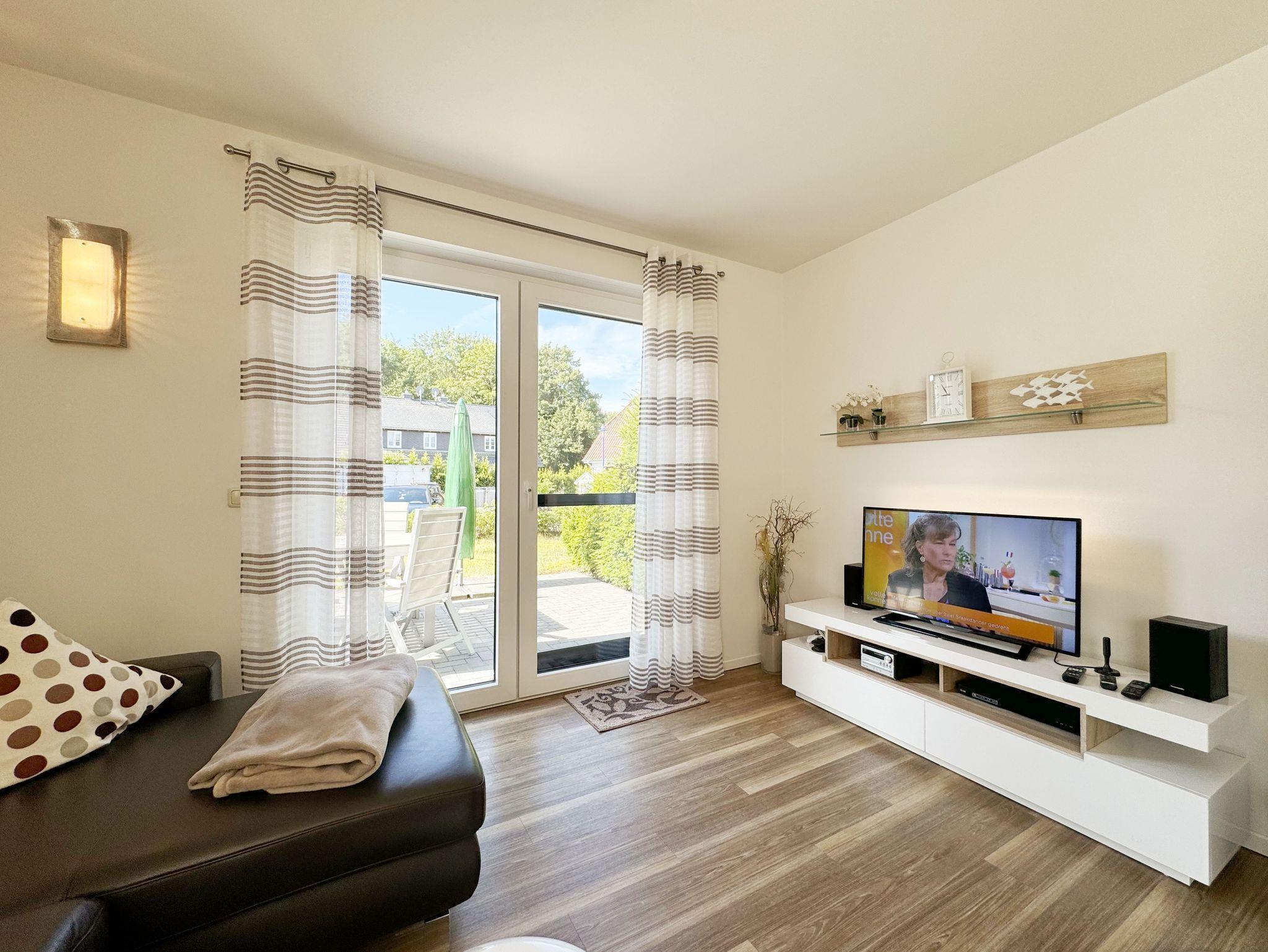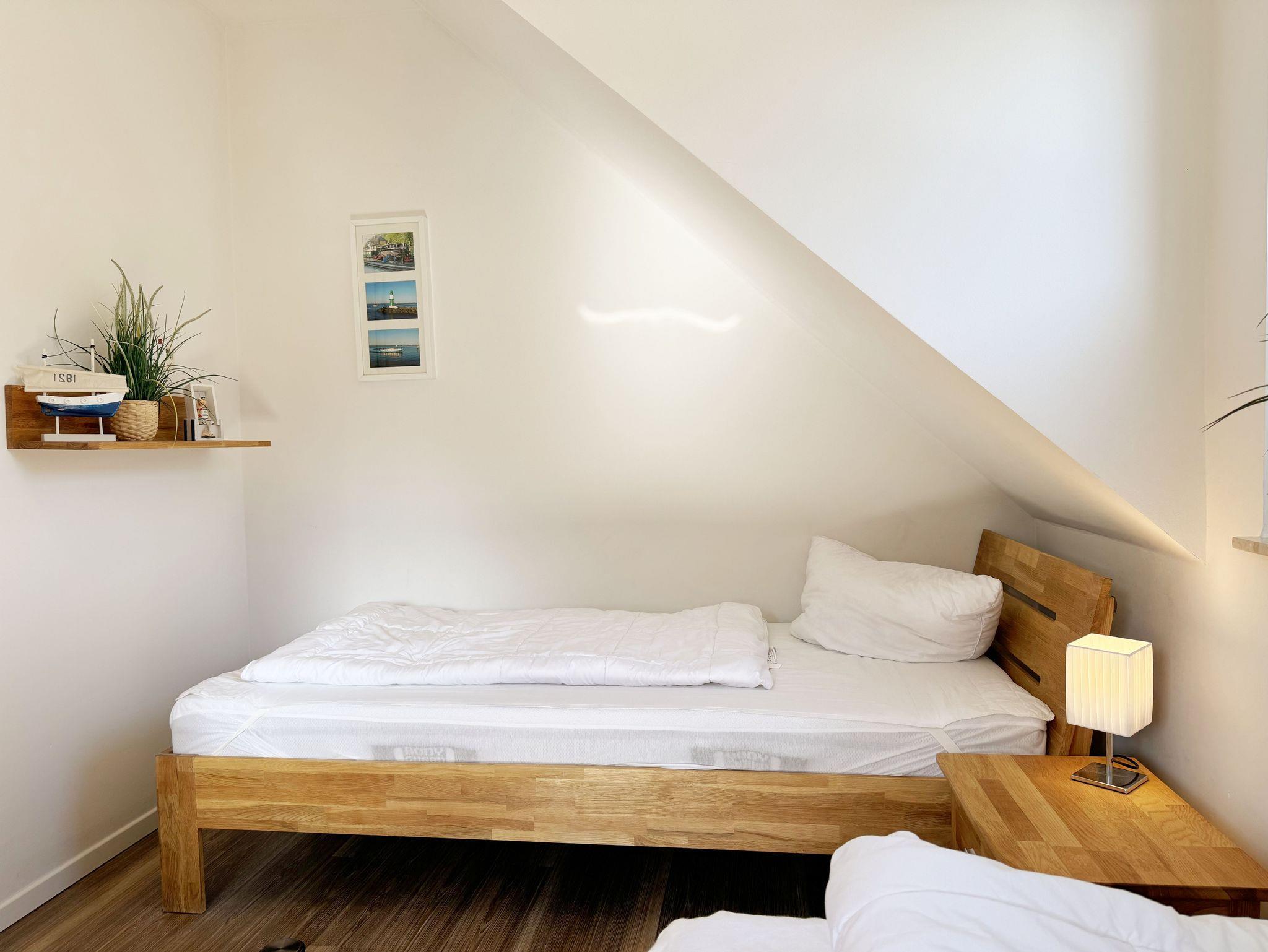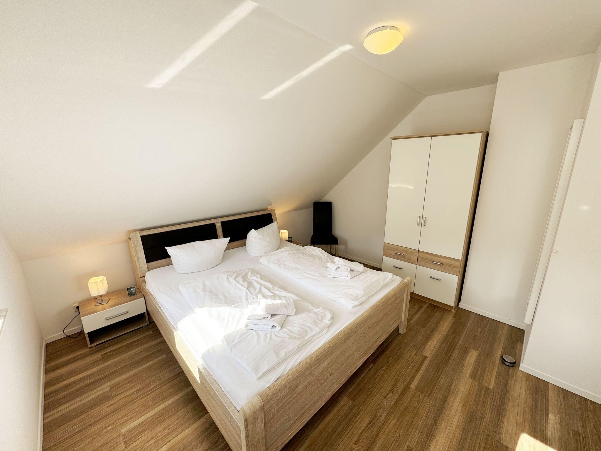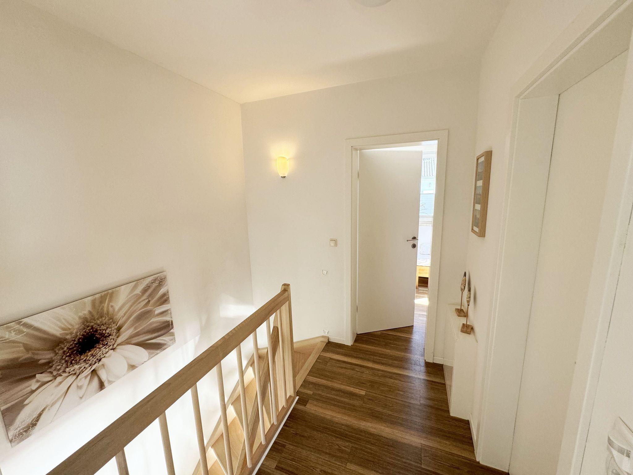 Die modern und liebevoll eingerichtete, helle Nichtraucher-Ferienwohnung im Stil einer Maisonettwohnung mit separatem Eingang für max. 4 Erwachsene und 1 Kleinkind im Kinderreisebett bis 3 Jahre, besitzt eine Grundfläche von ca. 62 m², aufgeteilt in einen Wohn-/Essbereich im Erdgeschoss und 2 Schlafzimmern im Dachgeschoss. Im Wohn- und Essbereich laden ein großer Esstisch mit 5 Stühlen und ein Leder-Ecksofa und eine Leselampe zum Verweilen ein. Genießen Sie an kühleren Tagen die wohlige Wärme des Kaminofens. Zur technischen Ausstattung gehört ein 42-Zoll Flachbildfernseher, Blu-Ray-/DVD-Player und eine Musikanlage mit DAB-Radio. Ein WLAN-Zugang zur kostenlosen Nutzung ist selbstverständlich vorhanden. In der komplett ausgestatteten Küche finden Sie ein Cerankochfeld, Backofen, Mikrowelle mit Grillfunktion, einen Geschirrspüler, Kühlschrank mit Eisfach, Toaster, Kaffeemaschine, Mixer, Wasserkocher, Waffeleisen und weitere praktische Helfer. Staubsauger, Waschmaschine, Bügeleisen, Bügelbrett und ein Wäscheständer machen die Ausstattung komplett. Im Obergeschoss finden Sie zwei Schlafzimmer, davon eines mit Doppelbett (2 x 0,90 m x 2,00 m) und eines mit zwei Einzelbetten (jeweils 0,90 m x 2,00 m). Das Schlafzimmer mit Doppelbett ist zusätzlich mit einem 32 Zoll Flachbildfernseher ausgestattet. Nachtischablagen, Kleiderschränke und Verdunklungsplissees runden die Ausstattung der Schlafzimmer ab. Im Dachgeschoss befindet sich ferner ein Tageslichtbad mit ebenerdiger Dusche, Kosmetikspiegel, Waschbecken, WC, Fön und beheizbarem Handtuchhalter. Ein weiteres Gäste-WC befindet sich im Erdgeschoss. Sämtliche Fenster im Erdgeschoss sind mit Rollläden ausgestattet, im Wohn-/Essbereich elektrisch. Die Fenster der Schlafräume verfügen über je ein Fenster mit Plissee und Rollladen und je ein kleines Fenster mit Plissee. Alle Räume sind mit einer Fußbodenheizung versehen und zum Teil auch mit Insektenschutzgitter. Eine Abstellmöglichkeit für mitgebrachte Surfbretter und Fahrräder im abschließbaren Schuppen ist vorhanden. Eine Waschmaschine steht Ihnen inklusive zur Verfügung. Freuen Sie sich auf sonnige Urlaubstage und sommerliche Abende auf der 28 qm großen Südterrasse mit Terrassenmöbeln, kleinem Grill und Sonnenschirm. Eine kleine Rasenfläche zur eigenen Nutzung und ein PKW-Stellplatz Nr. 01 befinden sich direkt vor dem Haus. Für die kleinen Gäste sind 1x Kinderreisebett (110 x 63 cm) und 1x Hochstuhl inklusive vorhanden. Haustiere sind nicht erlaubt. Die Erstausstattung eines Wäschepaketes (komplette Bettwäsche, 1 Duschhandtuch, 2 kleine Handtücher) können Sie bis 14 Tage vor Anreise gegen einen Aufpreis dazu buchen oder durch eigene ergänzen. Ab 2 gebuchten Paketen erhalten Sie einmalig 1 Geschirrhandtuch und 1 Duschvorleger hinzu.