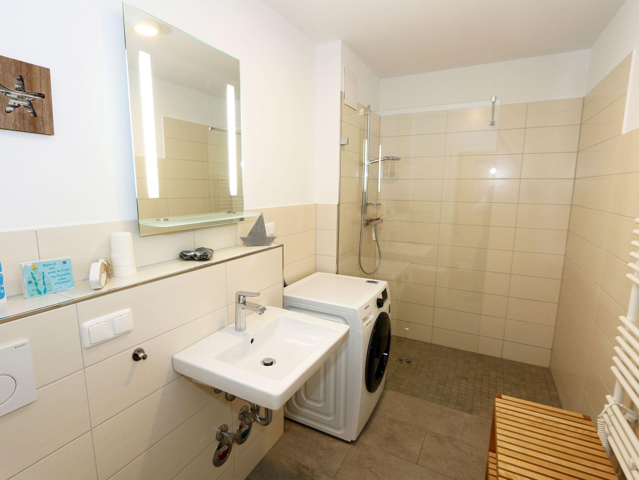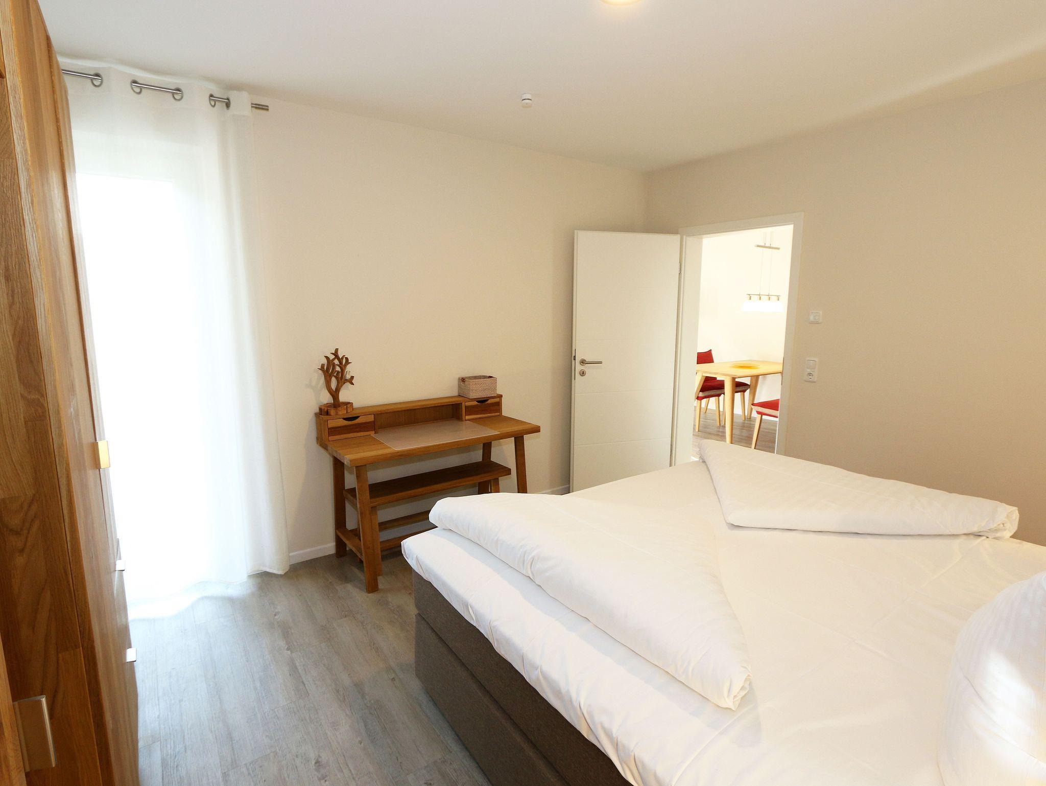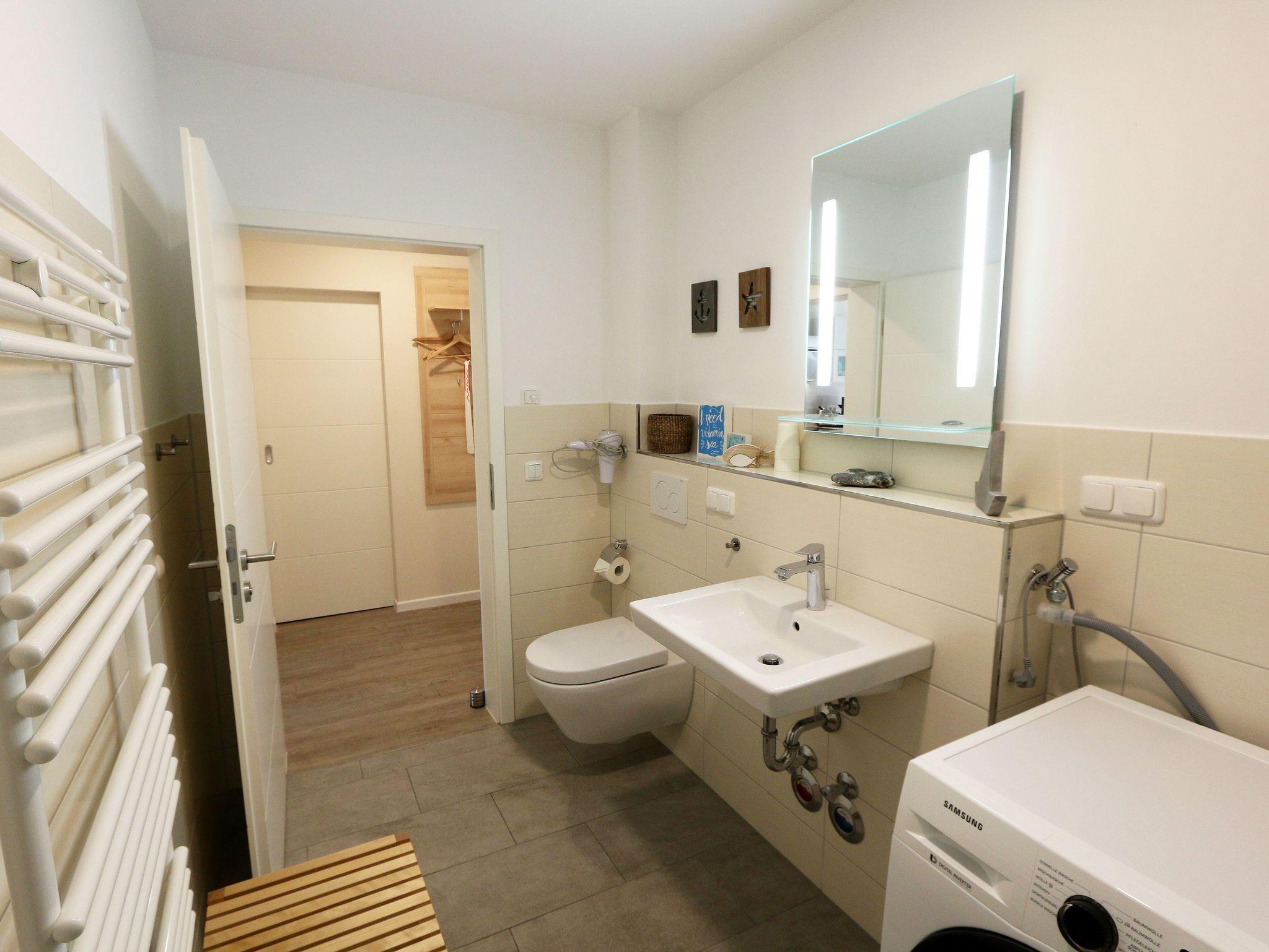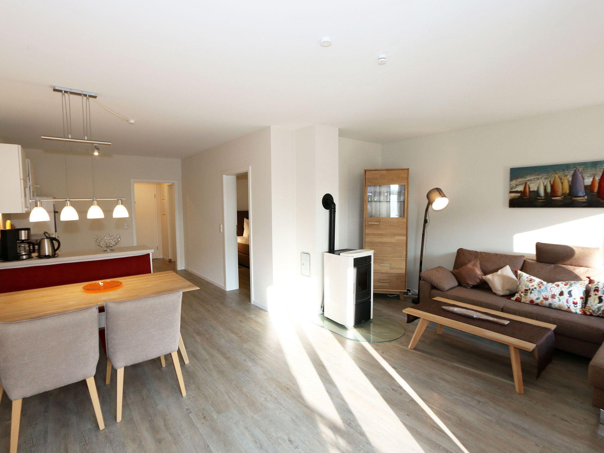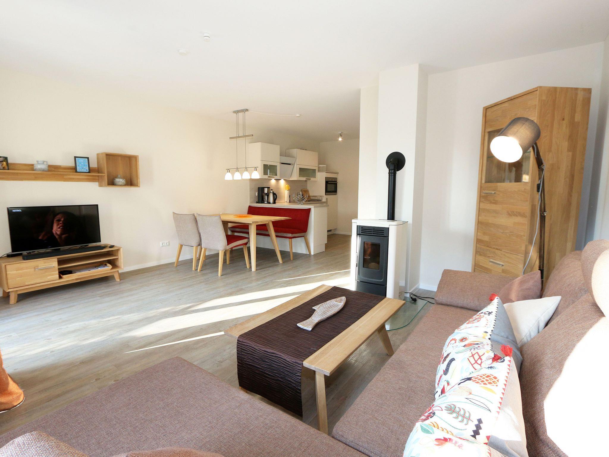 Die geschmackvolle im Erdgeschoß liegende Nichtraucherwohnung bietet Ihnen mit Ihren ca. 78qm ausreichend Platz für max. 2 bis 3 Erwachsene + 1 Kleinkind bis 3 Jahre im Kinderreisebett. Der offene, in maritimen Farben eingerichtete Wohnbereich ist mit hochwertigen und modernen Massivholzmöbeln ausgestattet. Eine Couch (Aufbettung für 3.Person 0,90m x 2,00m), ein Couchtisch, zwei Leselampe, ein Kamin Pelletofen für die kältere Jahreszeit, ein TV-Board mit Smart-TV sowie eine Bose Soundbar runden den Wohnbereich ab. Auch auf einen Internetanschluss (WLAN) müssen Sie nicht verzichten und somit können Sie die gängigen Streamingdienste am Smart-TV mit Ihrem Zugang nutzen. Dieser ist für Sie inklusive. Die angrenzende Küchenzeile passt sich dem Raum mit einem bequemen Essbereich an. Durch einen Kühlschrank mit Gefrierfach, eine Spülmaschine, einen Backofen, einem 4 Zonen-Cerankochfeld, eine Kaffeemaschine mit Thermoskanne, Nespresso Maschine mit Aufschäumer, einen Toaster, einen Wasserkocher und diverse Küchenhelfer lässt die Ausstattung für die gemeinsamen Mahlzeiten keine Wünsche offen. Auf die große und bestuhlte Terrasse mit Sonnenschirm und einem Weber-Holzkohlegrill, welche einmal nach Osten und nach Süden ausgerichtet ist, gelangen Sie vom Wohnbereich. Hier können Sie nicht nur in Ruhe Ihre Mahlzeiten genießen, sondern auch den Tag bei einem Glas Wein ausklingen lassen. Der dazugehörige kleine Garten kann gerne für ein König Spiel oder ein Federball Match genutzt werden oder einfach nur zum Genießen. Das Schlafzimmer ist mit einem Boxspringbett (1,80m x 2,00m), durchgehendem Topper, Nachttischablagen, einem Kosmetiktisch, Kleiderablage, sowie einem Kleiderschrank ausgestattet. Für einen ruhigen und angenehmen Schlaf sorgen zudem die Insektenschutzrollos sowie die Fensterläden, welche Sie auch in den anderen Räumlichkeiten wiederfinden. Das innenliegende Bad verfügt über eine ebenerdige Regendusche, einen Waschtisch, ein WC, einen Kosmetikspiegel, eine Waschmaschine, einen Fön und beheizbaren Handtuchtrockner. Alle Räumlichkeiten sind mit einer Fußbodenheizung versehen und sorgen somit für ein angenehmes Raumklima. Im wohnungseigenen Abstellraum befindet sich ein Wäscheständer, ein Staubsauger sowie weitere Reinigungshelfer. Gerne darf Ihr 4-Beiner mit eigenem Schlafplatz gegen eine Gebühr mitreisen. Ein PKW-Stellplatz (Nr. 02) befindet sich direkt vor dem Haus. Im dazugehörigen Schuppen (Nr.02) können Sie gerne Ihre mitgebrachten Fahrräder unterstellen und Ihre E-Bikes aufladen. Die Erstausstattung eines Wäschepaketes (komplette Bettwäsche, 1 Duschhandtuch, 2 kleine Handtücher) können Sie bis 14 Tage vor Anreise gegen einen Aufpreis dazu buchen oder durch eigene ergänzen. Ab 2 gebuchten Paketen erhalten Sie einmalig 1 Geschirrhandtuch und 1 Duschvorleger hinzu.