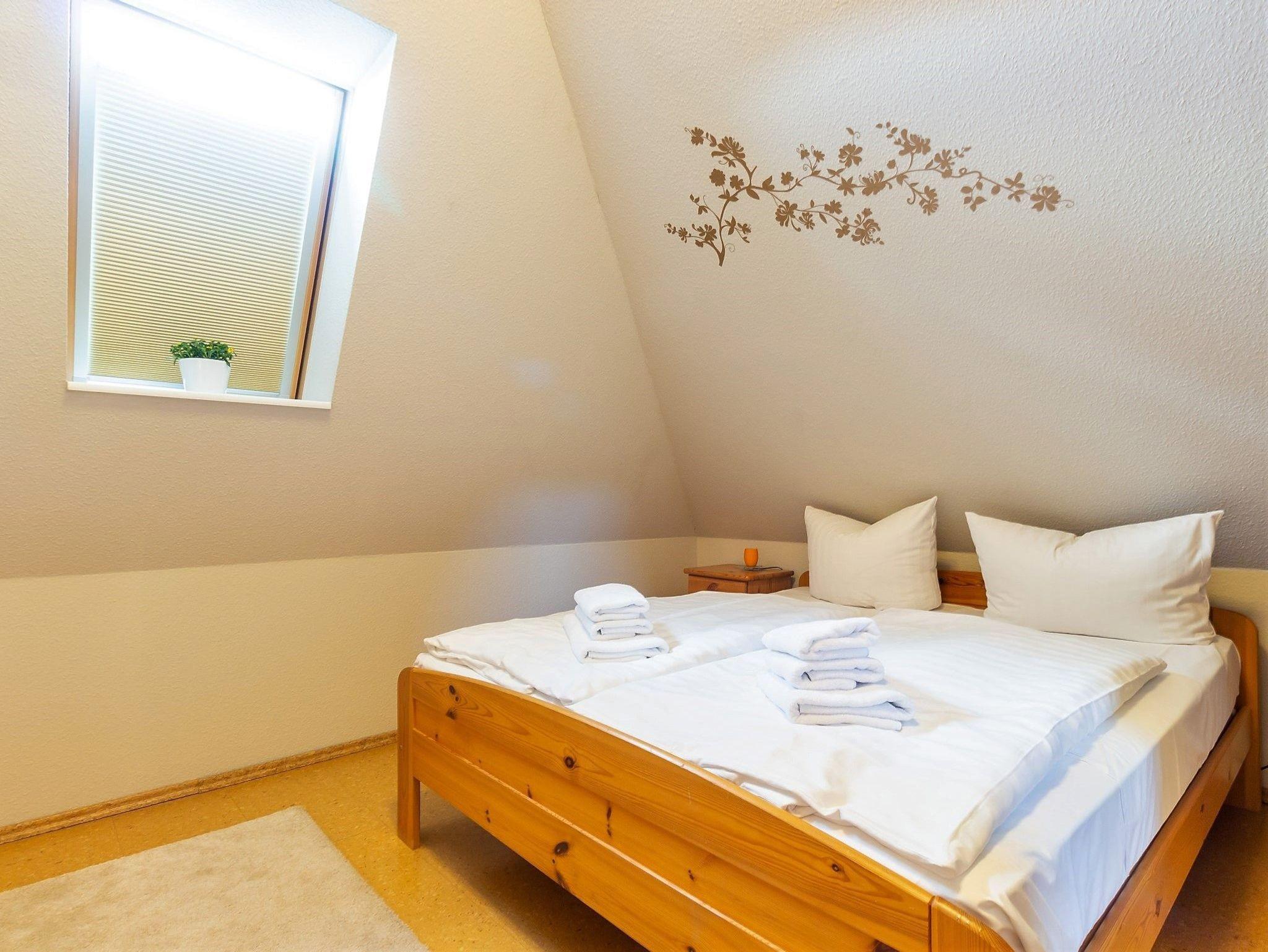 Die Wohnung ist eine Maisonette-Wohnung und besitzt 3 Schlafzimmer (2xDoppelbett, 2 Einzelbetten) und 2 komfortable Duschbäder und hat eine Größe von 115 qm. Ein Wohnzimmer und eine Küche in offener Bauweise mit offenem Kamin. Auf dem windgeschützten Südwestbalkon mit Blick zum Bodden können Sie den Tag genießen. Ausgestattet ist der Balkon mit einem Tisch, 4 Stühlen, Markise sowie einen Hochlehnstuhl mit Liegemöglichkeit. Auf der ersten Ebene sind alle Räume gefliest bis auf das Schlafzimmer, dort liegt Korkboden. In der zweiten Ebene ist das Bad gefliest, ein Schlafzimmer hat Teppichboden, der Flur und das größere Schlafzimmer haben ebenfalls Korkböden. Alle Schlafzimmer können verdunkelt werden. Fliegengitter sind zur Giebelseite an allen Fenstern vorhanden. Die Wohnung hat eine Zentralheizung und im Bad in der ersten Ebene ist ein großer Handtuchheizkörper sowie eine Fußbodenheizung. Einen Kfz-Stellplatz befindet sich unter dem Carport.