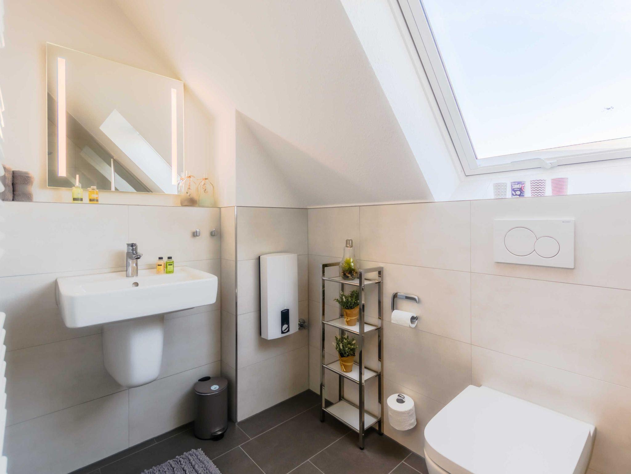 Die Nichtraucherferienwohnung befindet sich in der 1. Etage und erstreckt sich über 2 Etagen. Mit Ihren ca. 75 qm können sich max. 6 Erwachsene wohlfühlen. Der großzügige und helle Wohn- Essbereich ist mit einer modernen Küchenzeile ausgestattet. Mit einem Kühlschrank mit Eisfach, Geschirrspüler, Cerankochfeld, Backofen, Mikrowelle, Wasserkocher, Kaffeemaschine, Toaster, Mixer, Waffeleisen können Sie Ihre gemütlichen Kochabende ganz individuell gestalten. Ein passender Essbereich rundet die Gemütlichkeit ab. Im angrenzenden Wohnbereich trägt eine bequeme Couch (Aufbettungsmöglichkeit für 5./6.Person, 1,50m x 1,95m) mit Couchtisch, ein Lesesessel mit Hocker sowie ein TV-Board zu Ihrer Entspannung bei. Die technische Ausstattung umfasst einen Smart-TV, ein DAB-Bluetooth-Radio sowie einen WLAN-Anschluss. Vom Wohnbereich gelangen Sie auf Ihren bestuhlten Balkon (Süd) mit Sonnenschirm, von wo Sie aus Ihren Tag entspannt bei einem Glas Wein ausklingen lassen können. Hell und freundlich eingerichtet erwartet Sie ein gemütliches Schlafzimmer auf gleicher Ebene, mit einem komfortablen Boxspring-Bett (1,80m x 2,00m) mit 5 Zonen Tonnen-Taschenfederkern-Matratzen, Nachttischablagen, einen großzügigen Kleiderschrank sowie ein Smart-TV. Das 2. Schlafzimmer erreichen Sie durch eine Treppe, welche vom Wohnbereich aus startet. Hier befindet sich ebenfalls ein bequemes Boxspringbett (1,80m x 2,00m) mit Nachttischablagen sowie einer kleinen Leseecke oder Relax-Ecke. Beide Schlafbereiche verfügen zudem über Vorhänge/Rollos, die nahezu lichtundurchlässig sind und einen guten Sicht- und Sonnenschutz bieten. Für einen angenehmen Schlaf sorgen zusätzlich Insektenschutzgitter im Wohn- & Schlafbereich. Das Tageslicht-Badezimmer ist mit einer ebenerdigen Dusche, einem WC, einen Handtuchtrockner, einem Fön sowie einem Waschtisch ausgestattet. In der Wohnung finden Sie zusätzlich ein Staubsauger, ein Besen mit Kehrset, ein Wäscheständer sowie ein Wäschekorb. Im Nachbarhaus C können Sie eine Waschmaschine sowie einen Trockner gegen Gebühr nutzen. Hier stehen auch ein Bügelbrett und ein Bügeleisen zur Verfügung. Haustiere sind nicht erlaubt. Das Grillen auf dem ausgewiesenen Gemeinschaftsplatz lädt zu gemütlichen Abenden ein. Zur Entspannung lädt eine münzbetriebene Sauna mit kleinem Ruheraum im Untergeschoss von Haus B ein. Ihre Fahrräder können Sie begrenzt im Gemeinschaftskeller oder auf dem Grundstück abstellen. Ein PKW-Stellplatz steht Ihnen inklusive zur Verfügung. Die Erstausstattung eines Wäschepaketes (komplette Bettwäsche, 1 Duschhandtuch, 2 kleine Handtücher) können Sie bis 14 Tage vor Anreise gegen einen Aufpreis dazu buchen oder durch eigene ergänzen. Ab 2 gebuchten Paketen erhalten Sie einmalig 1 Geschirrhandtuch und 1 Duschvorleger hinzu.