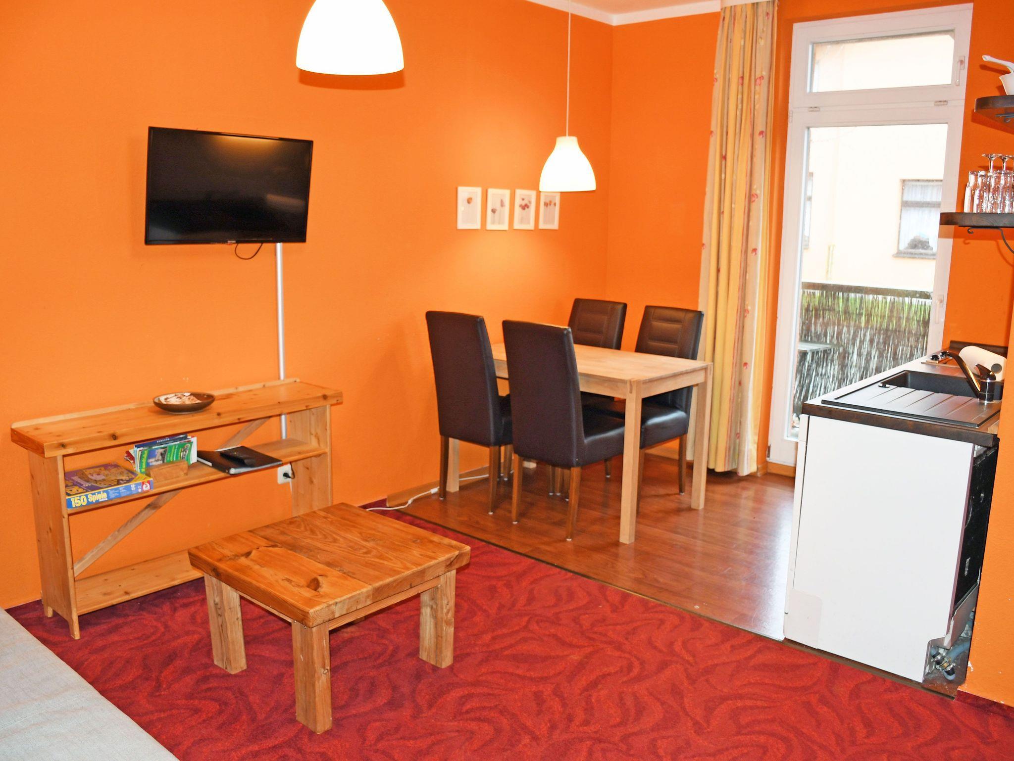 Im kombinierten Wohn-/Küchenbereich befinden sich ein Schlafsofa, welches ausgeklappt Platz für 2 Erwachsene bietet, ein Tisch und ein TV-Gerät. Hier steht auch ein Esstisch mit 4 Stühlen.