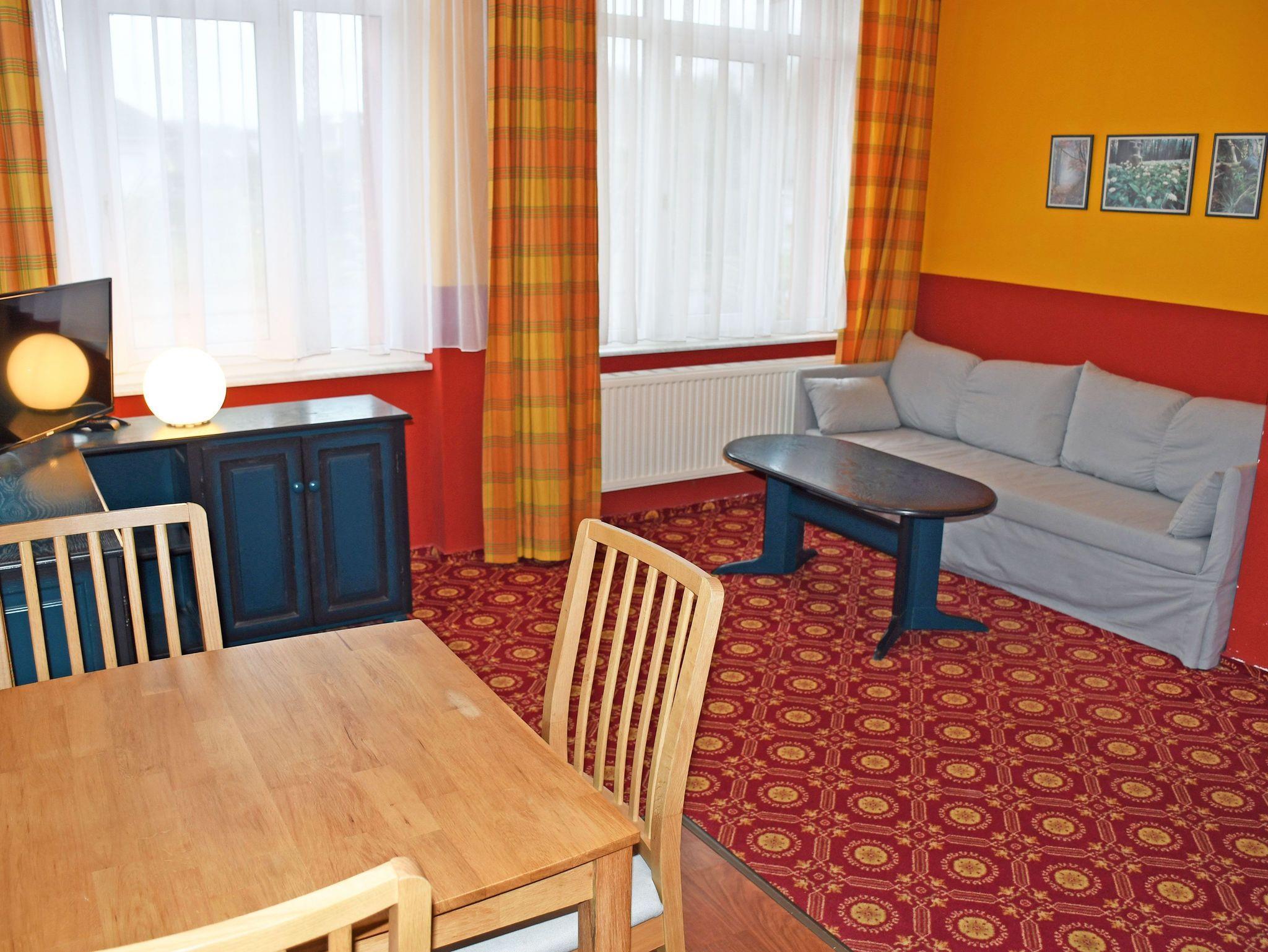 Im kombinierten Wohn-/Schlafraum befinden sich ein bequemes Doppelbett mit Nachttischen und Leselampen sowie ein Kleiderschrank, eine Schlafcouch mit Tisch und ein TV-Gerät. Hier steht auch ein Esstisch mit Stühlen.