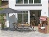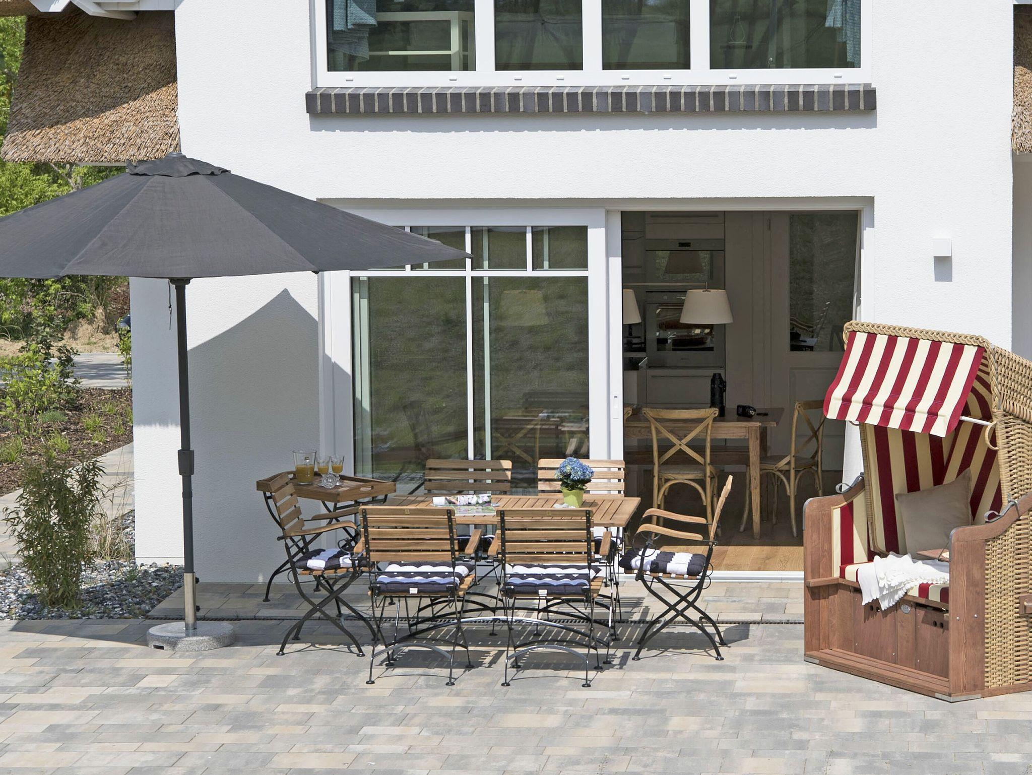Die großzügige eigene Terrasse ist nach Süden ausgerichtet. Entspannen Sie im komfortablen Strandkorb und genießen Sie den herrlichen Blick auf den gemeinschaftlich nutzbaren Garten mit Grillplatz und auf das dahinterliegende Naturschutzgebiet. Die Terrasse ist weiterhin mit einem Sonnenschirm, einem großen (130x80 cm) und einem kleinen Terrassenholztisch (80x80 cm) mit passenden Stühlen bestens ausgestattet.