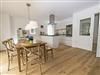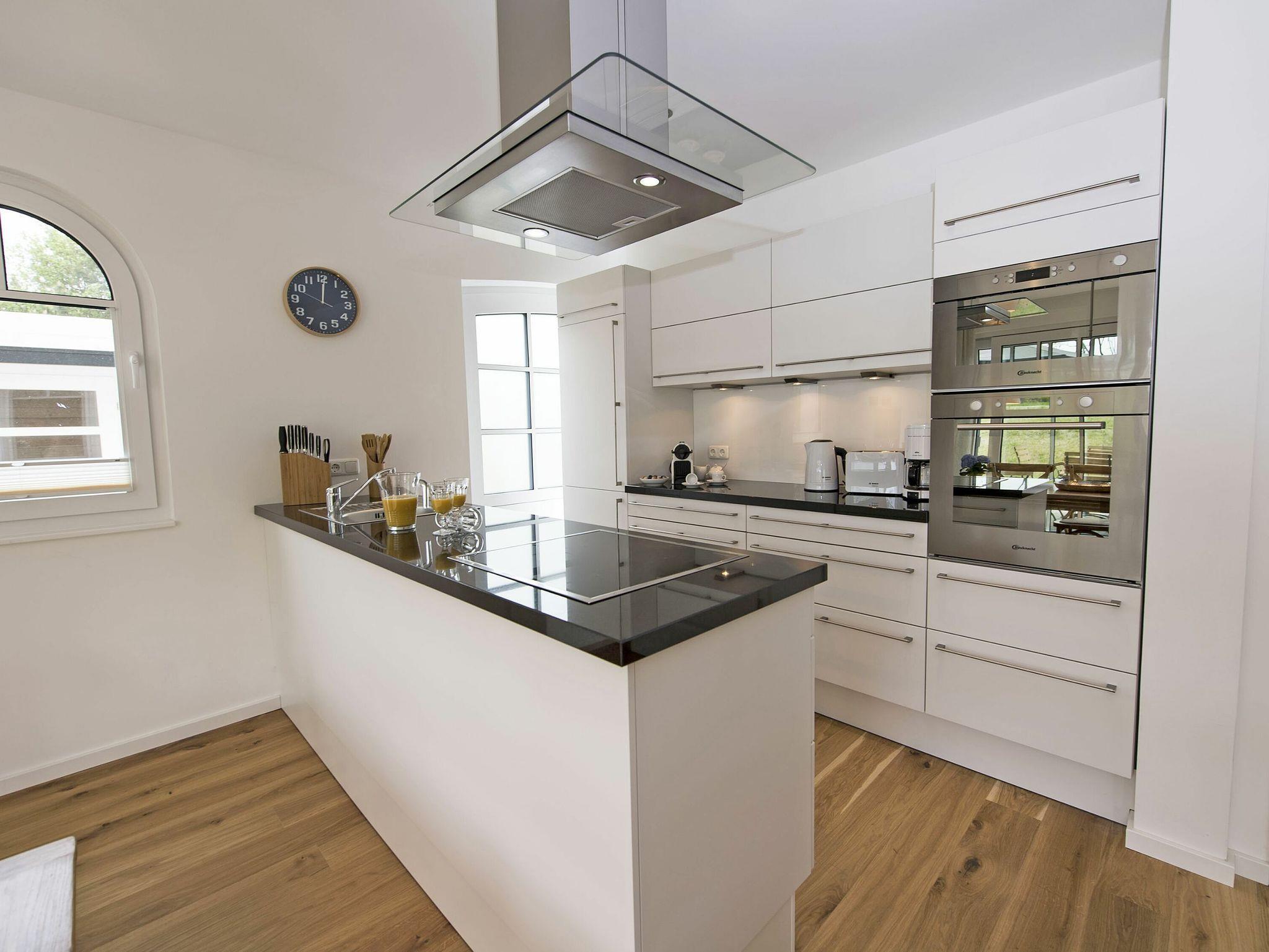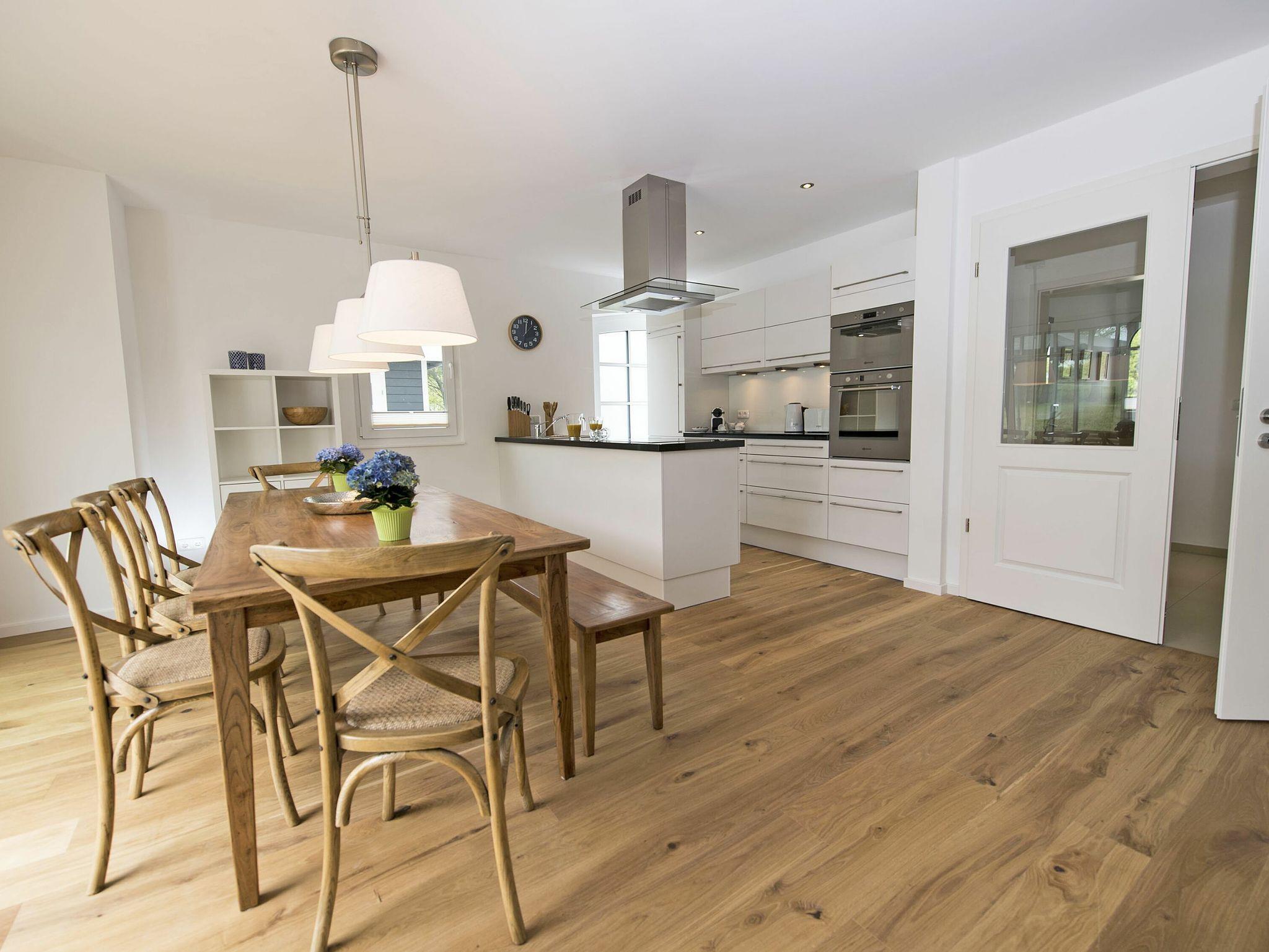 Die harmonisch im Wohnbereich integrierte Küchenzeile mit einem Backofen, einer Mikrowelle, einem Geschirrspüler, einem großen Kühlschrank mit Gefrierfach, einer Kaffeemaschine, einer Krups-Nespresso-Maschine für Kaffeespezialitäten, Toaster, Wasserkocher und diversen Kleininventar lässt das Herz jeden Hobbykochs höher schlagen. Eine freistehende Kochinsel und ein großer Ulmenholztisch mit 5 Stühlen und Sitzbank rundet das Wohnküchenflair ab.