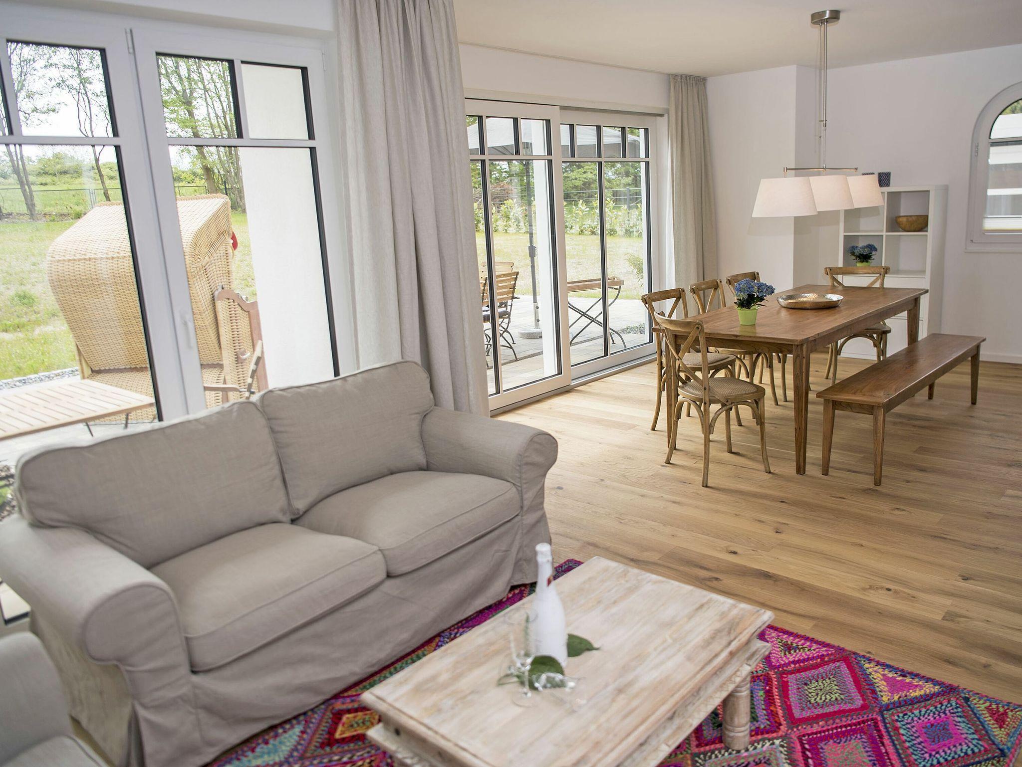 Der großzügige und lichtdurchflutete Wohn- und Essbereich mit direktem Blick ins Naturschutzgebiet befindet sich im Erdgeschoss. Das Wohnzimmer ist mit zwei gemütlichen Sofas und einem Flachbild-TV mit DVD/CD-Player ausgestattet. In den kühleren Jahreszeiten verbreitet der im Wohnzimmer eingebaute Kamin eine besonders behagliche Atmosphäre.