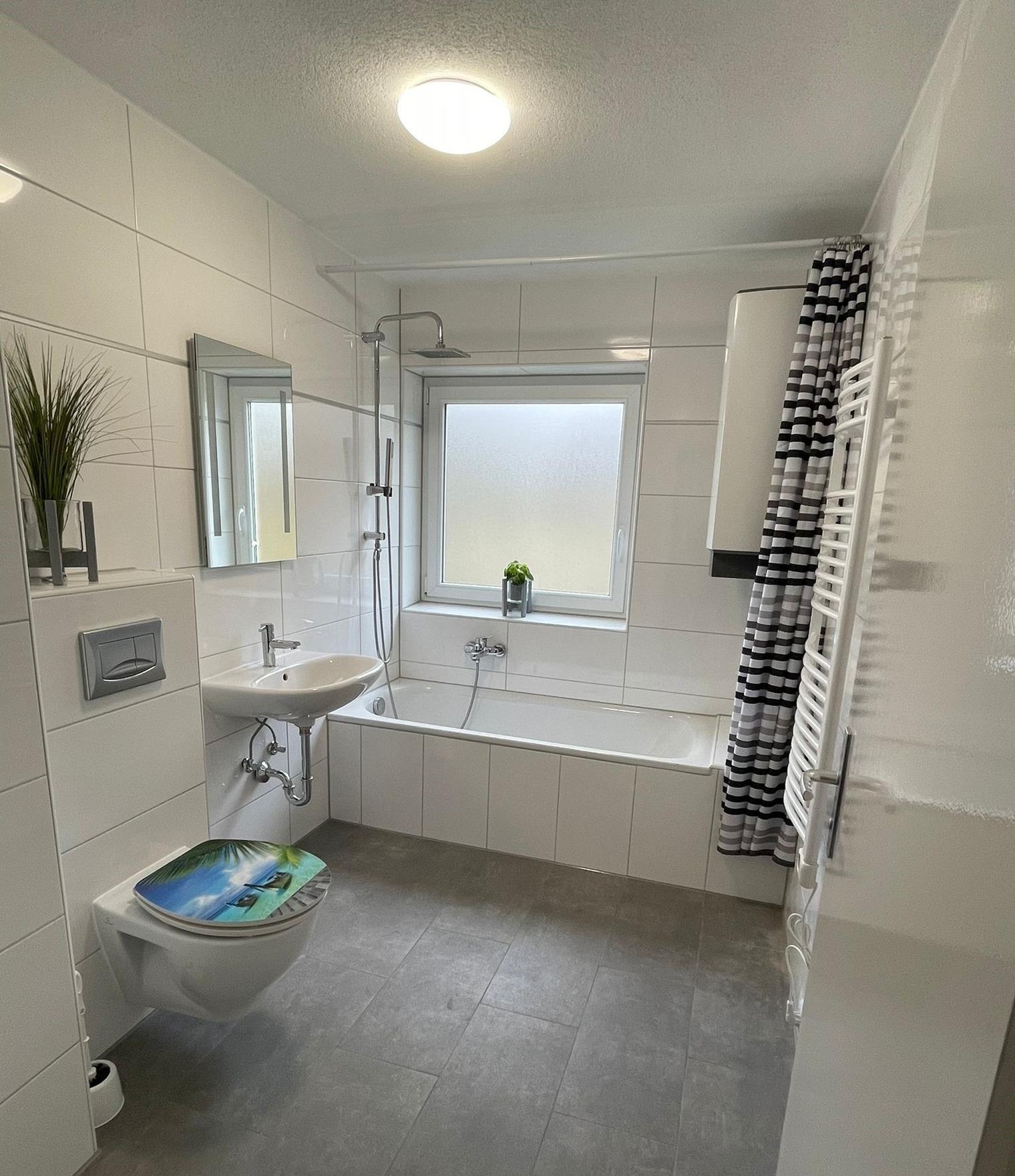Das Badezimmer mit Badewanne lädt zum entspannten Verweilen ein. Aber auch ein schnelles Duschen ist unter der Regendusche möglich.