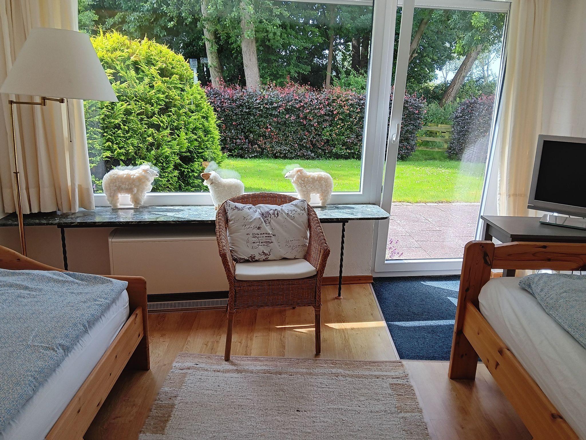 Im Ferienhaus Haus Noorblick befindet sich ebenerdig ein Schlafzimmer mit 2 Betten und der Zugang zur Terrasse und dem Garten, sowie ein Gästebad und ein Hauswirtschaftsraum mit Wach- und Trockenmaschine, sowie einer Tiefkühltruhe.