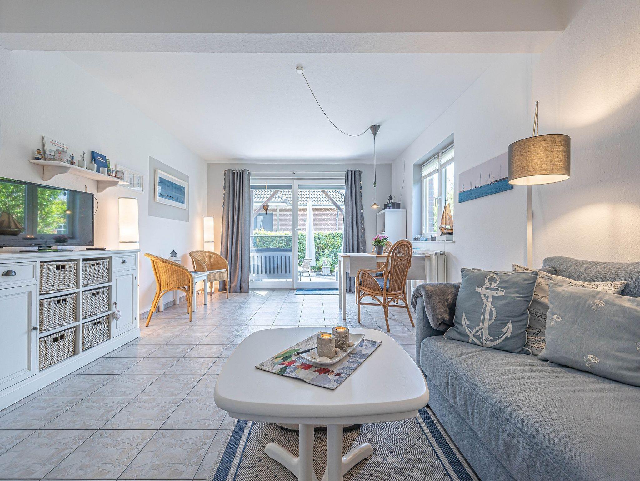 - Wohnzimmer mit SAT-TV-Anschluss, Schlafsofa, Essbereich und direktem Zugang zu Terrasse