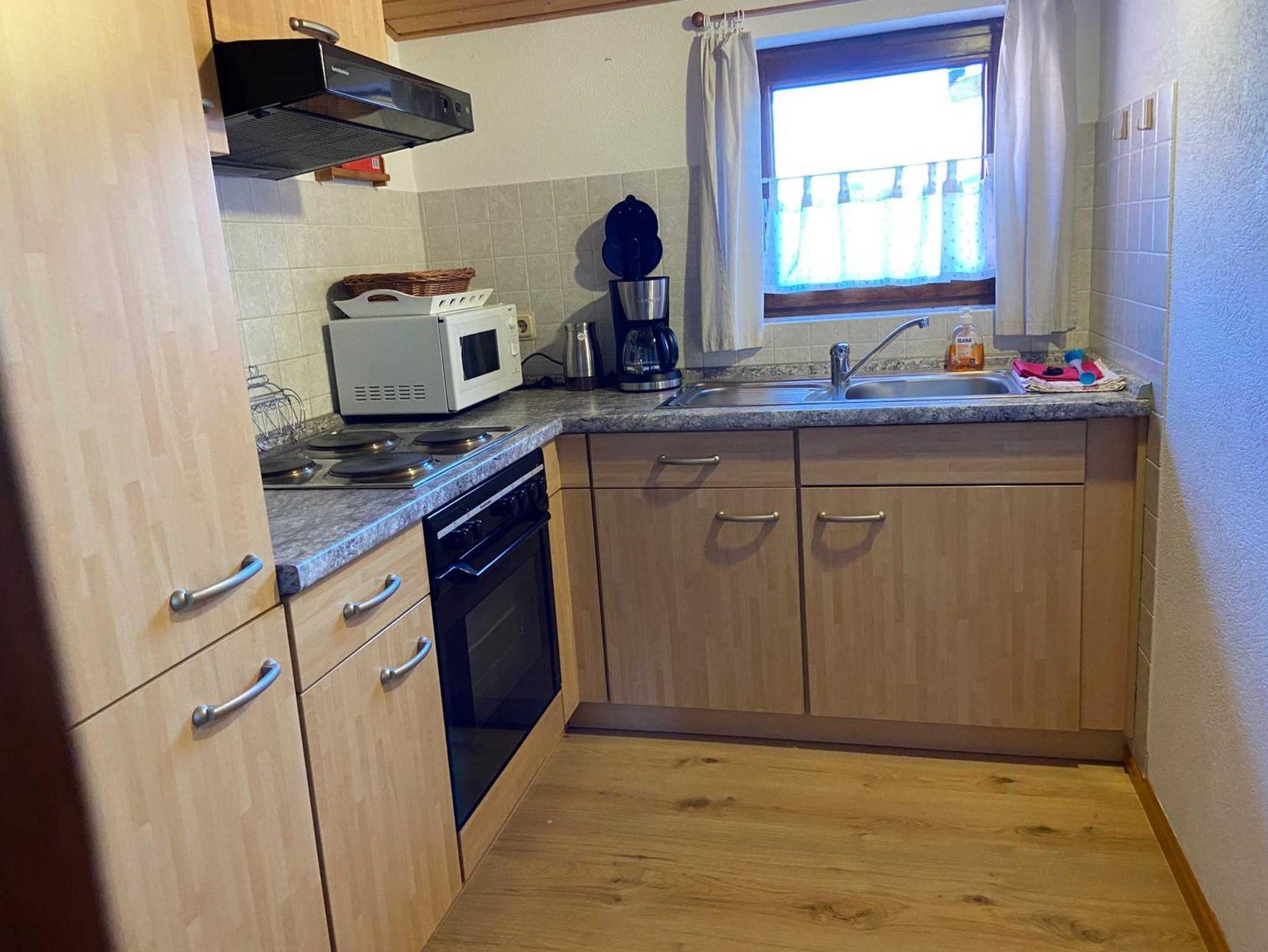- offener Wohn-Schlafraum mit Doppelbett und offener Küchenzeile mit Mikrowelle: Bettwäsche inklusive