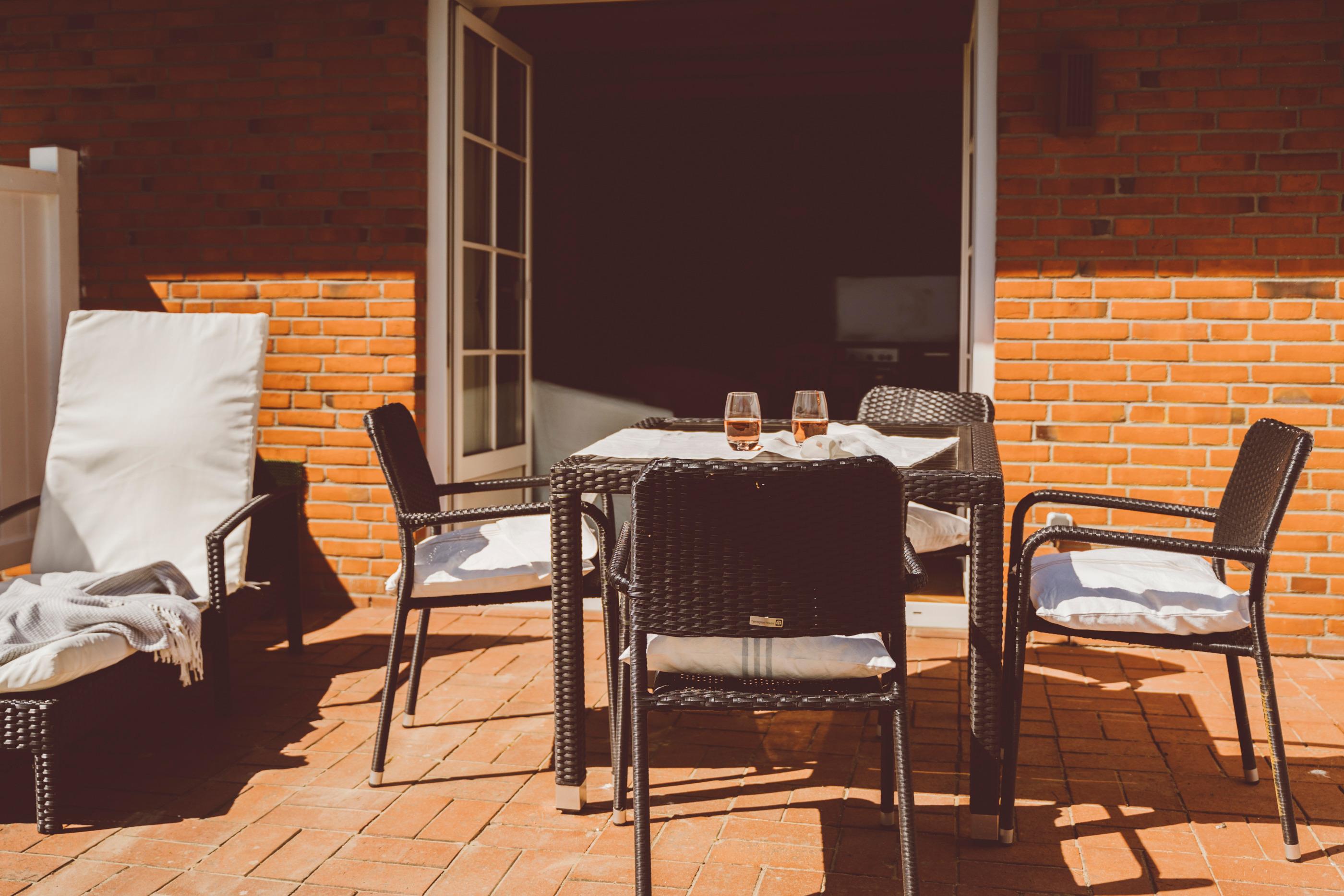 1 Terrasse mit Sitz- & Liegemöbeln & Grill