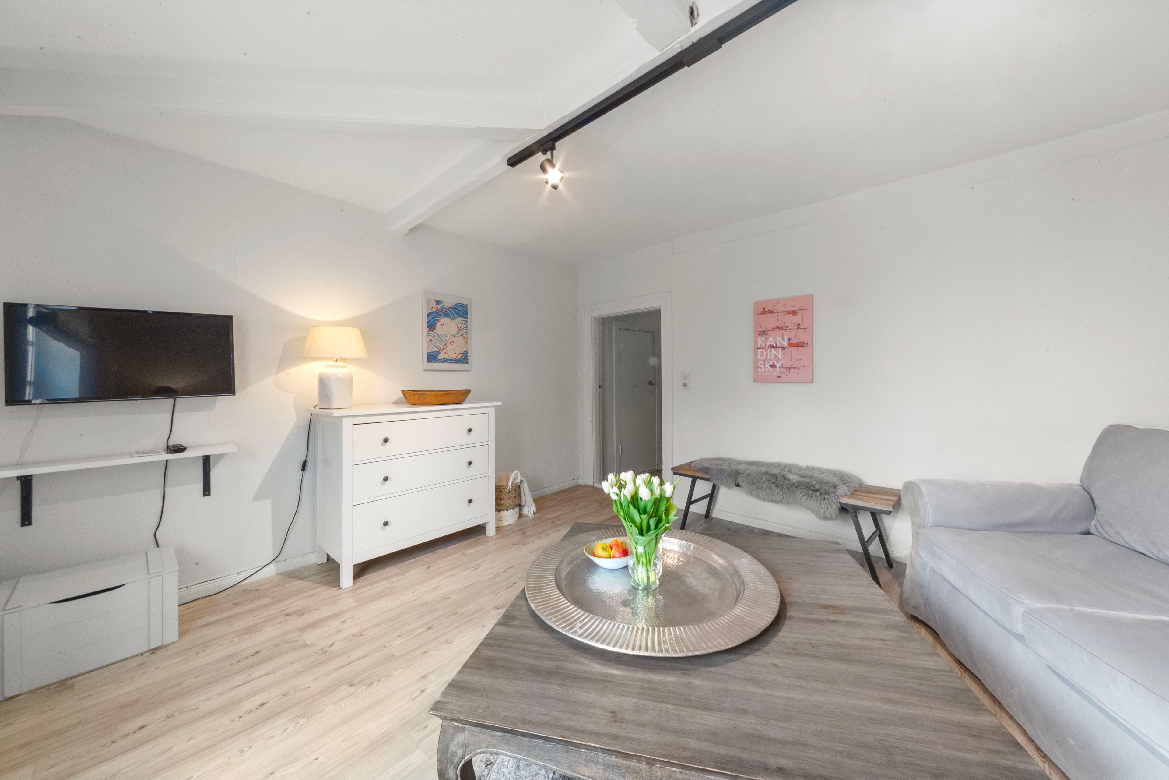 Wohnzimmer mit TV und gemütlichen Sitzmöglichkeiten