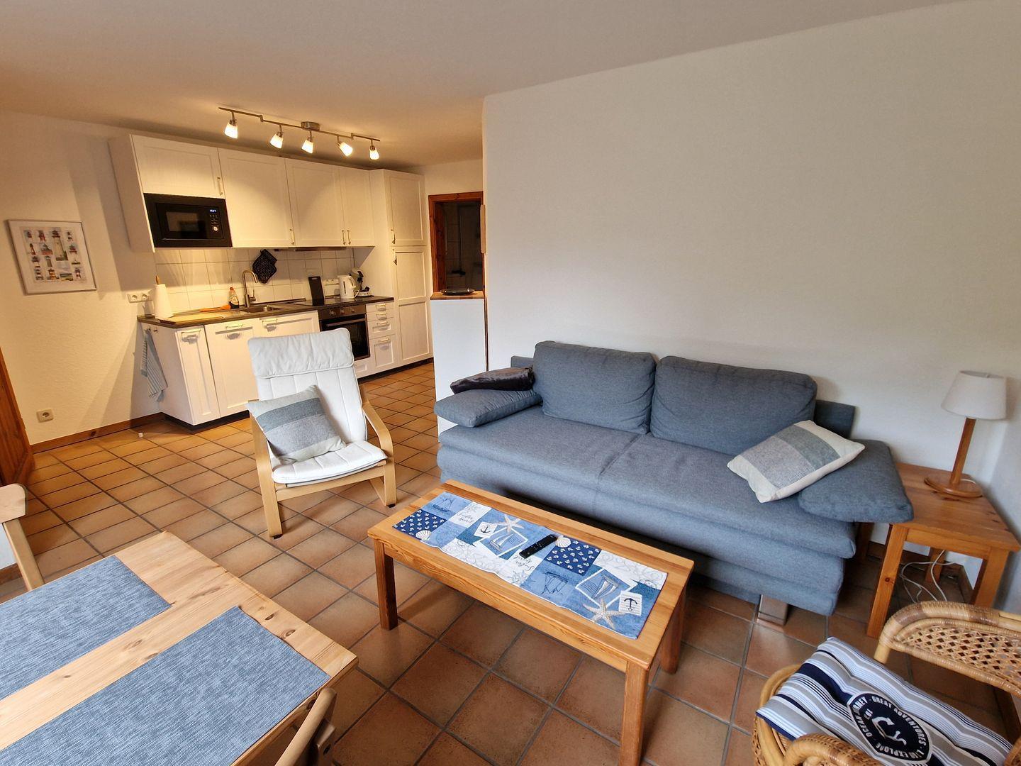 Der Wohnbereich ist stilvoll gestaltet und lädt nach einem Tag an der frischen Luft zum Ausruhen ein. Die offene Küchenzeile ist vollständig ausgestattet und bietet Ihnen die Möglichkeit, Ihre Lieblingsgerichte selbst zuzubereiten. Direkt angrenzend befindet sich ein gemütlicher Essbereich, der zum gemeinsamen Genießen einlädt.