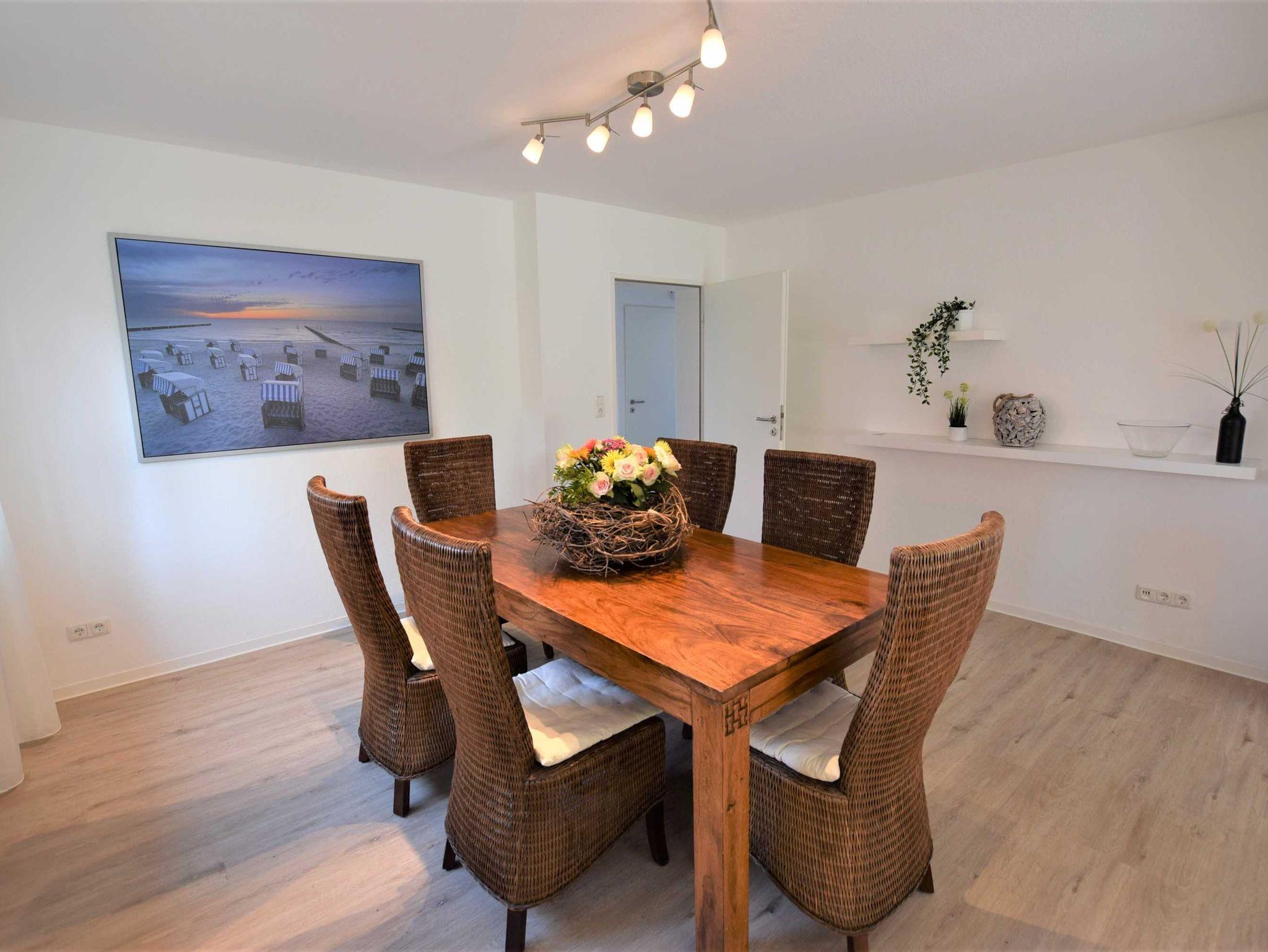 Die Wohnung für maximal 6 Personen (5. und 6. Person ist nur auf Anfrage mietbar) (90m ²) besteht aus einem Wohnzimmer mit Essbereich, einem Schlafzimmer mit Doppelbett, einem Schlafzimmer mit 2 jeweils ausziehbaren Einzelbetten, einer komplett ausgestatteten Küche, einem modernen Duschbad, einem separaten WC und einer sonnigen Terrasse inklusive Garten.