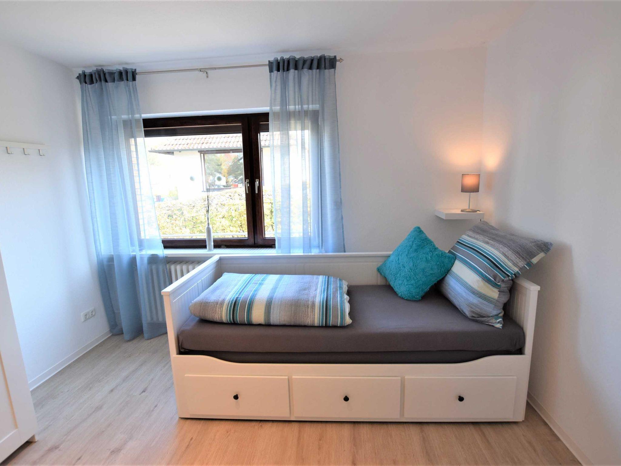 Die Ferienwohnung befindet sich in ruhiger Lage im Erdgeschoss eines freistehenden Hauses. Sie hat eine Größe von 90 m² und ist für bis zu 6 Personen ausgestattet (5. und 6. Person ist nur auf Anfrage buchbar): Wohnzimmer, Schlafzimmer mit Doppelbett, Schlafzimmer mit 2 ausziehbaren Einzelbetten, Duschbad mit WC, Gäste-WC, komplett ausgestattete Küche mit Essplatz, Terrasse und Garten mit Gartenmöbeln.