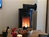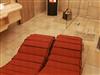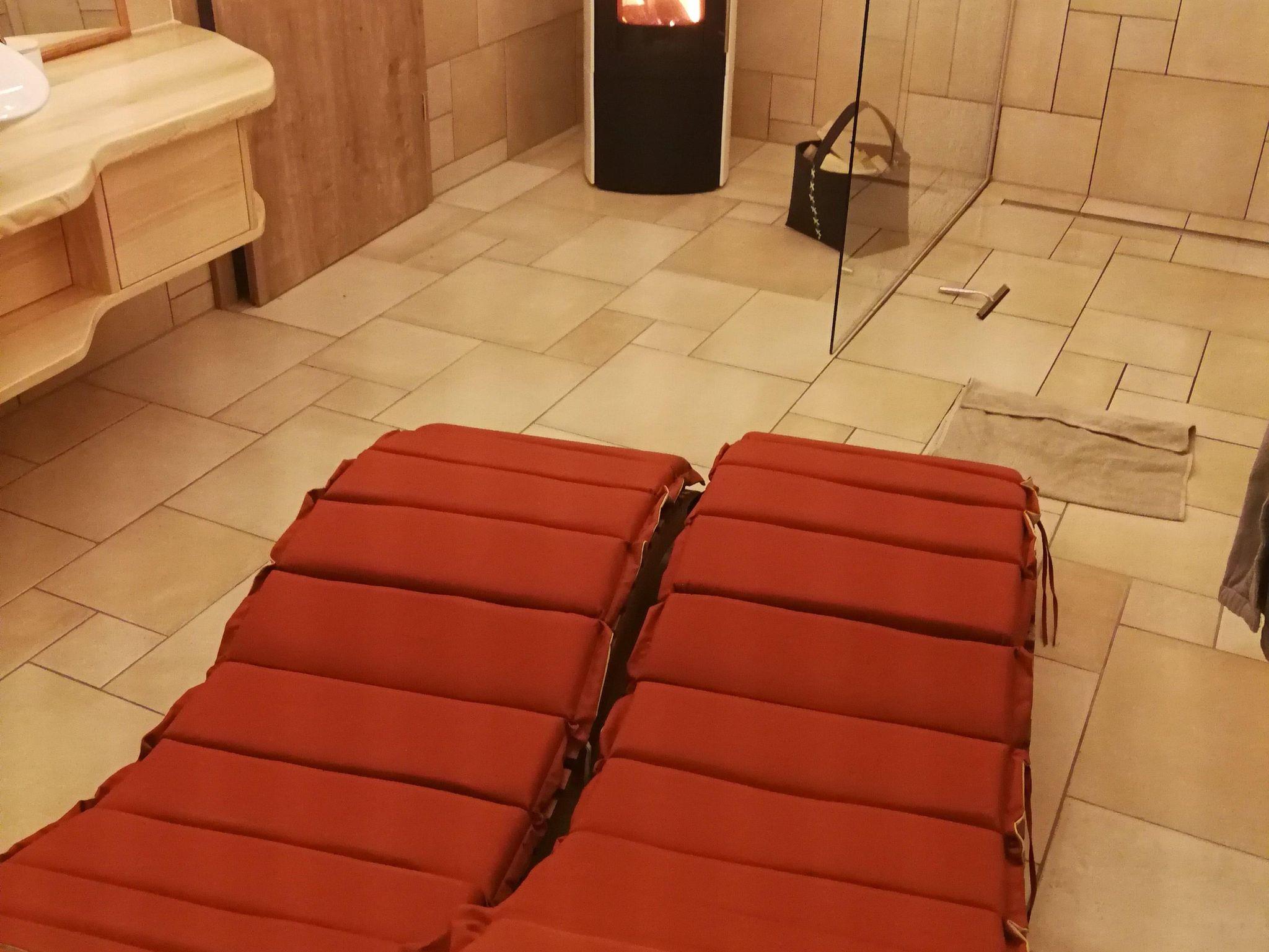 Ein Badezimmer mit Balkontür, Sauna, Saunaliegen, Kamin, ebenerdige Dusche, Handtuchheizkörper, Fön, Handtücher