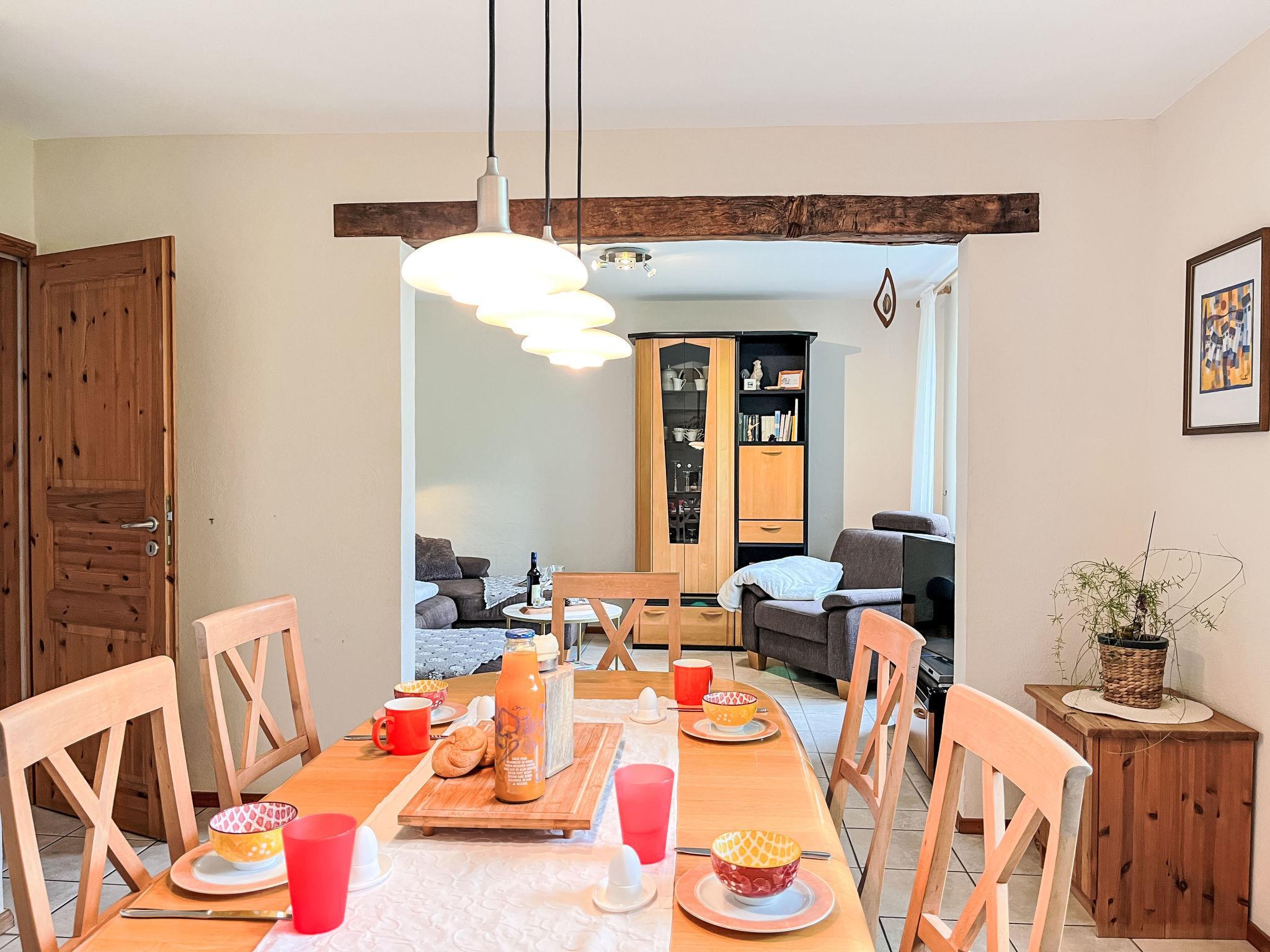 "Gerberhaus", 4-Zimmer-Haus auf 3 Stockwerken. Objekt geeignet für 6 Erwachsene + 1 Kind. Gemütlich eingerichtet: unteres Geschoss: 1 Zimmer mit 1 Doppelbett (2 x 90 cm, Länge 200 cm), Dusche/WC. Obergeschoss: Wohn-/Esszimmer mit Esstisch und Sat-TV (Flachbildschirm), Radio. Wohnküche (Backofen, Geschirrspüler, 4 Glaskeramikplatten, Toaster, Wasserkocher, Tiefkühler, elektrische Kaffeemaschine, Kombinationsmikrowelle) mit Durchreiche. Ausgang zur Terrasse. 2. Obergeschoss: 1 Zimmer mit 1 Bett (90 cm, Länge 100 cm), 1 Doppelbett (2 x 90 cm, Länge 200 cm). 1 Zimmer mit 1 Doppelbett (2 x 90 cm, Länge 200 cm). Ausgang zum Balkon. Bad/Dusche/WC. Heizung. Grosse Terrasse. Terrassenmöbel, Gartengrill, Abstellkammer. Zur Verfügung: Waschmaschine (extra). Wickelkommode. Internet (WLAN, gratis). Bitte beachten: Nichtraucher-Haus. Rauchmelder.