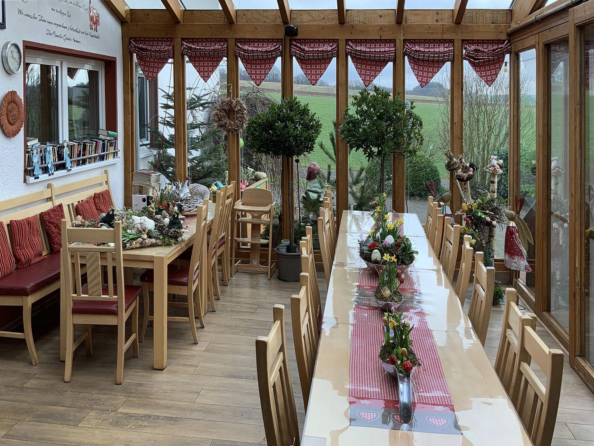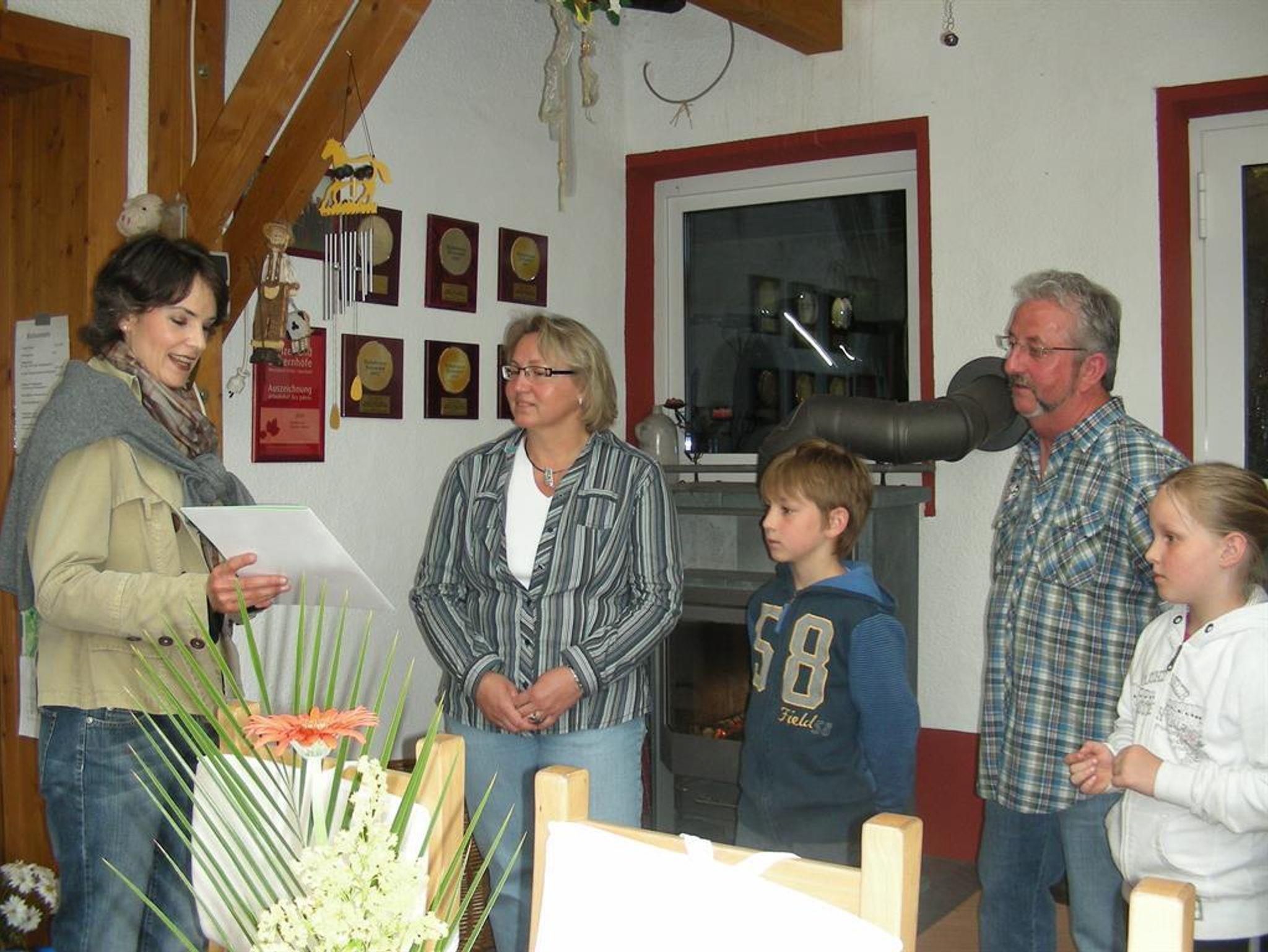 Modern geführter Vollerwerbs-Bauernhof in ruhiger, idyllischer Einzellage umgeben von Wald und Wiesen mit vielen Tieren zum Anfassen und Streicheln (Kühe, Pferde und Kleintiere). Zum Übernachten bieten wir Ihnen 4 Ferienwohnungen und 4 Familienzimmer, ideal für Familien, Reiter- und Wandergruppen, sowie Radfahrer. Aufenthaltsraum, Wintergarten,Gemeinschaftsküche für die Gäste von den Gästezimmern (Familienzimmer), Grillplatz mit Hütte und Sitzgruppen, Spielplatz und vieles mehr steht Ihnen für Ihren Urlaub zur Verfügung.Trampolin, viele Kinderfahrzeuge, Heuburg zum Toben, Frühstücksbuffet für die Gäste in den Gästezimmern überwiegend aus hofeigenen Produkten.