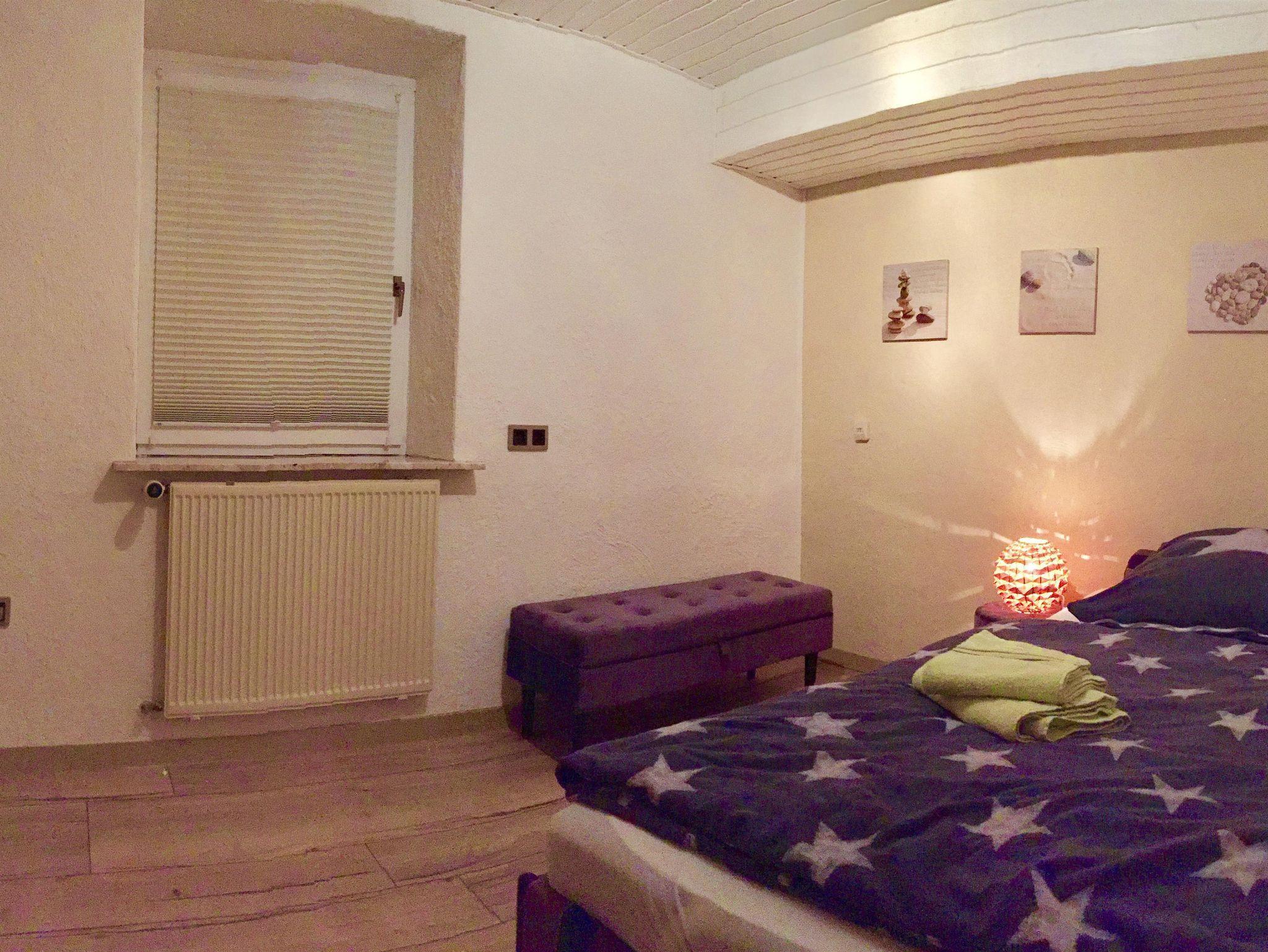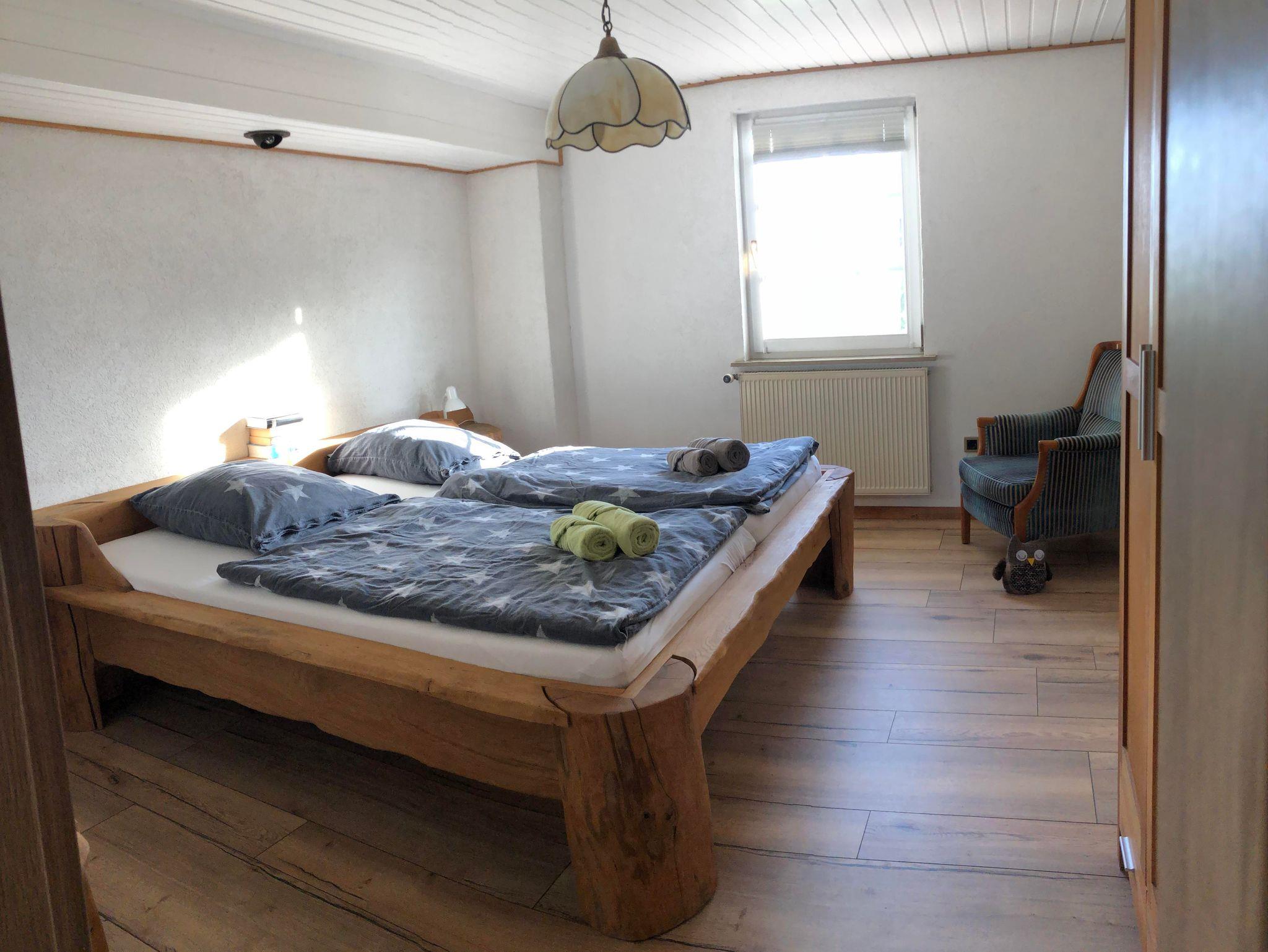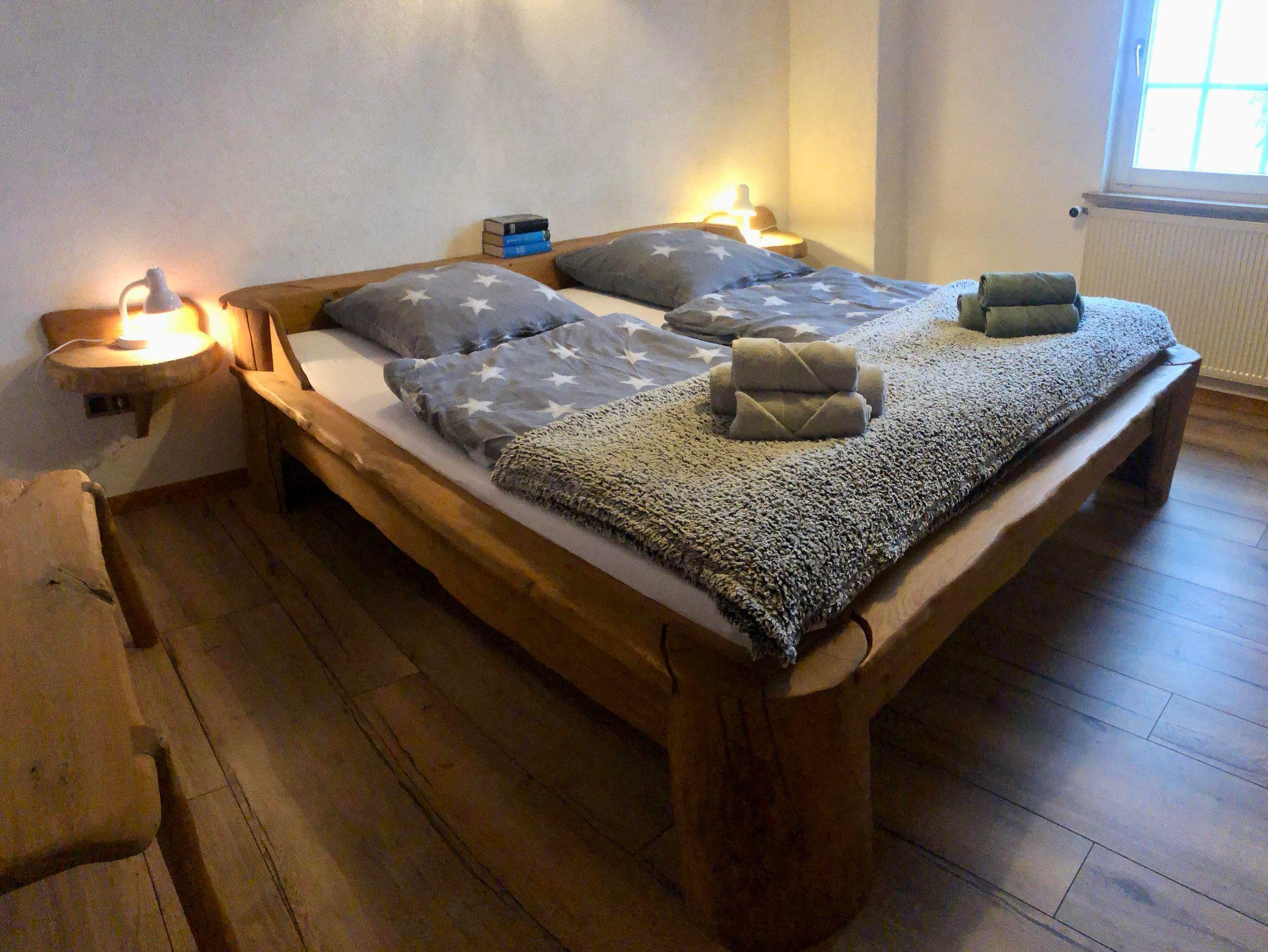 Über eine Buchentreppe mit 12 Stufen geht's zu den drei Schlafräumen (1 Doppelbettzimmer und zwei 2-Bett-Zimmer) und dem zweiten Bad mit Dusche/WC. Die absolut ruhige Alleinlage gibt Raum zum Erholen und Natur genießen.