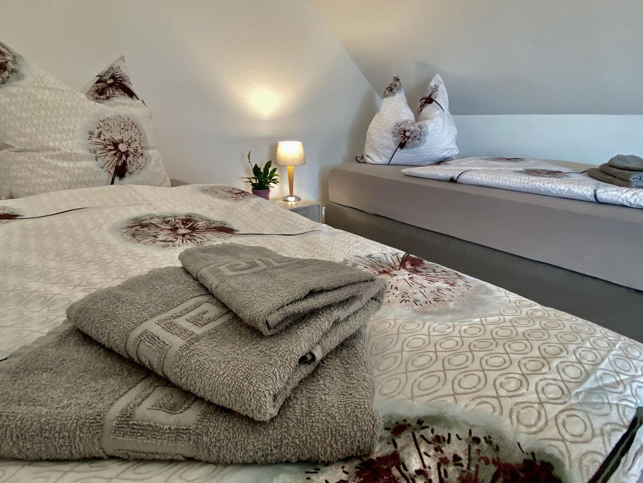 Im Obergeschoss finden Sie zwei Schlafzimmer als auch ein Badezimmer mit Dusche und Badewanne. Im Untergeschoss befindet sich das dritte Schlafzimmer mit eigenem Badezimmer.