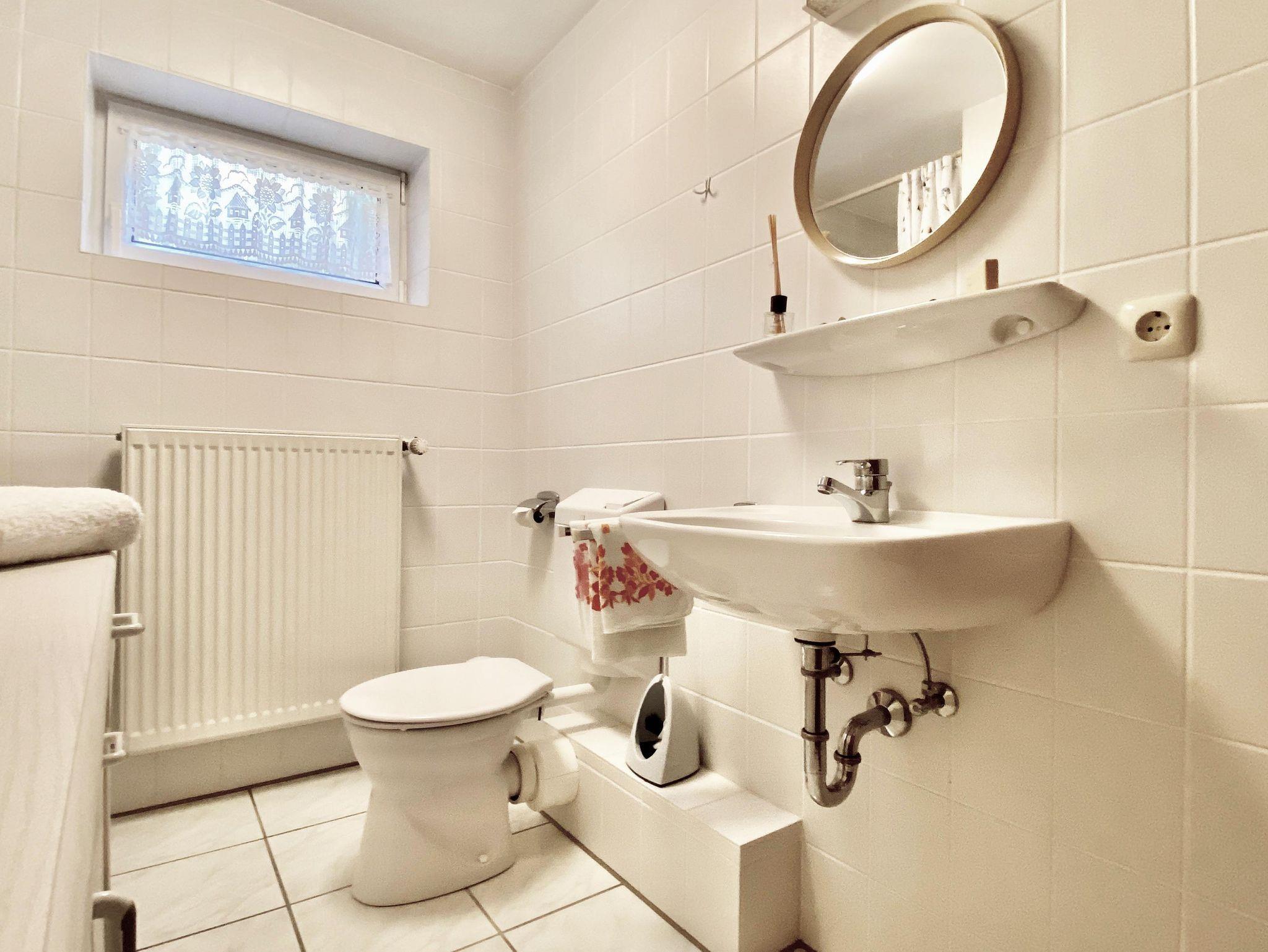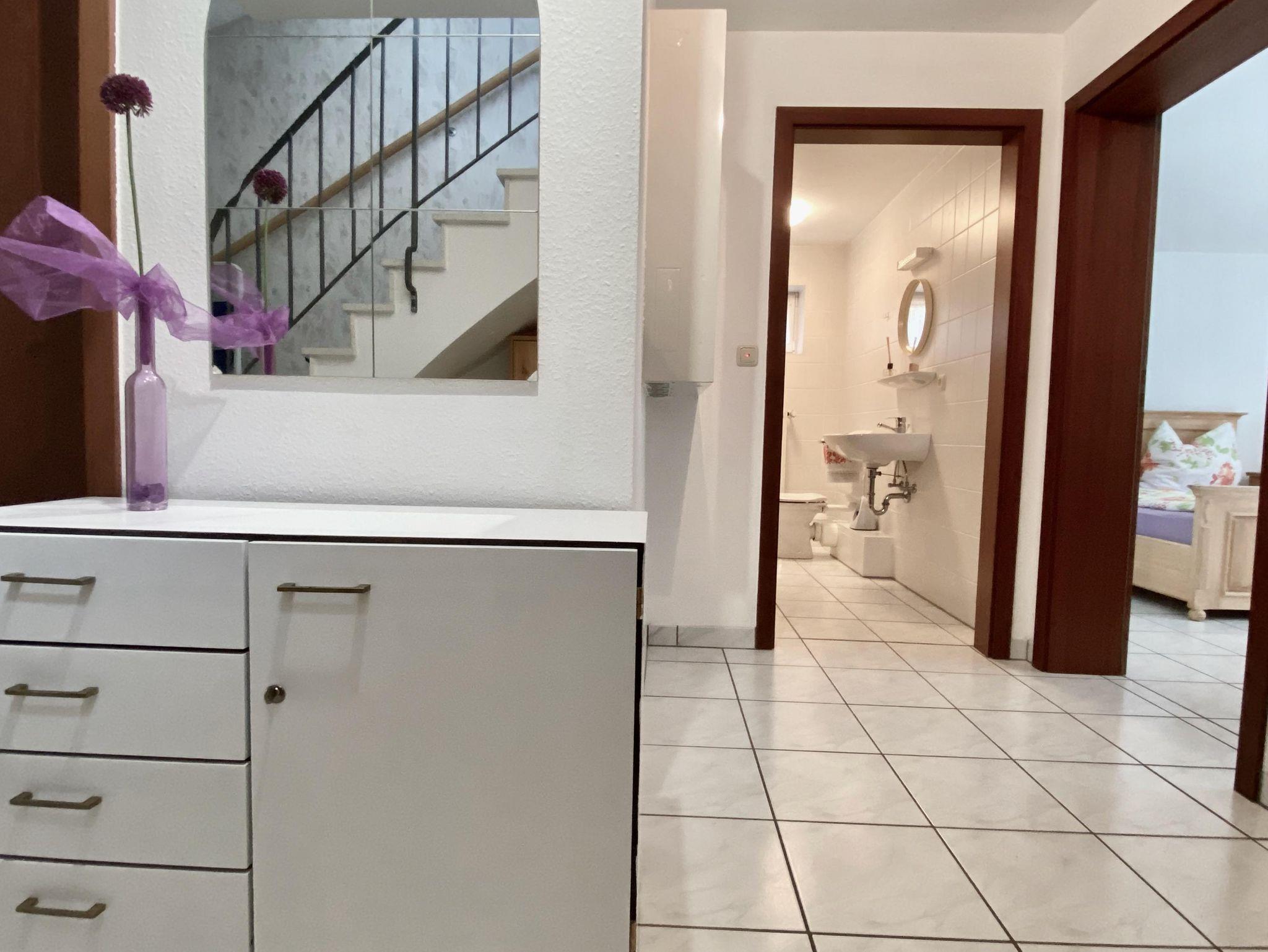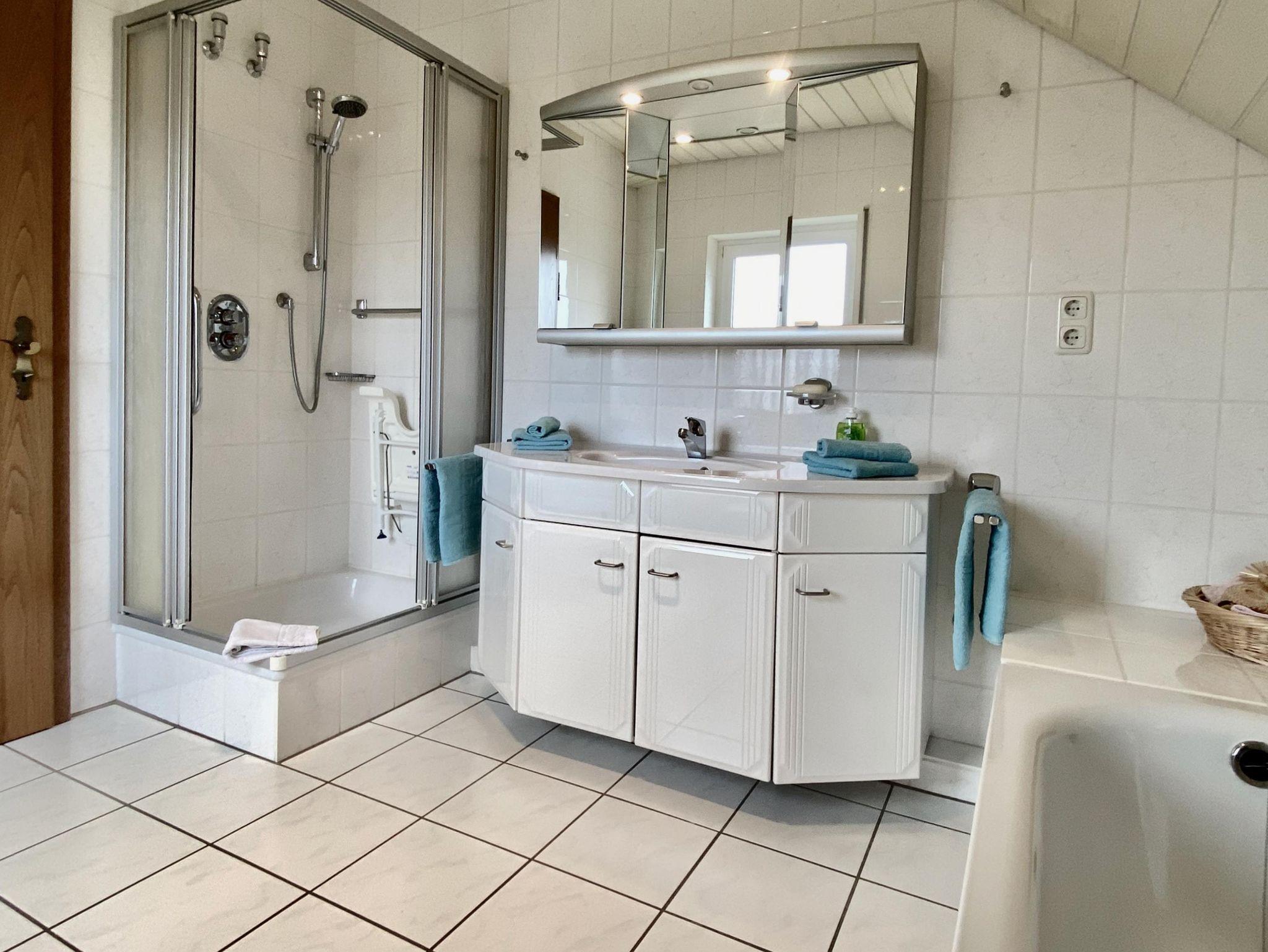 Im Obergeschoss finden Sie zwei Schlafzimmer als auch ein Badezimmer mit Dusche und Badewanne.