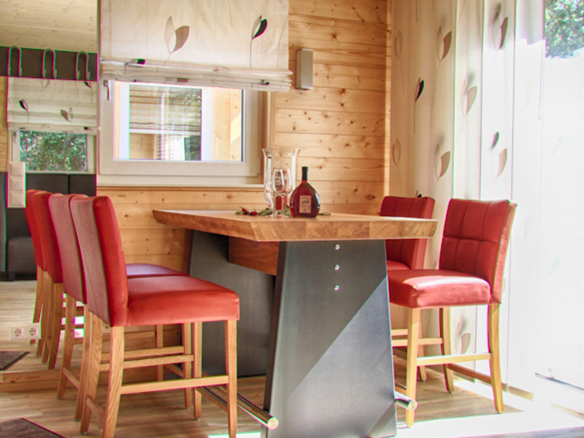 Direkt am Wald liegend befindet sich das Haus An der Holzspitz. Das Ferienhaus bietet auf 70 m² Platz für bis zu 5 Personen. Im Baumschatten auf der Holzterrasse können Sie bei einem leckeren Frühstück den Sonnenaufgang genießen. Das Schmuckstück des Hauses ist der erhöhte rustikale Esstisch, der mit seiner Fußstange ein tolles Sitzerlebnis bietet. Die Bäder sind in rot und braun gehalten und die Betten in Überlänge lassen Sie traumhafte Nächte erleben. Das WLAN und den Parkplatz können Sie gerne kostenfrei nutzen.