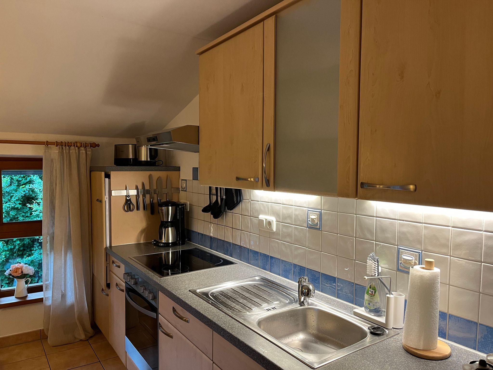 voll ausgestattete Küche und einen Balkon mit Gartenblick.