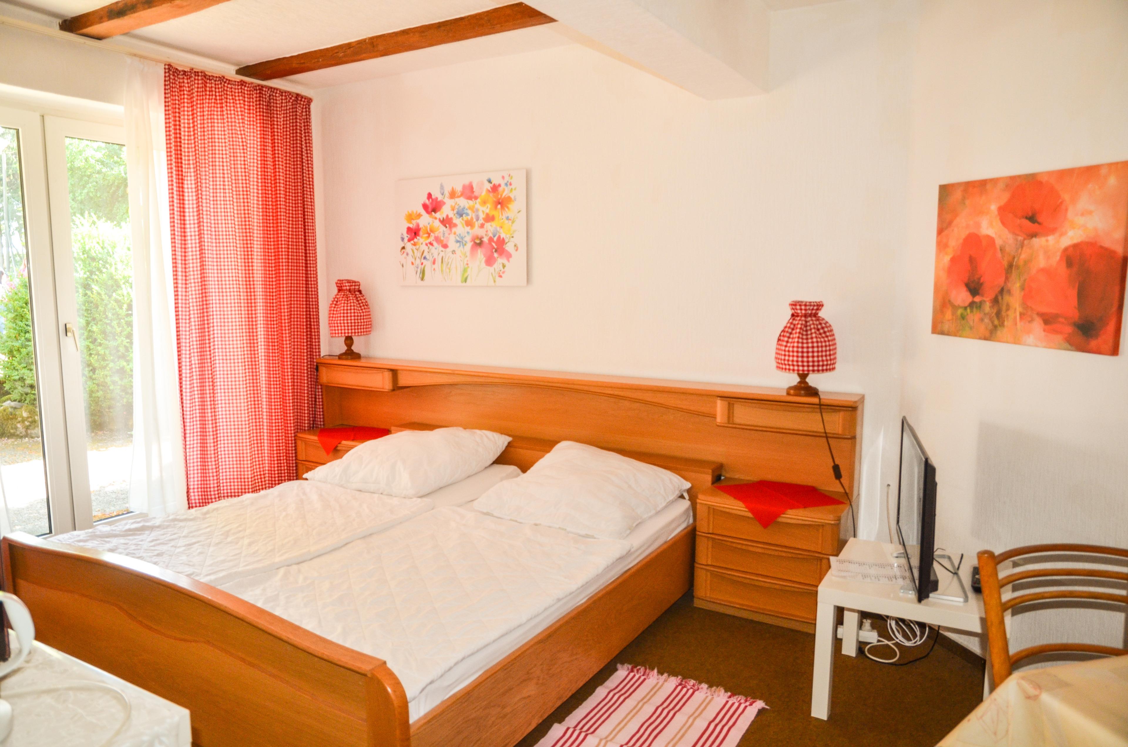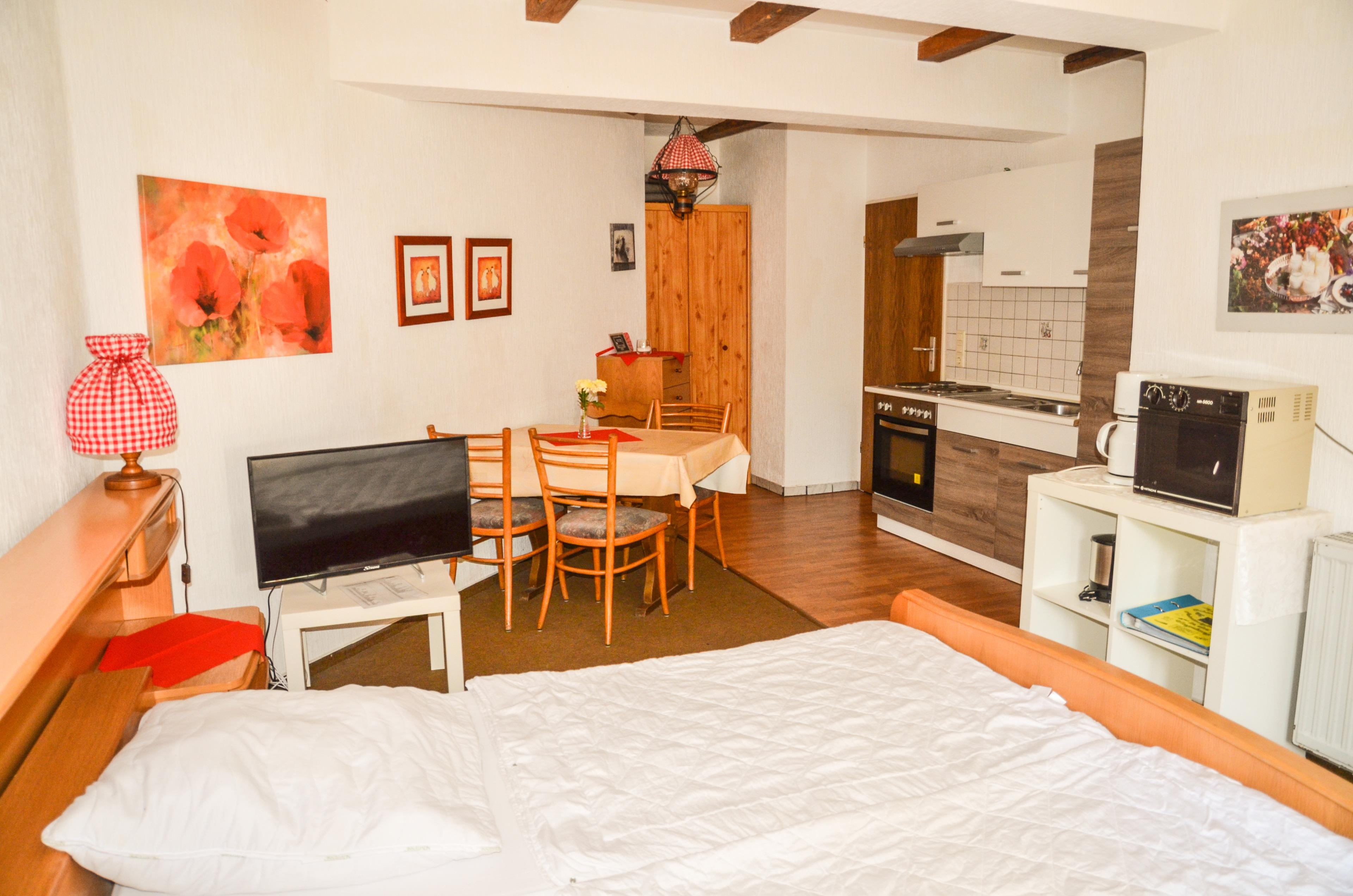 Zweckmäßig eingerichtete Ferienwohnung ca. 50 qm, Wohnzimmer mit einfacher Küchenzeile und Doppelbett, ein Schlafraum mit Etagenbett, einem Einzelbett und Schlafsofa. Lage: Erdgeschoss. Terrasse mit Sitzmöglichkeiten.